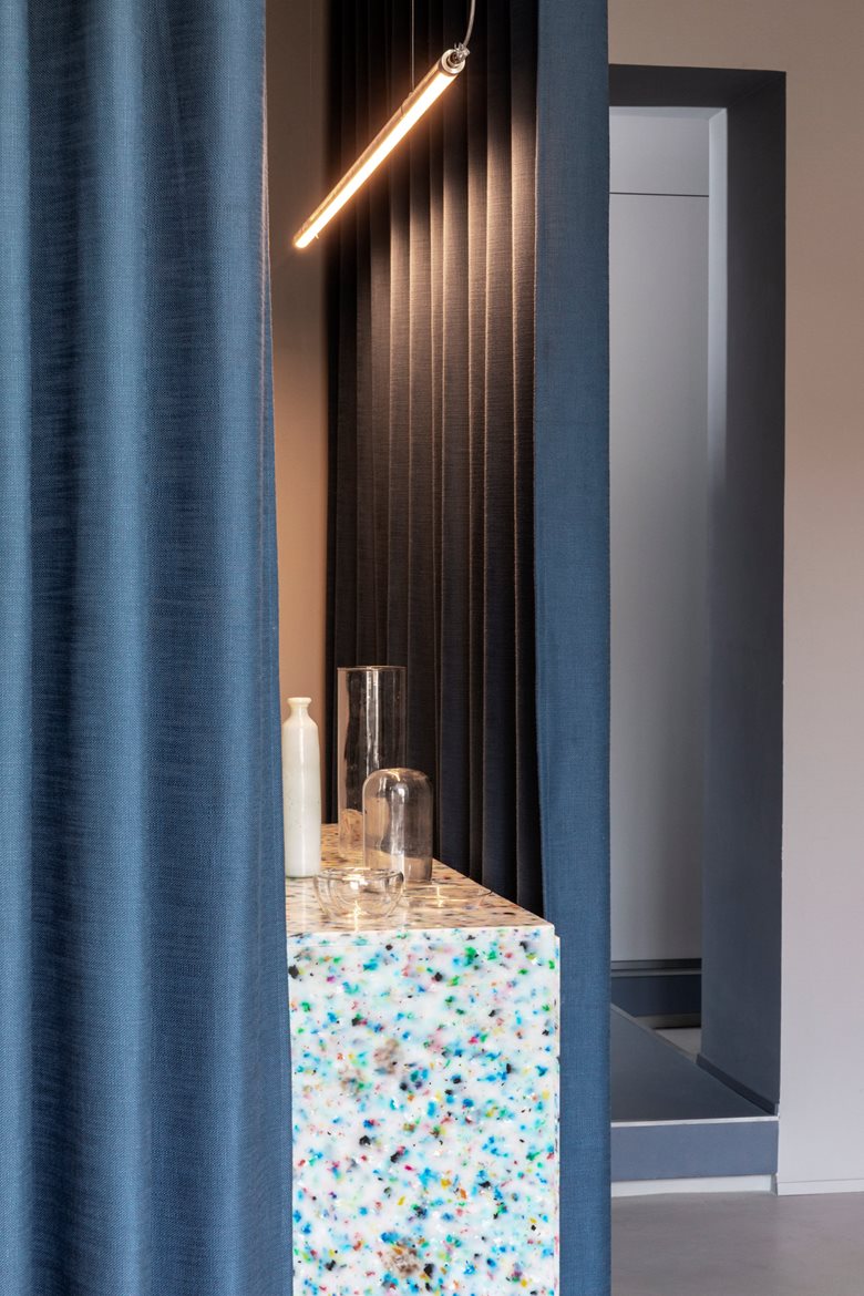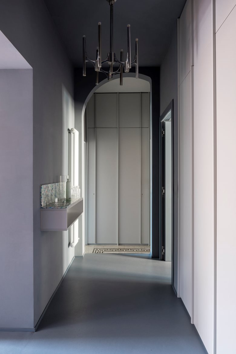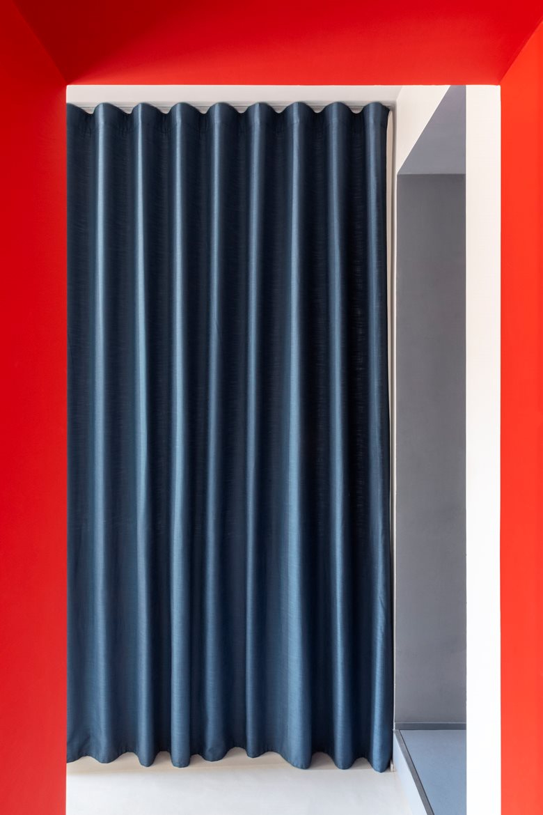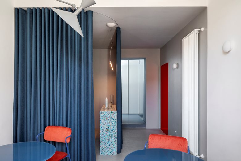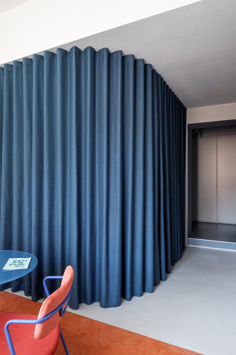 L’ingresso comune – tinteggiato in un blu-grigio avvolgente anche sul soffitto – distribuisce i principali ambienti del b&b. Qui si affacciano la sala comune con cucina e colazione, definita da una tenda curva scultorea che, aprendosi o chiudendosi, trasforma la spazialità, nascondendo l’angolo cottura.