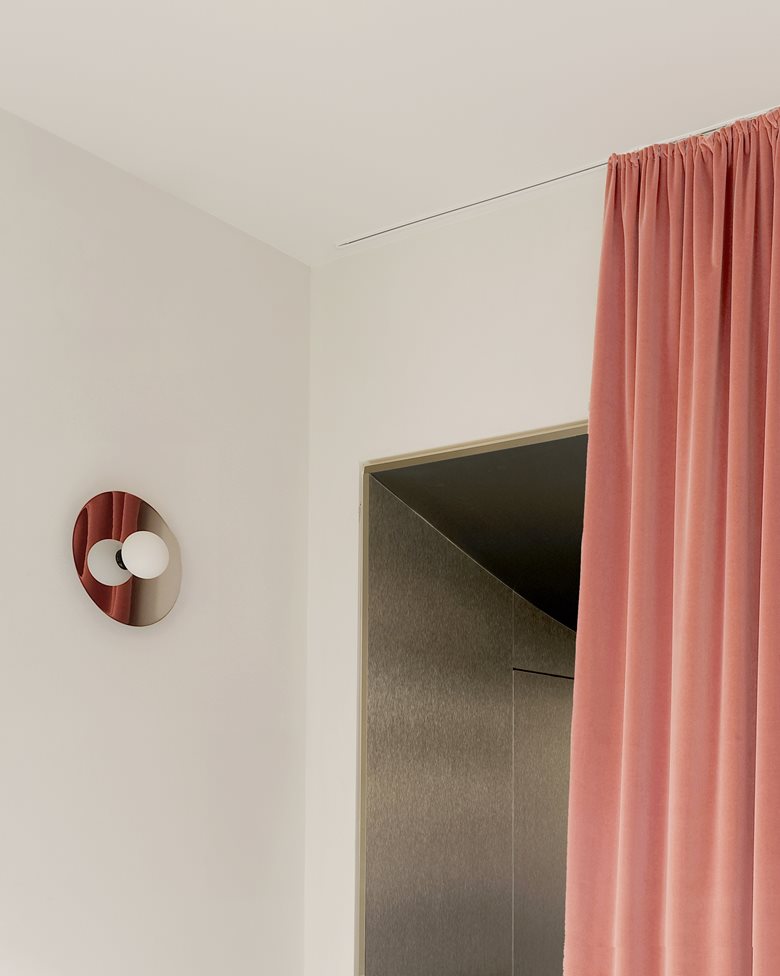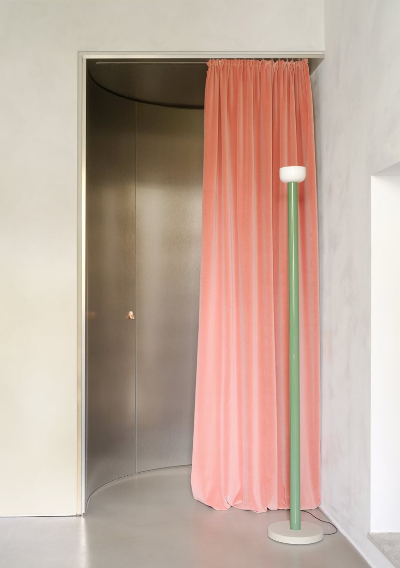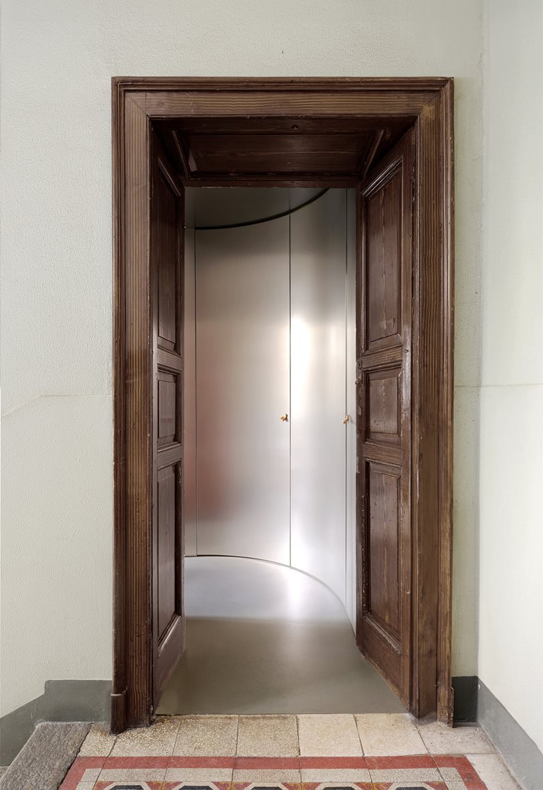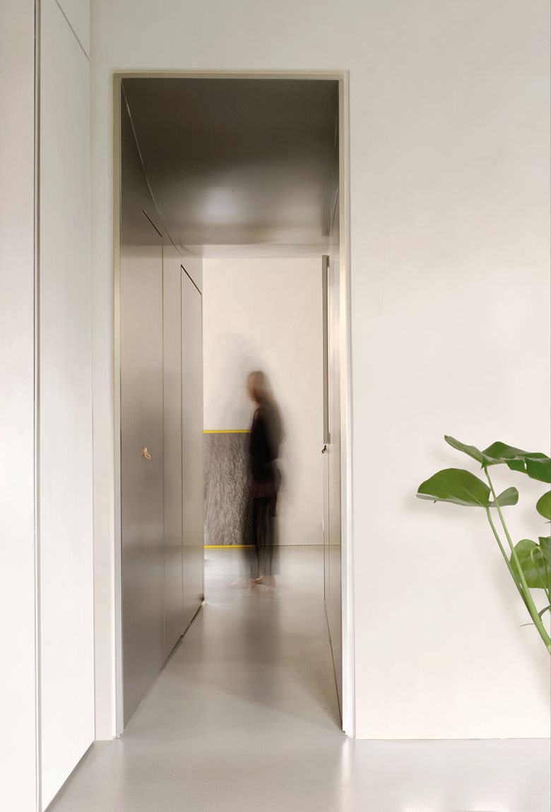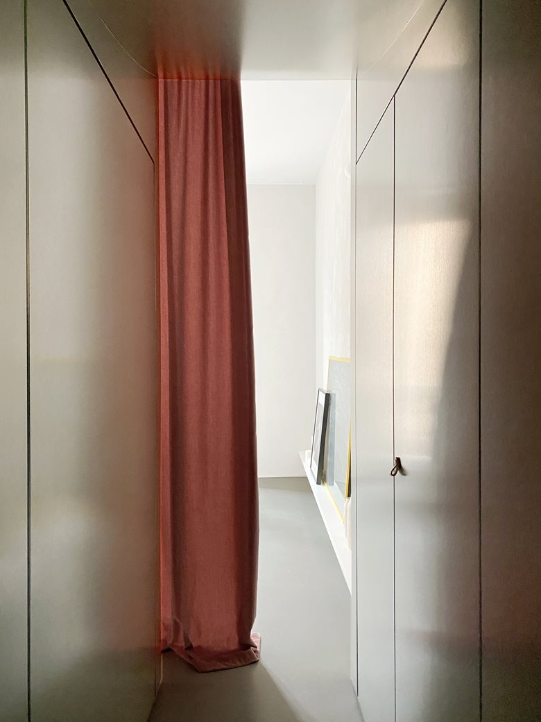 Il corridoio è schermato da una tenda colorata che funge da elemento di filtro, mentre l'acciaio inox riveste ingresso e disimpegno, moltiplicando riflessi e profondità. La materia diventa così strumento percettivo: camuffa, rimanda, dilata. A contrasto, le pareti grigie dalla texture morbida e il pavimento in resina cementizia disegnano un involucro uniforme e tattile, animato da accenti cromatici calibrati nelle tende e nelle chiusure della cucina.