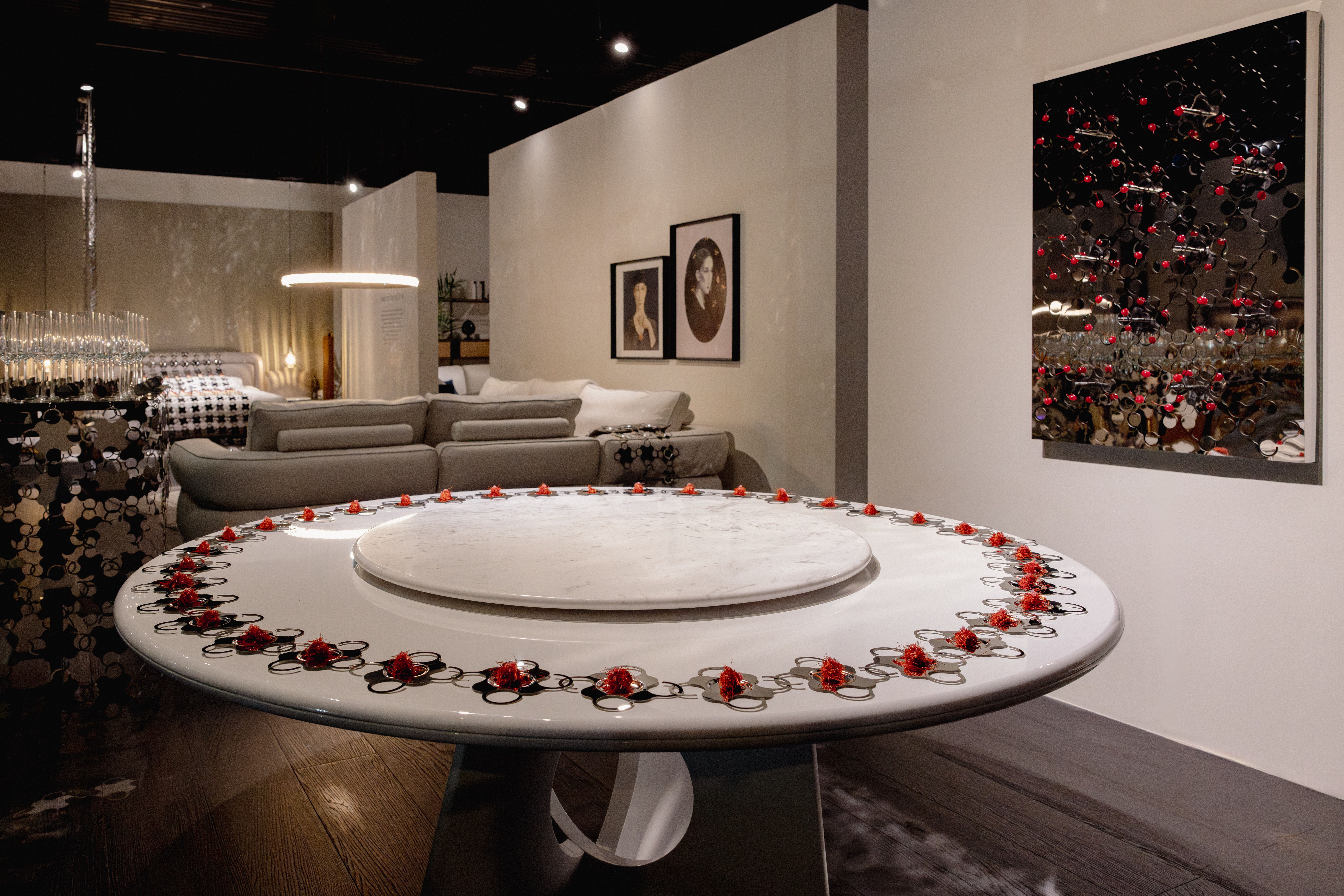 All’interno dello store trova spazio anche Habita, il nuovo progetto firmato da Mauro Lipparini pensato per abbracciare l’intera zona giorno con un linguaggio fatto di equilibrio, armonia e serenità. Il divano, dalle linee sinuose e avvolgenti, si distingue per i pannelli laterali imbottiti e per la piping perimetrale che ne accentua la silhouette, offrendo un comfort generoso e una modularità fluida capace di adattarsi a ogni ambiente. Completano il programma un tavolino dalla presenza scultorea e un tavolo da pranzo monolitico, interamente laccato lucido, definito da forme organiche e arricchito da una funzione girevole “lazy susan” che unisce gesto estetico e funzionalità.