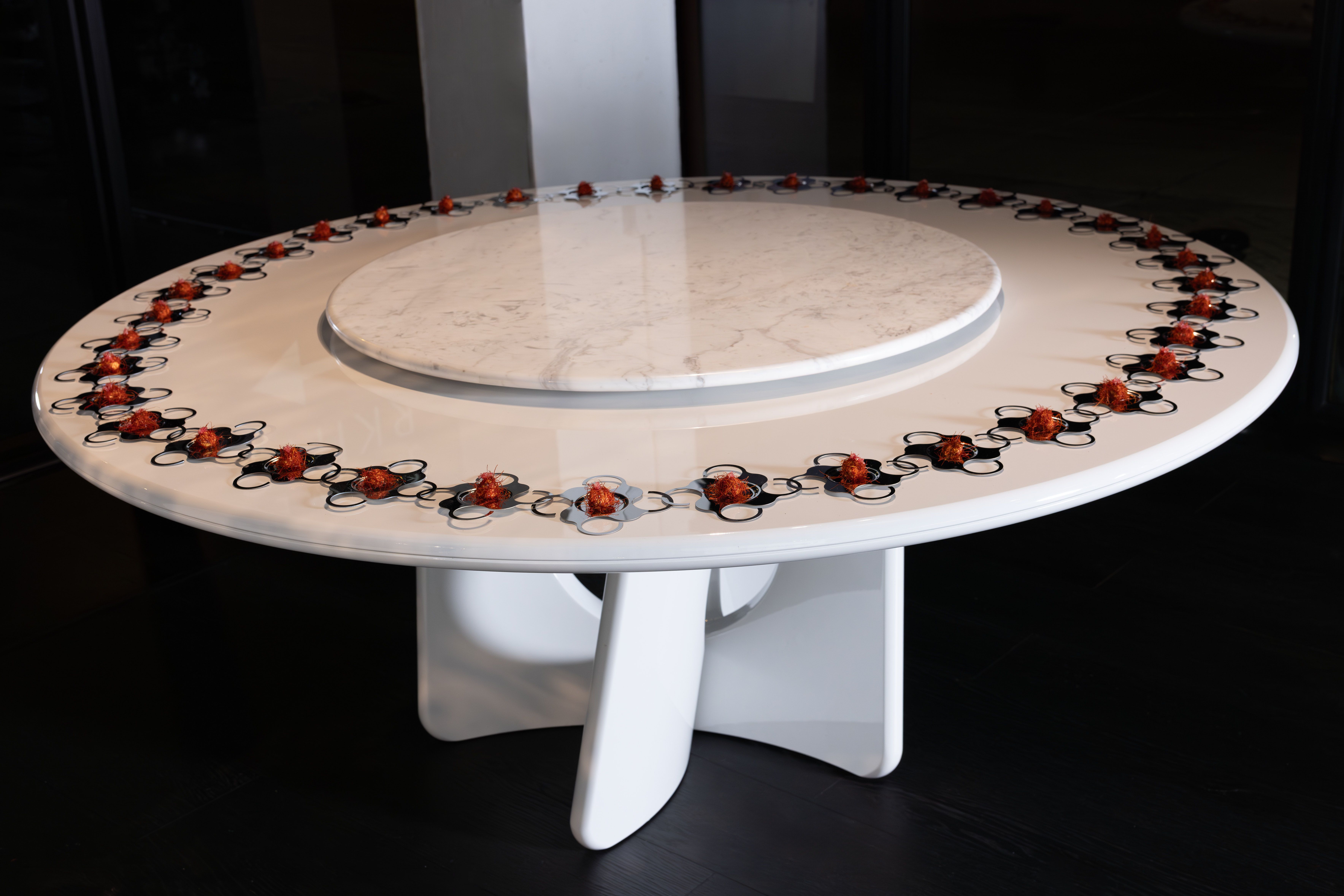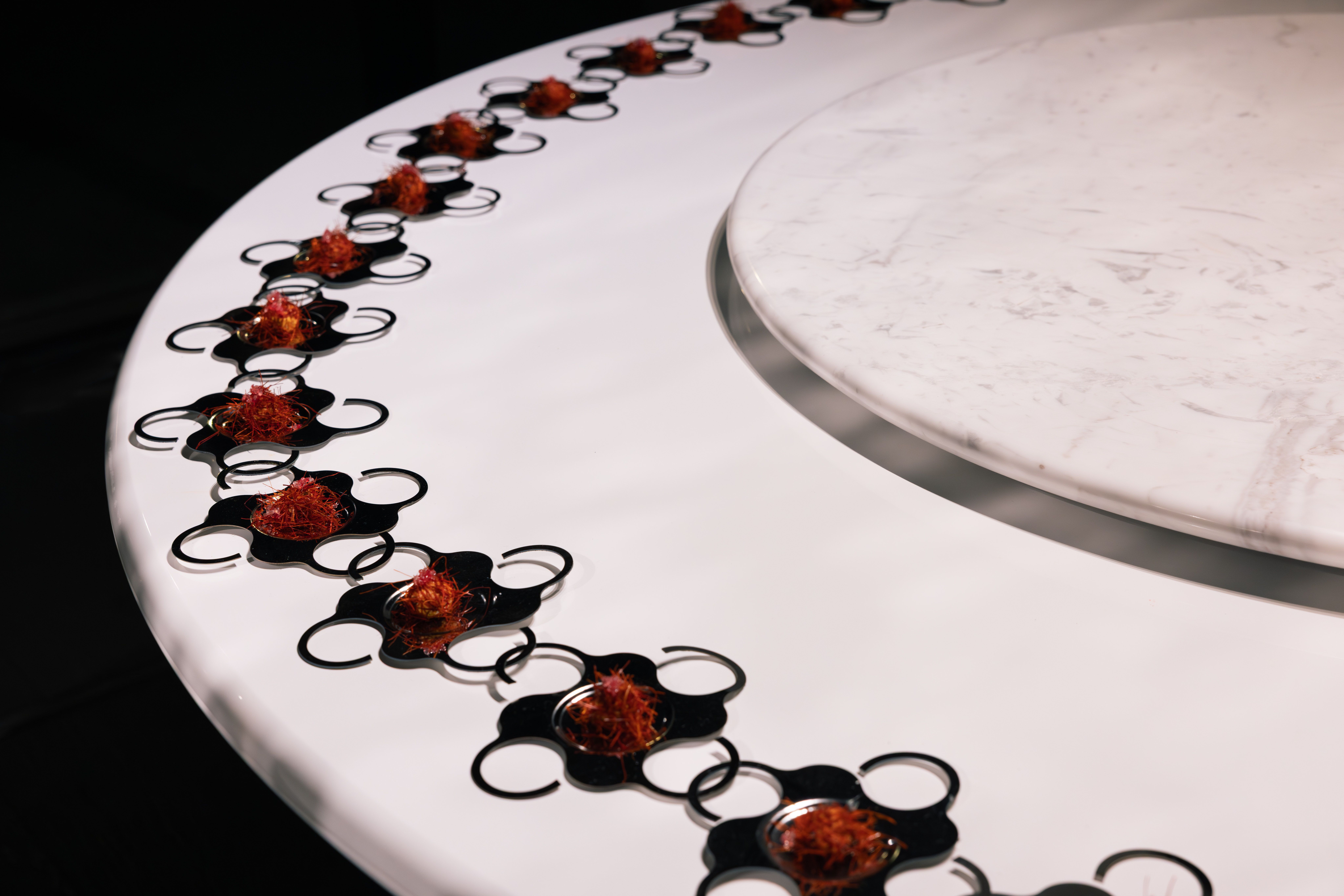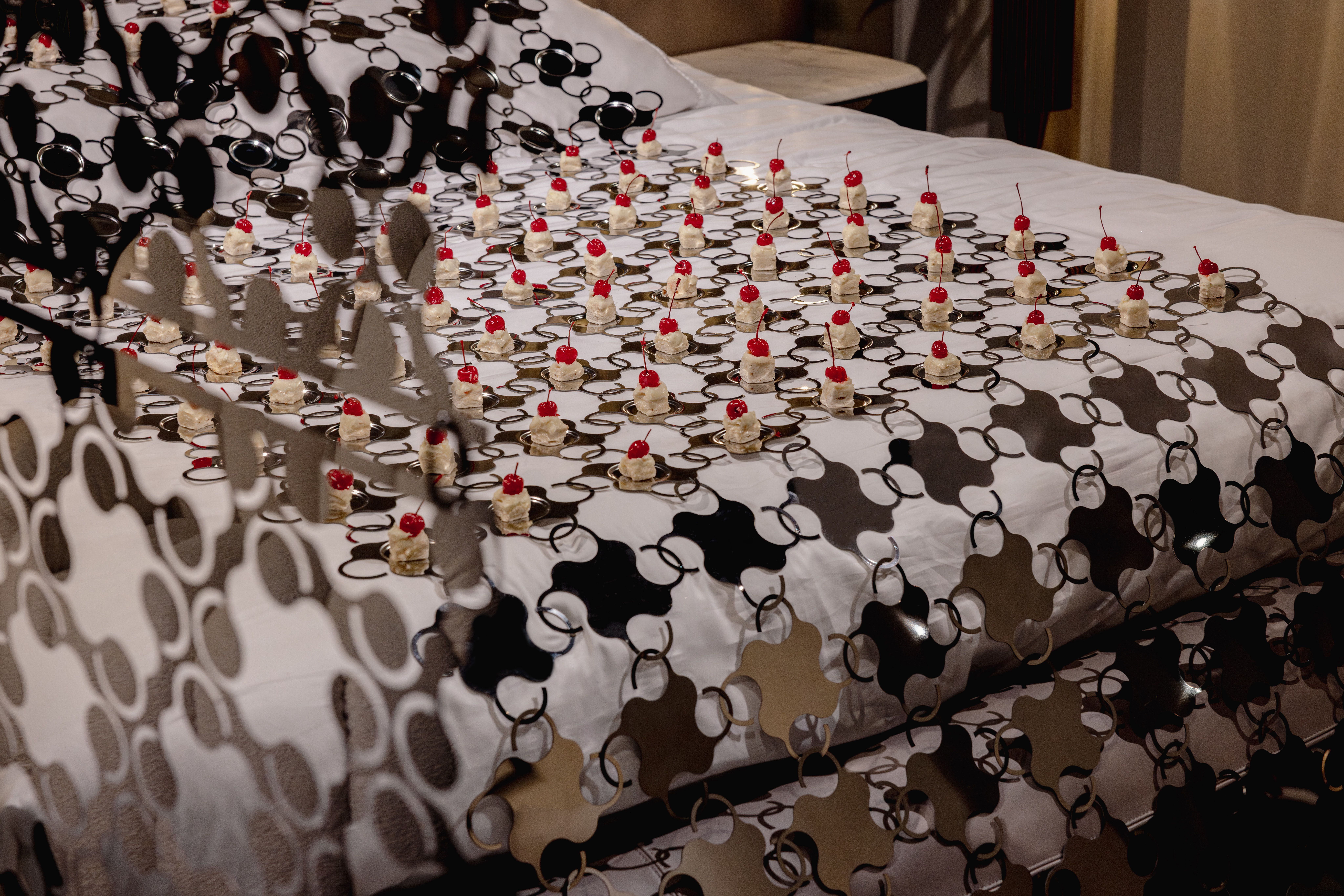 In questo contesto, il cibo celebra la convivialità come linguaggio universale che unisce culture, rituali e tradizioni. In un’ottica di sostenibilità, tutti i materiali sono valorizzati in un gesto circolare: i ritagli negativi delle lastre d’acciaio vengono riutilizzati per creare una cortina scultorea che incornicia l’ingresso dell’installazione, estendendo il linguaggio visivo dei pattern all’architettura dello spazio. I pattern in movimento ruotano lentamente con un movimento cinetico al centro dello showroom e lungo la parete posteriore, fungendo da punti focali che richiamano il ritmo e il rituale del mangiare insieme.