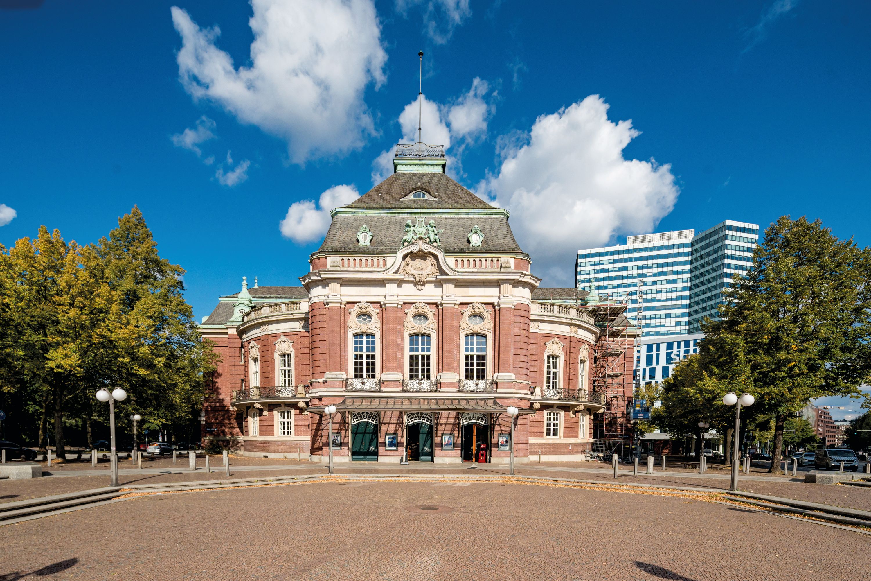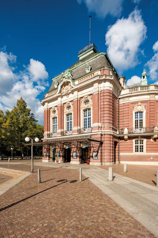 L’imponente edificio neobarocco, con la sua articolata facciata in arenaria, la cupola e i frontoni ricurvi, è arricchito da sculture in rame e ringhiere in ferro battuto con motivi botanici. All’interno, soffitti decorati in stucco, colonne in marmo e ricchi decori evocano l’atmosfera sontuosa dei teatri d’opera storici. La grande Hall, con circa 2.000 posti, è caratterizzata da palchi e balconate tipici dell’architettura teatrale barocca del XVIII secolo. Colpisce inoltre per i pannelli in legno bianco e oro, che non solo appaiono magnifici, ma garantiscono anche un’acustica eccellente.
