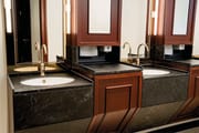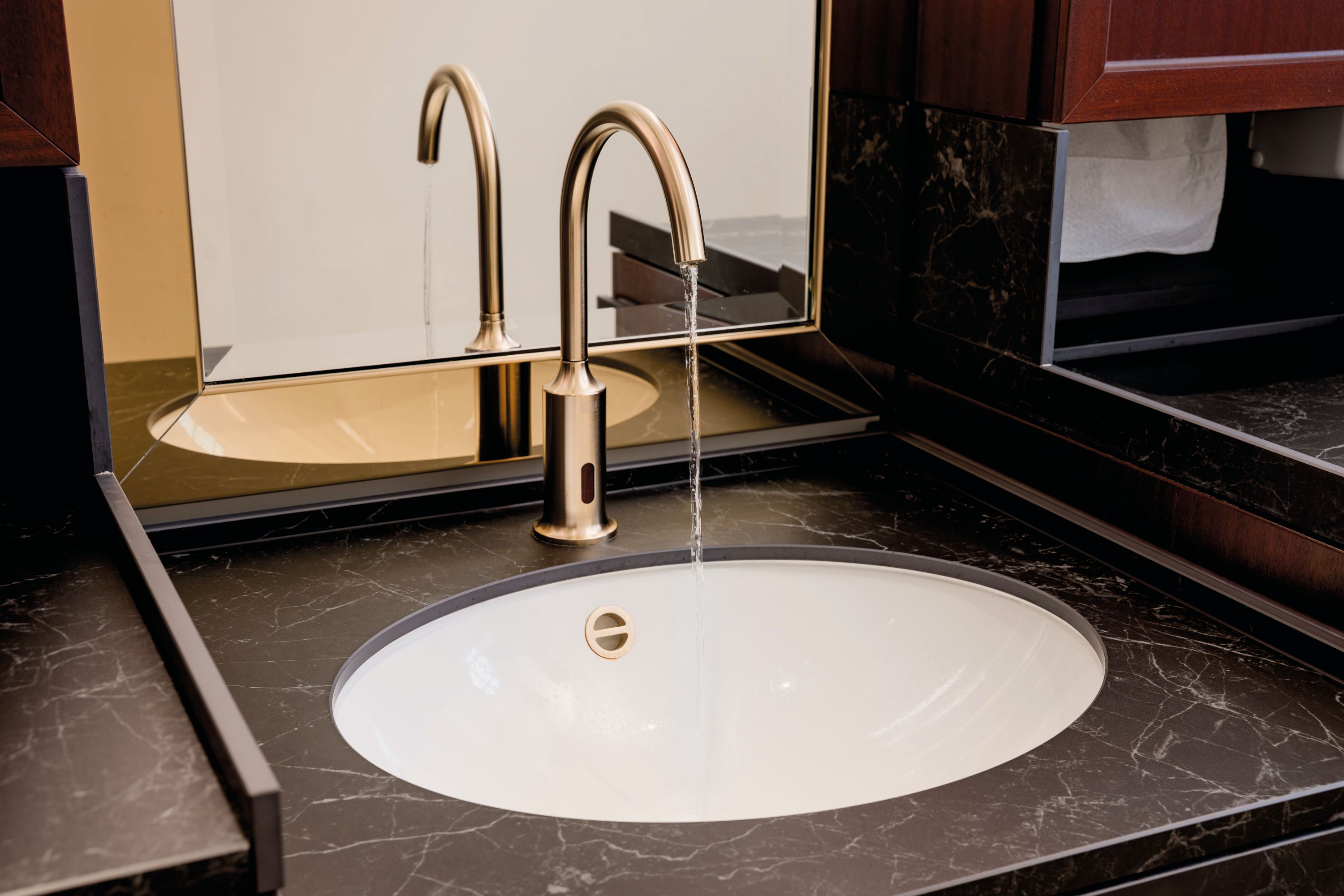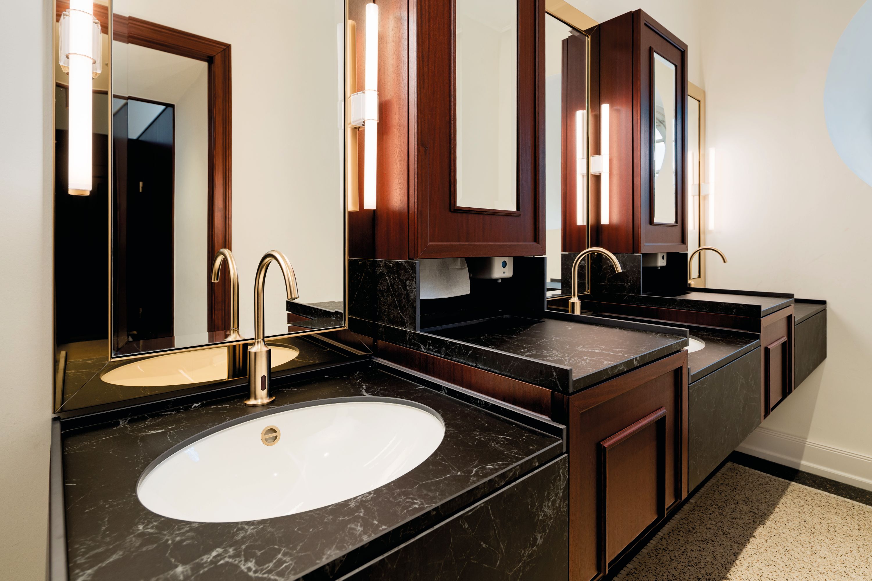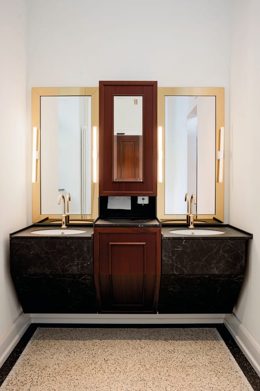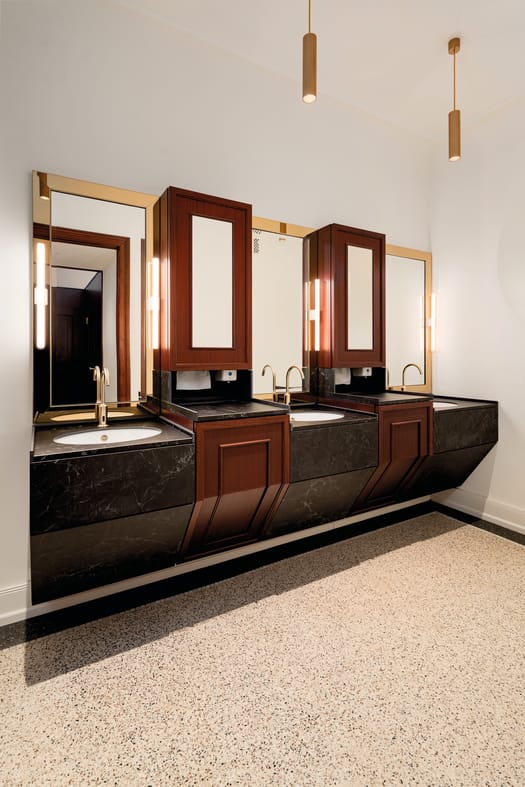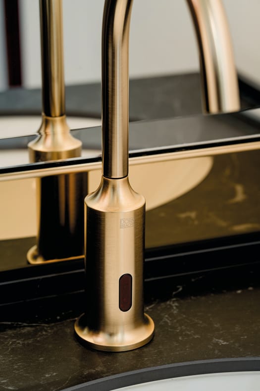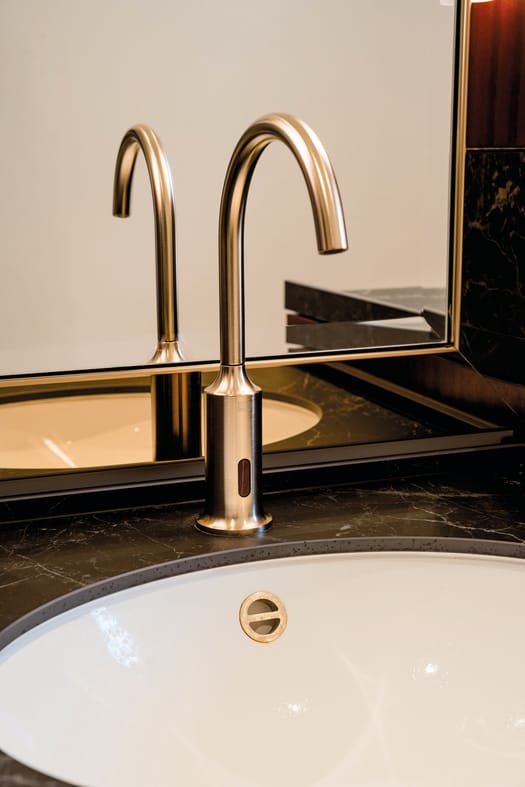 Uno dei principali interventi del progetto di modernizzazione è la riprogettazione e l’ampliamento dei servizi igienici aperti al pubblico. Marmo nero, legno scuro ed elementi dorati dialogano con l'estetica minimalista di Vaia Touchfree nella finitura Ottone spazzolato (Oro 23 kt). La versione touchless della rubinetteria Dornbracht include la tecnologia a infrarossi, che assicura un elevato livello di igiene e contribuisce al risparmio idrico – ed è quindi particolarmente indicata per aree pubbliche.