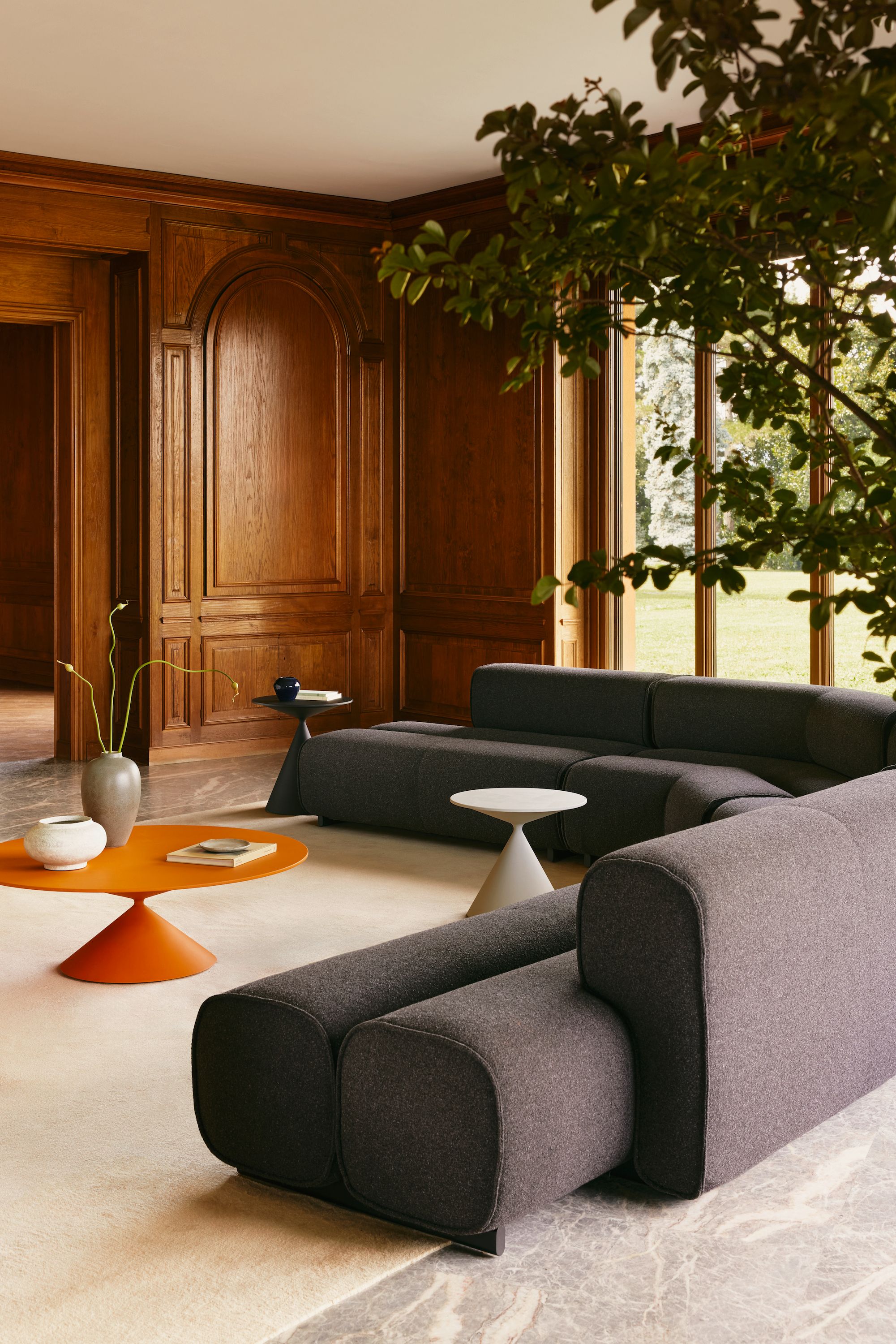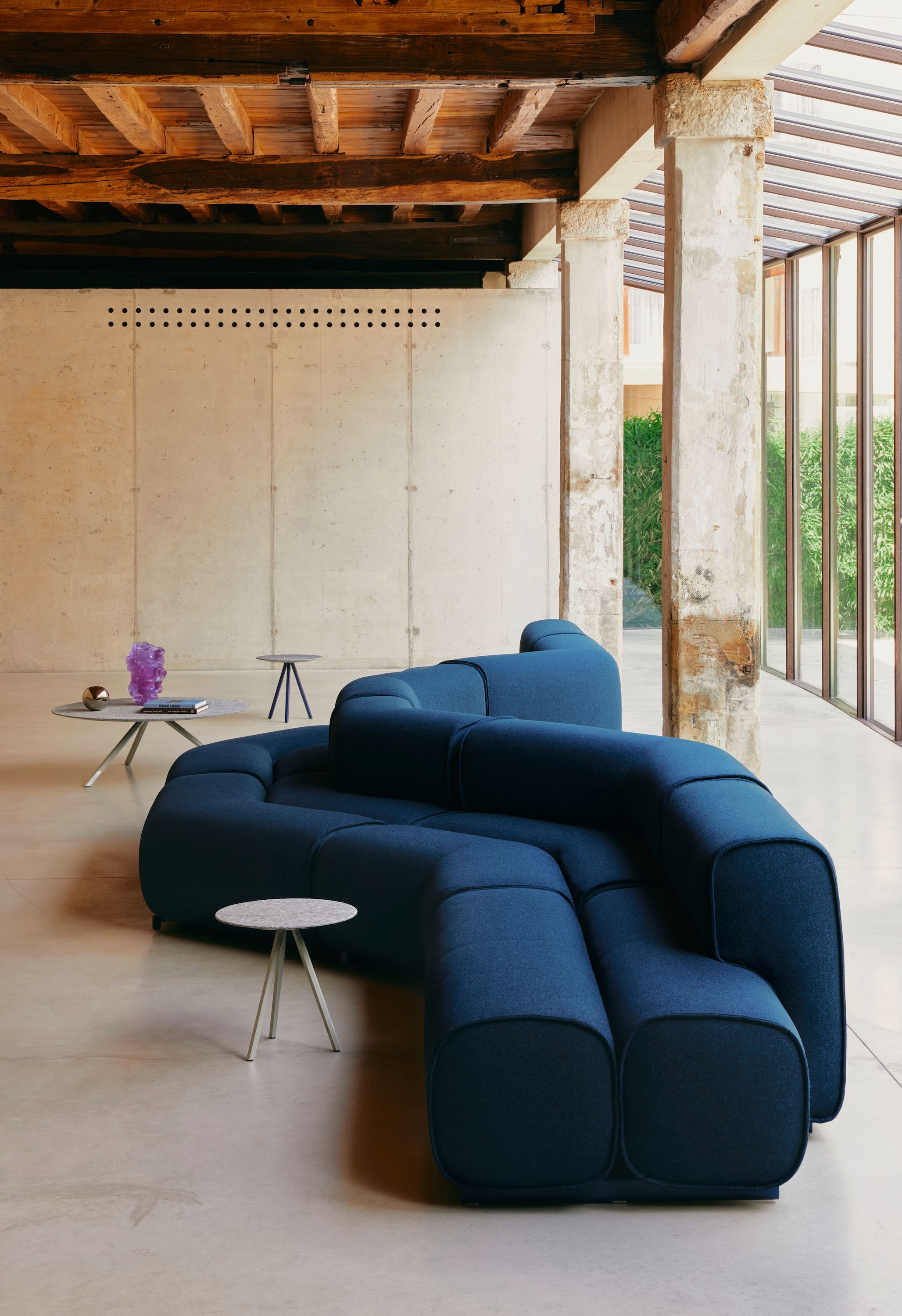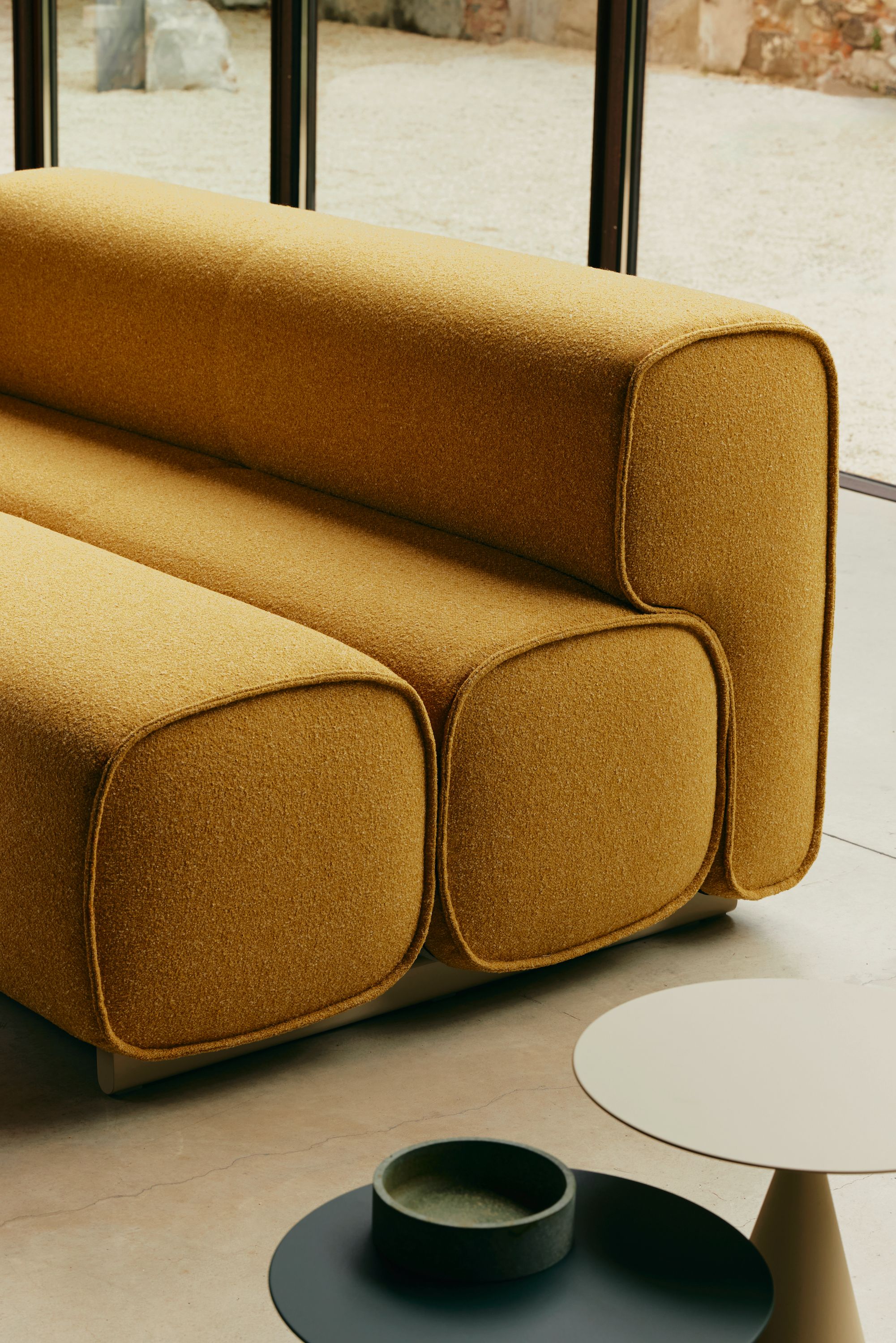 Montate su slitte di metallo dalla forma ovale, le sedute sembrano fluttuare nello spazio creando un effetto visivo di leggerezza che valorizza le finiture del metallo, materiale fondante di Desalto. Il design deciso, squadrato e scultoreo nasconde un attento lavoro artigianale sulle morbidezze: le quote differenziate delle schiume sono state studiate con minuzia per regalare grande accoglienza e comfort.