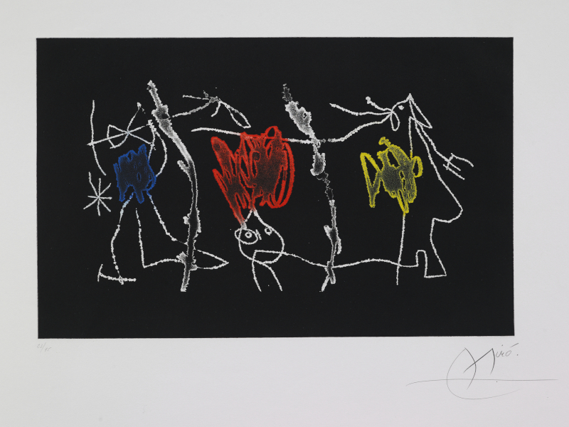 Nocturn catala 1972 - Acquaforte a colori 29,7×47,3 cm - 75 esemplari numerati e firmati a matita dall’artista più XV esemplari numerati in numeri romani denominati H.C. firmati Miró engraver vol.II, Dupin, Lelong Editeur, Paris n. 558