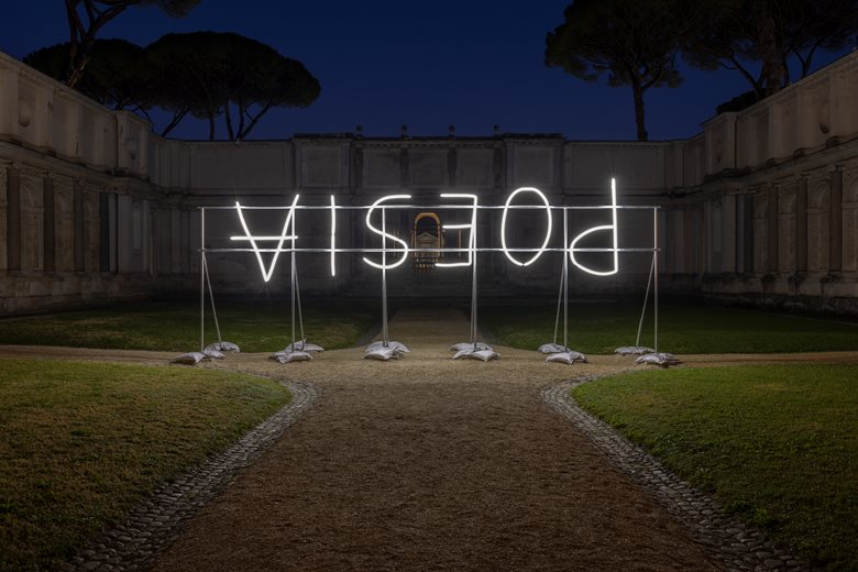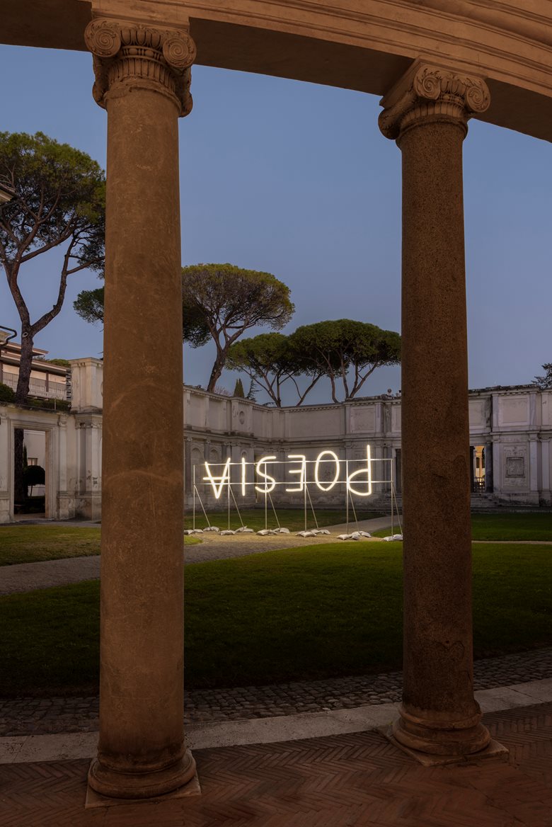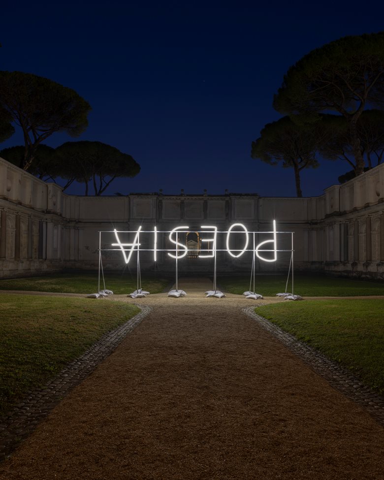 L’intervento si inserisce nel portico della villa rinascimentale, sede del più importante museo etrusco al mondo, come apparizione notturna e visiva: una scritta al neon bianco – la parola “POESIA” capovolta – che si staglia sull’architettura con una presenza sospesa e provvisoria.