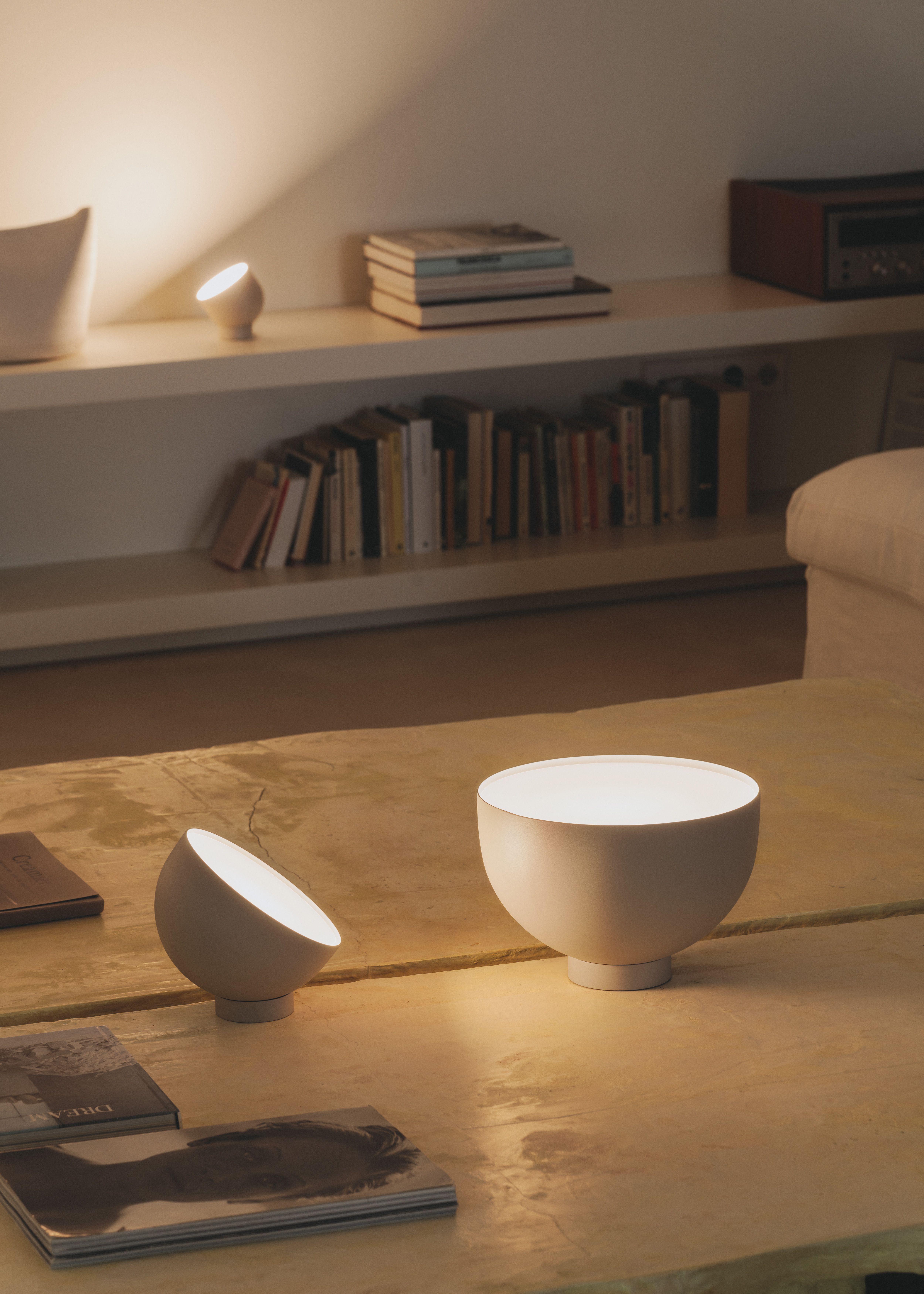 Proposta in versione da tavolo o da terra, la collezione si sviluppa in due tipologie di forme, connesse tra loro dall’iconico diffusore semi-sferico. La prima si caratterizza per un profilo a cupola rovesciata, disponibile come diffusore piatto di varie dimensioni o come compatto faretto d’accento. Gli apparecchi possono essere collocati liberamente sul pavimento o sul tavolo per proiettare una confortevole luce verso l’alto, oppure in posizione inclinata per mettere in risalto un’opera d’arte o una mensola.