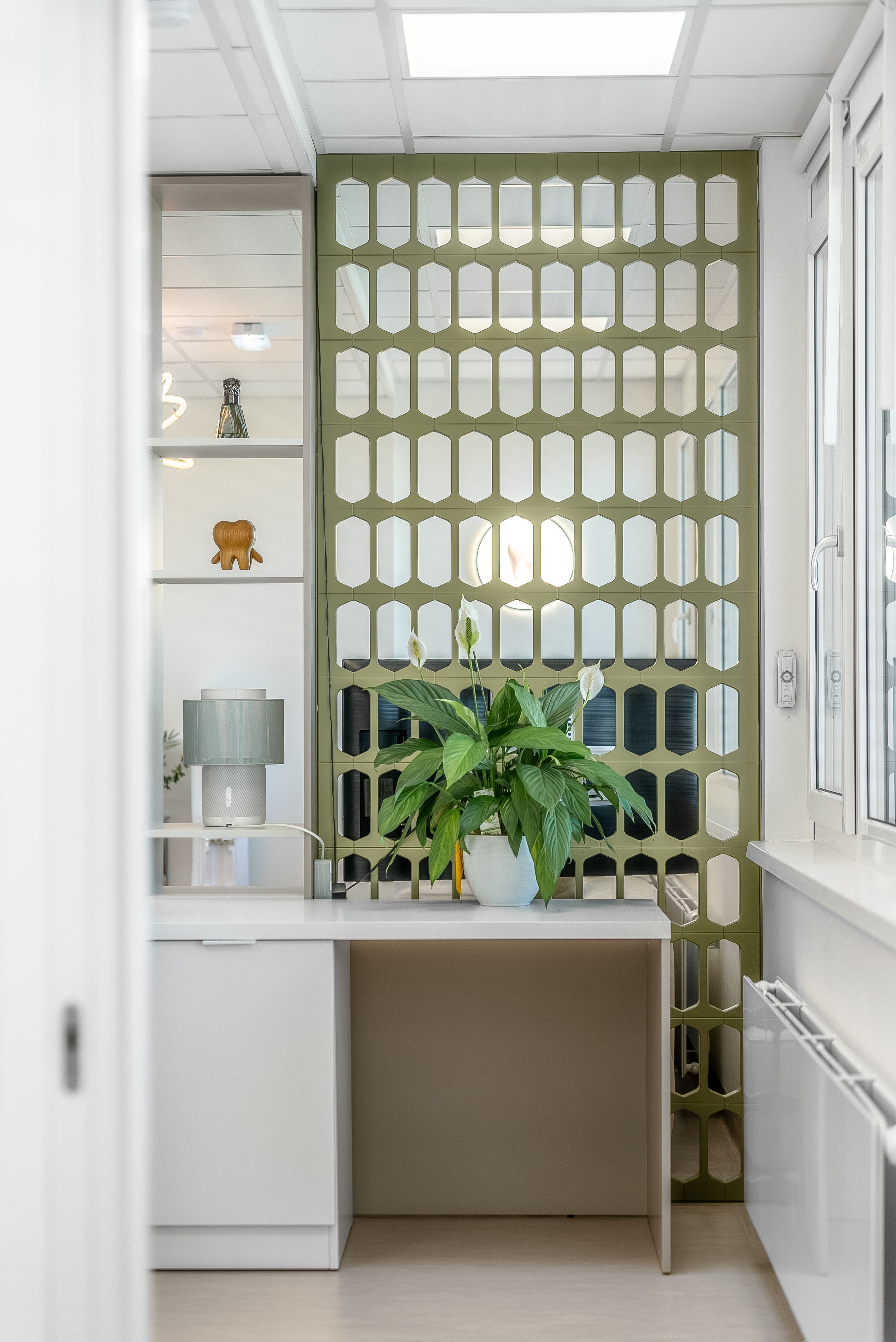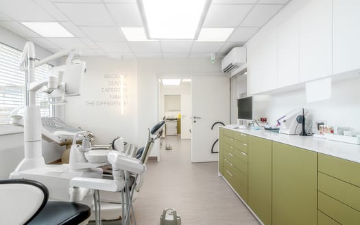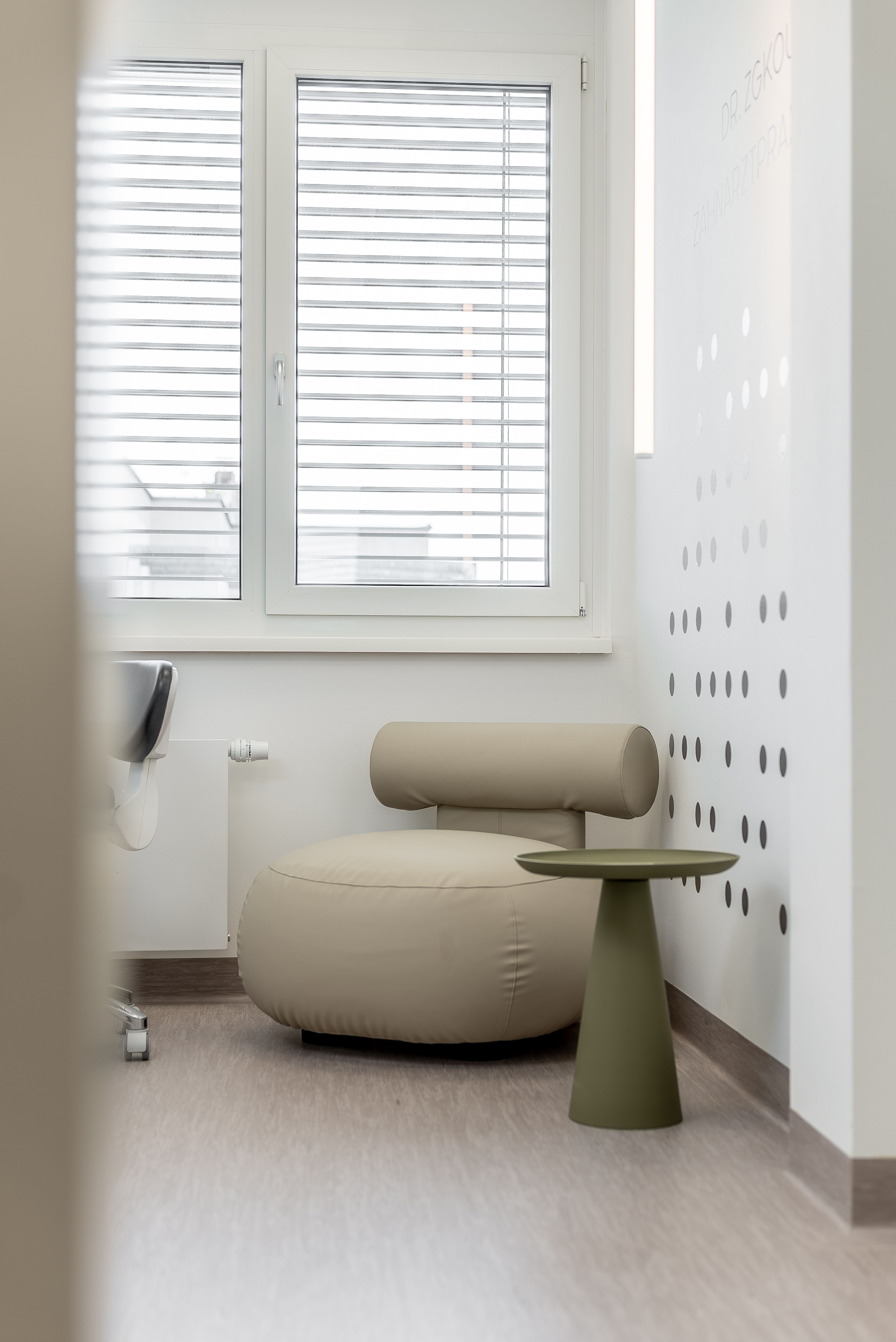 Lo studio di progettazione ha ideato uno spazio definito da linee pulite e da una palette cromatica morbida e neutra, con tonalità come bianco, oliva e crema, pensata per trasmettere calma e tranquillità, e favorire un’atmosfera di lavoro serena per il personale odontoiatrico.