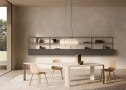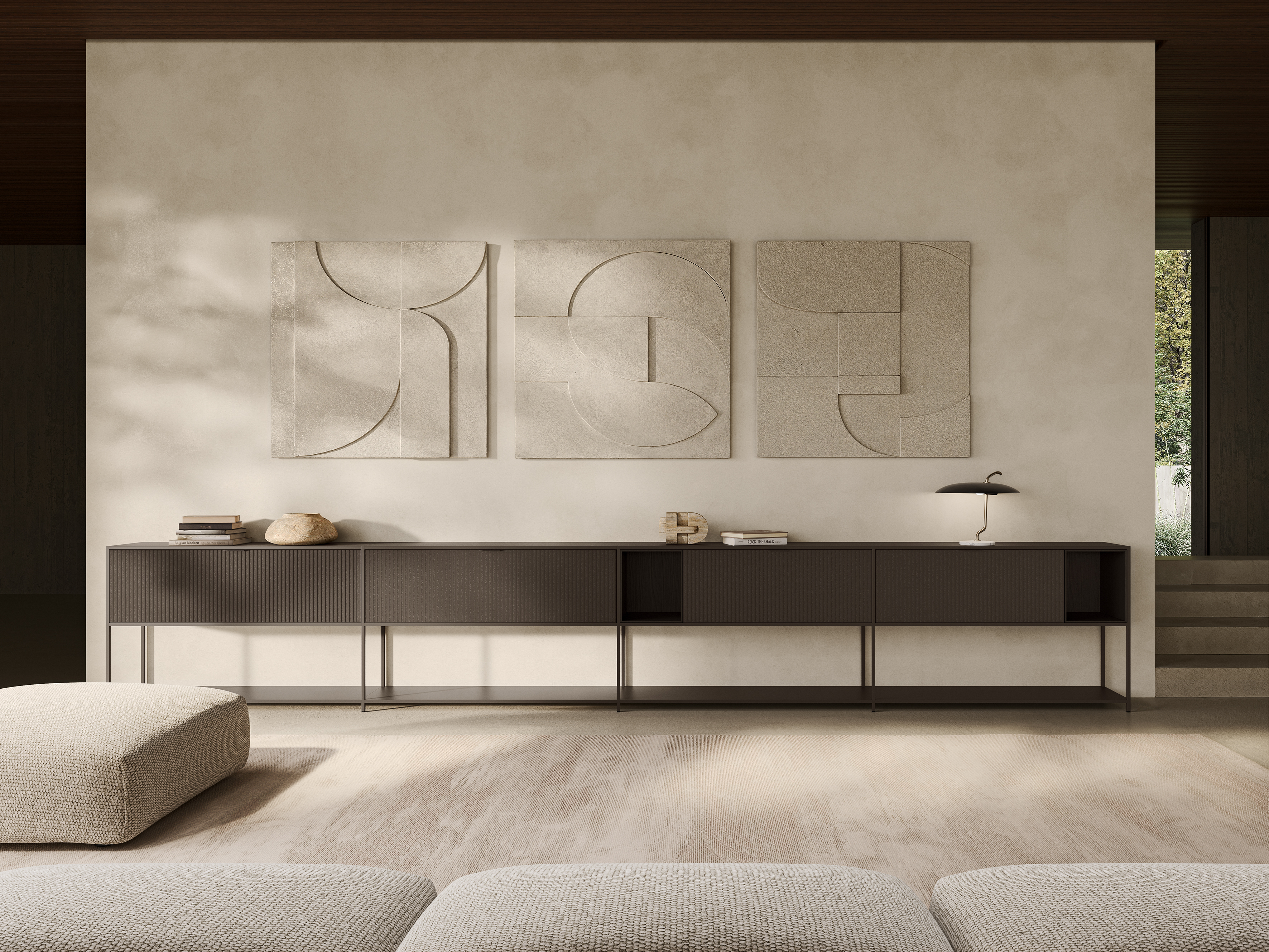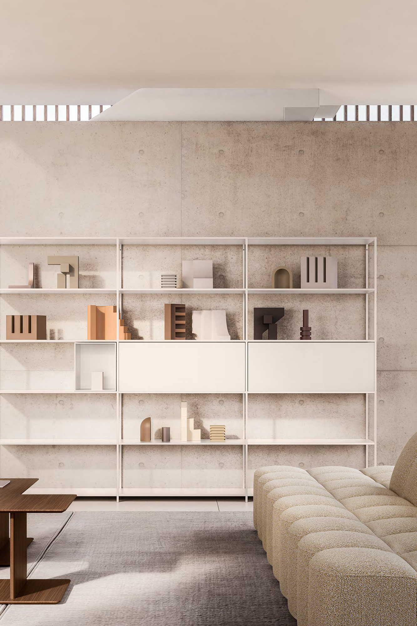 Nelle sue diverse varianti, Minima si rivela una proposta d’arredo versatile e funzionale sia nei contesti residenziali che contract, capace di articolare gli ambienti con rigore e leggerezza attraverso configurazioni personalizzabili. Le versioni a terra, pensile e sideboard organizzano gli spazi con equilibrio e continuità formale, adattandosi a contesti e proporzioni diverse. room divider, a tutta altezza, dialoga con l’architettura, definendo le aree senza interromperne la continuità visiva.