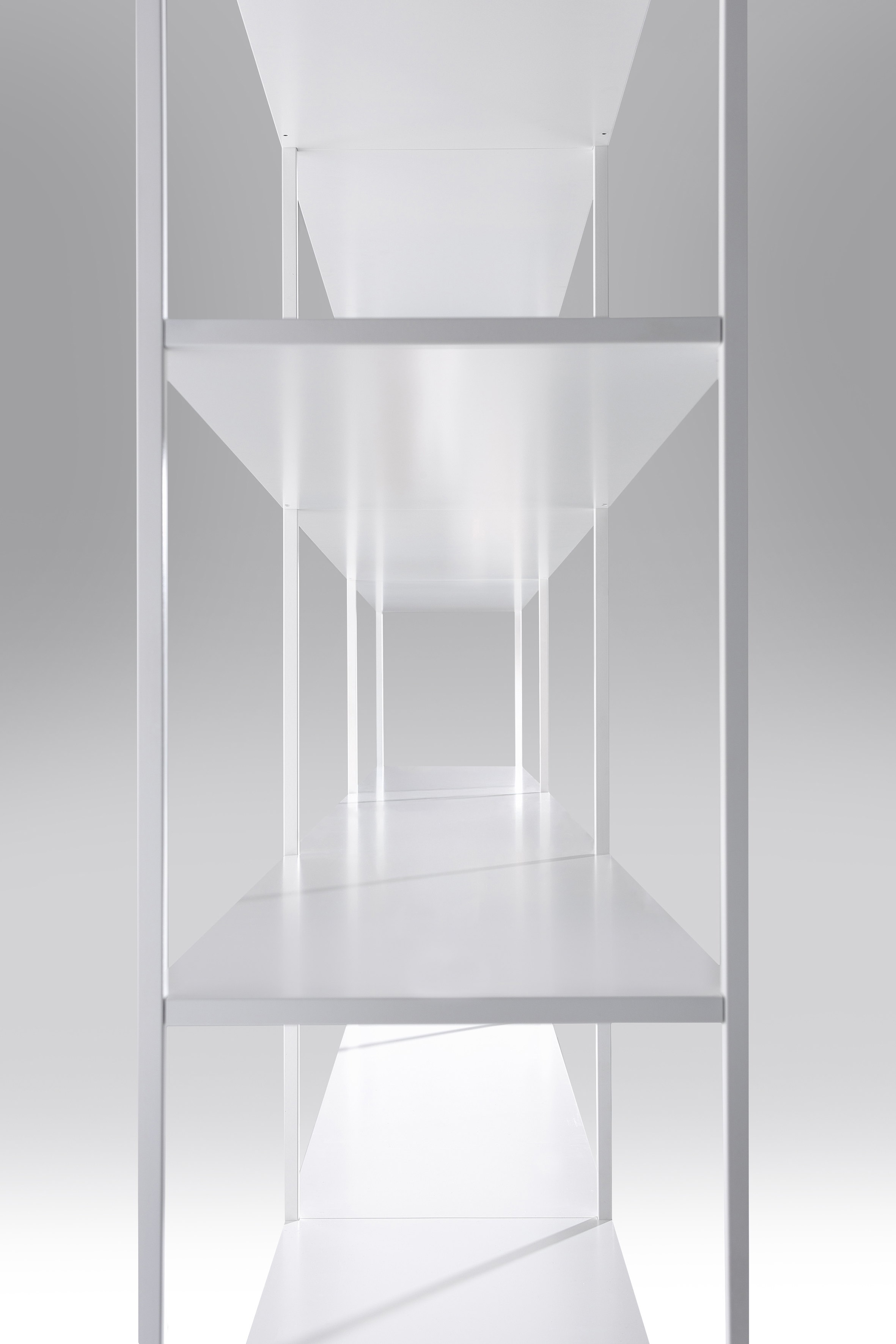 Disegnata nel 1998 da Bruno Fattorini e premiata con la menzione d’onore al XVIII Compasso d’Oro, Minima si compone di tre elementi chiave – mensola, montante e contenitore – inseriti in una struttura di soli 15 mm di spessore, che conferisce all’insieme una leggerezza visiva inconfondibile. Il sistema di giunzione tra i componenti, completamente invisibile, rafforza la purezza formale del progetto, valorizzando l’equilibrio tra precisione tecnica e chiarezza del segno.