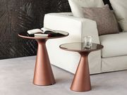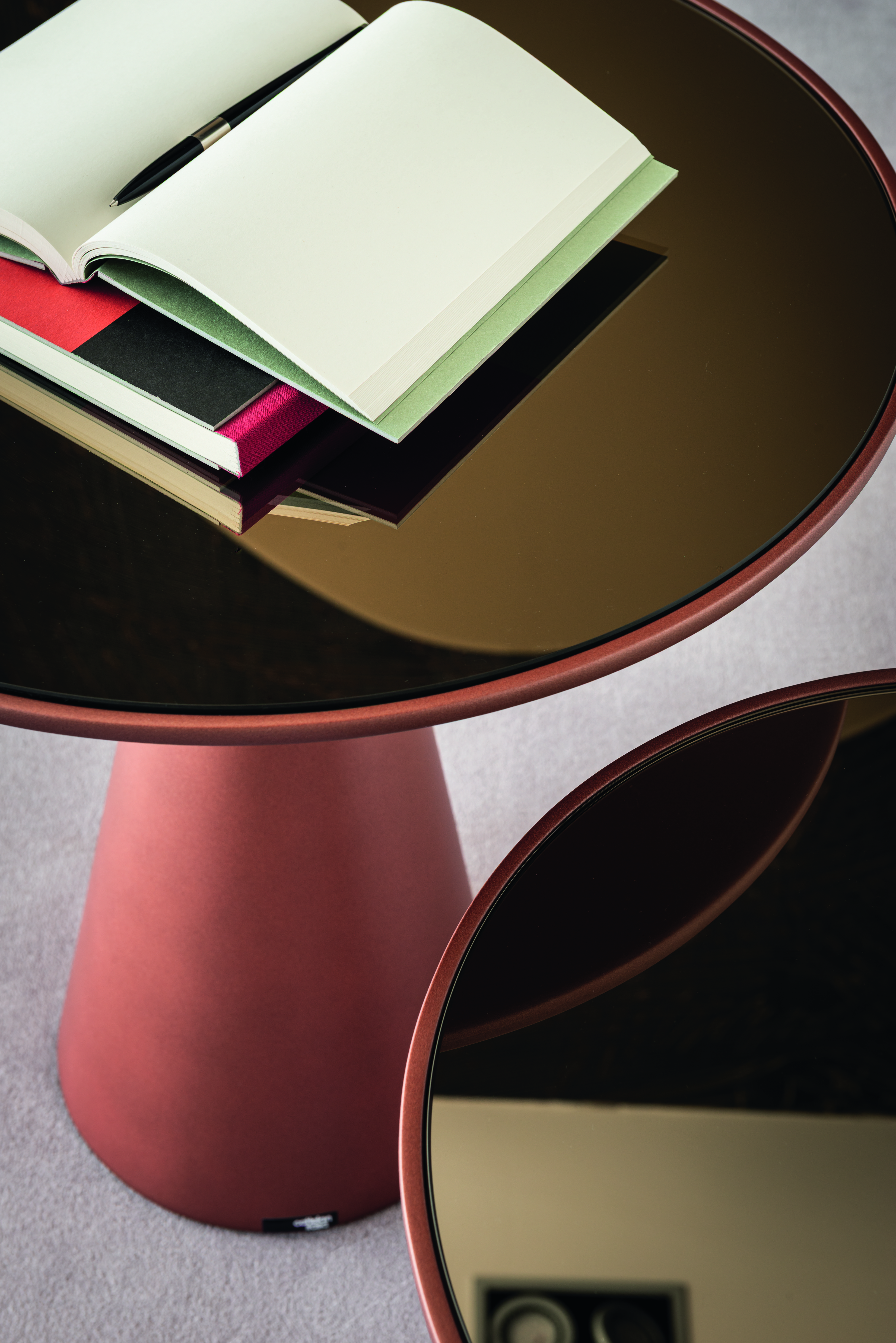 Il prezioso piano rotondo in vetro nelle versioni specchiata fumé o verniciata completa l'arredo Cattelan Italia. Nella sua anima, la nuova colorazione Paprika, acquista brillantezza e dinamismo. Le superfici riflettono la luce, creando giochi visivi che amplificano volumi e prospettive.