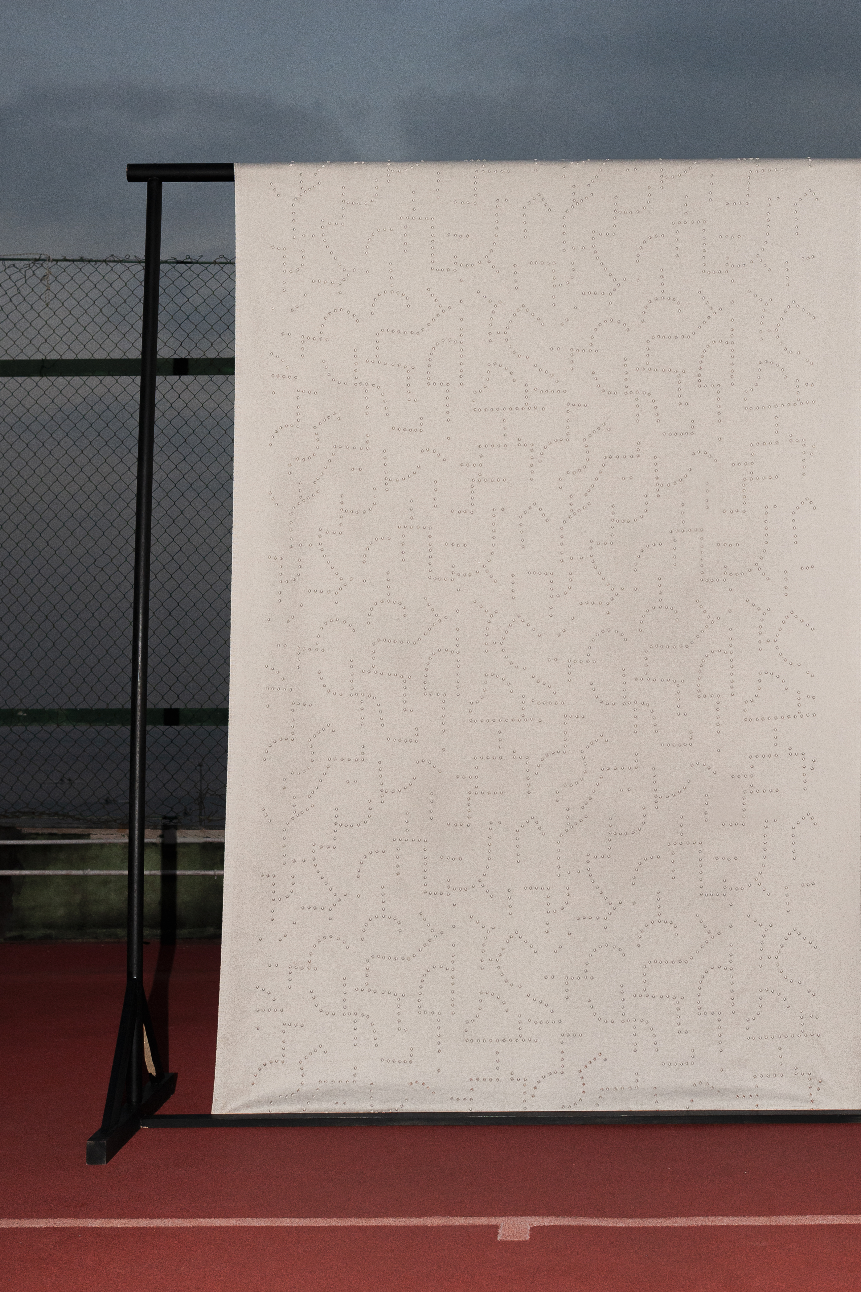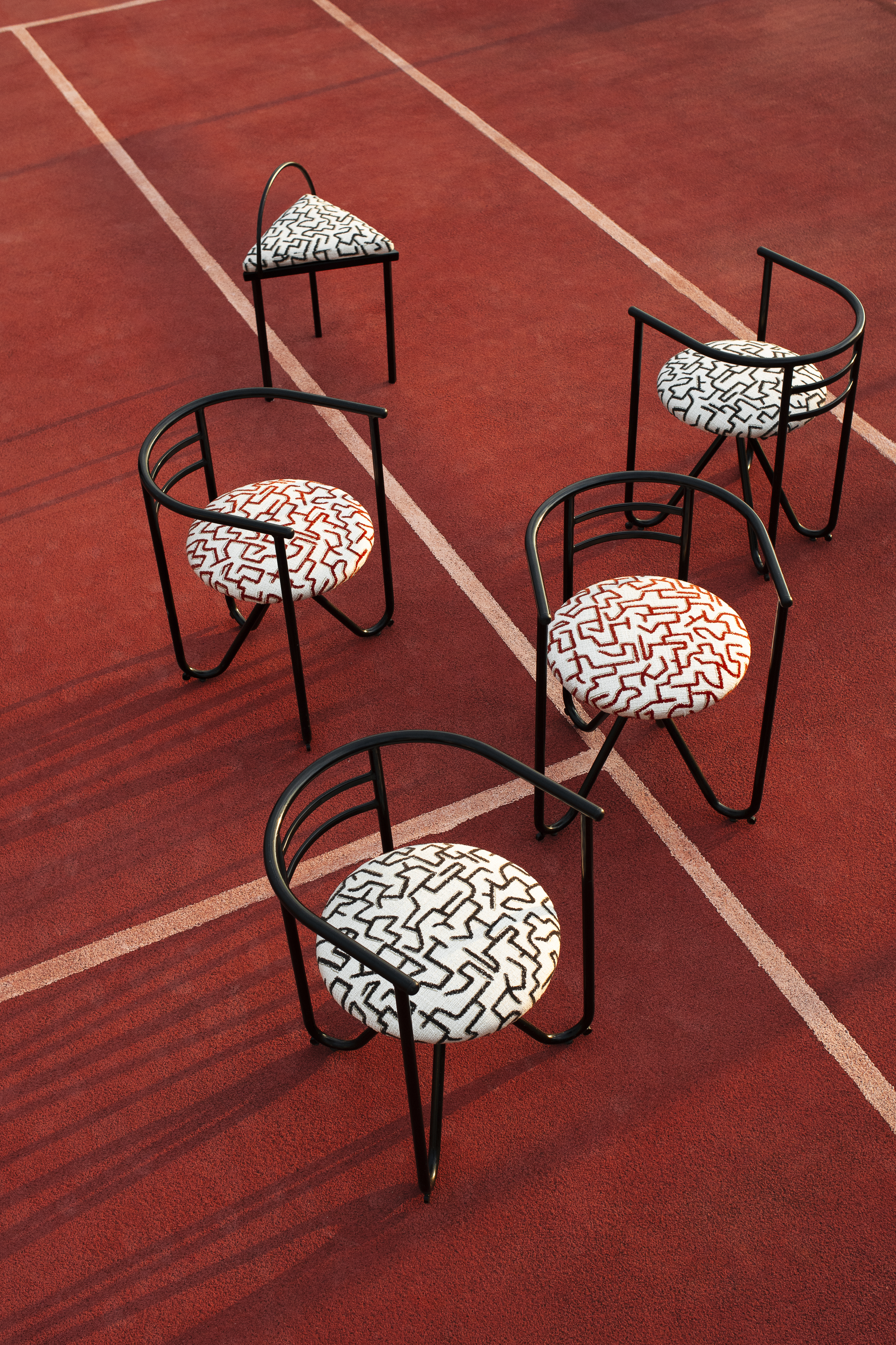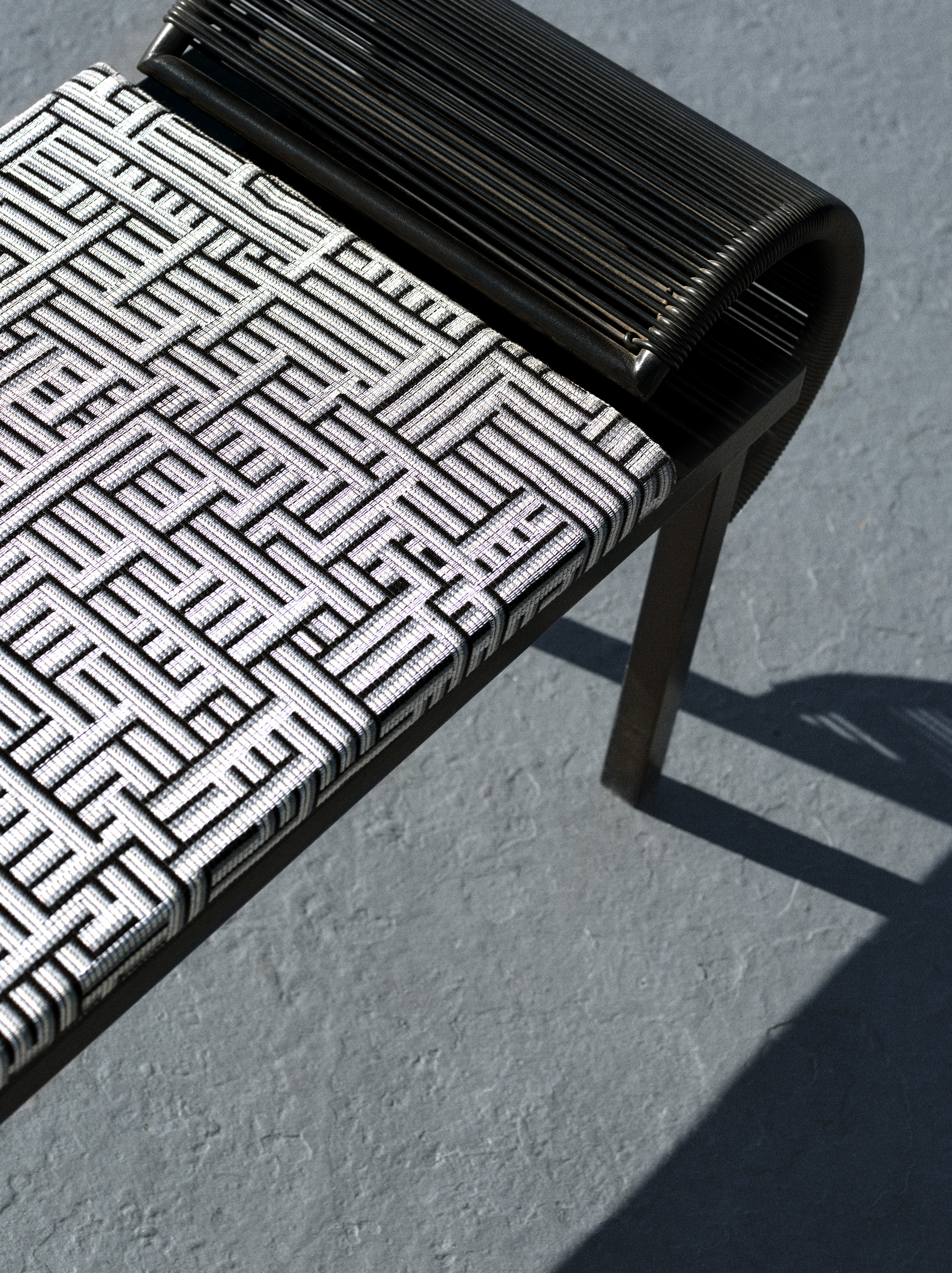 Le Apt Embroideries, infine, ampliano l’orizzonte del tessuto ignifugo, portandolo dove non era mai arrivato. Il nobile ricamo minuzioso si reinventa in materiali resistenti, durevoli, lavabili. Geometrie, nastri sinuosi e greche decostruite animano un senso di tridimensionalità.