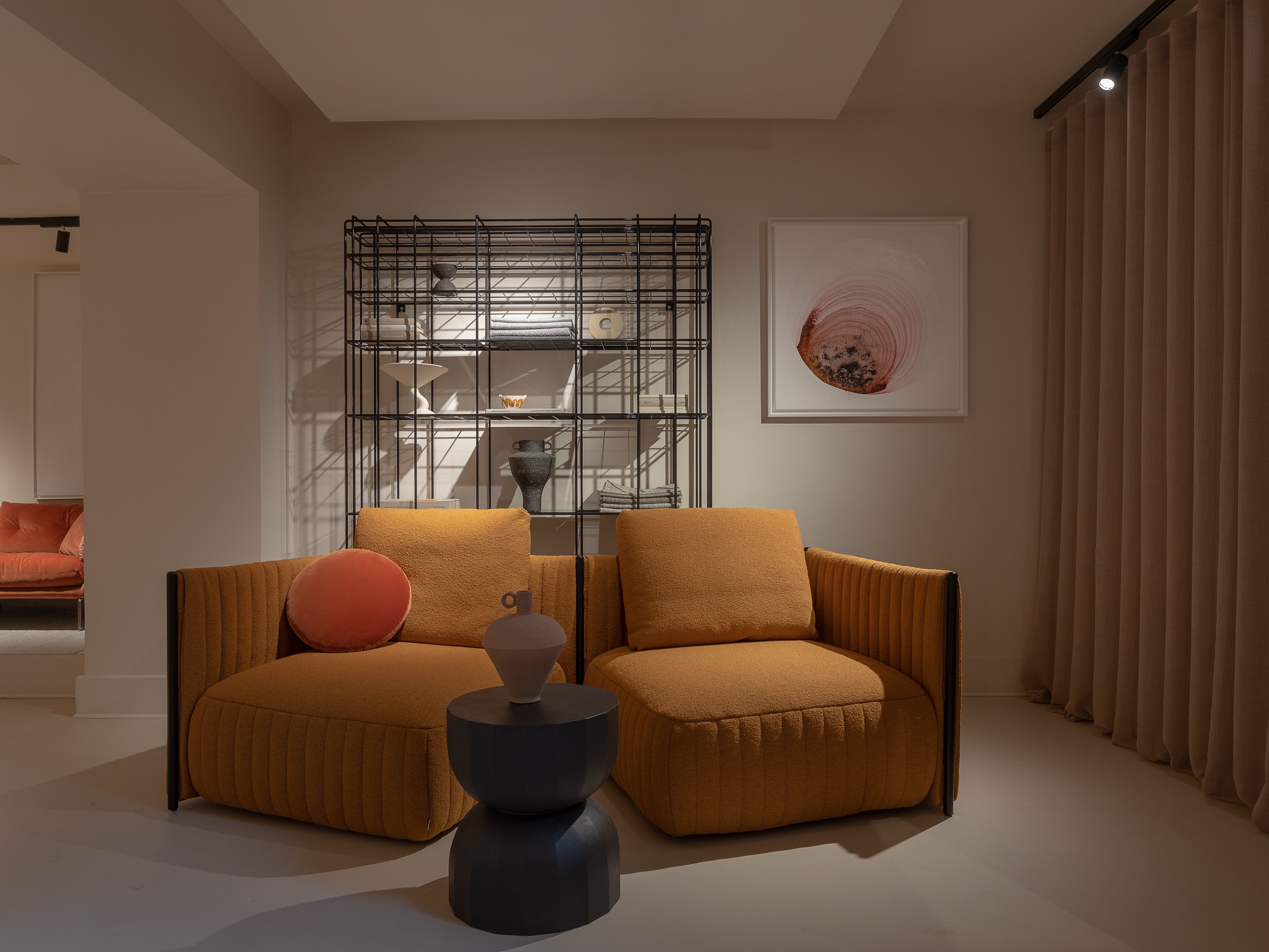 Il piano terra mette in scena un dialogo curato tra i pezzi più iconici e senza tempo di Saba e le più recenti novità di prodotto. La poltrona Anam di Federico Peri e i preziosi tavolini Tres di Mut Design animano le vetrine, mentre un’ampia composizione del divano Pixel si afferma come protagonista assoluto, simbolo di uno dei progetti più longevi e amati del brand. Il tavolo Teatro Magico di 967arch crea un’intima zona dining, le poltroncine Pan Flute di Paolo Grasselli e il tappeto Cime di Zanellato/Bortotto, arricchiscono visivamente lo spazio con una profondità di forme e una palette cromatica distintiva del marchio.