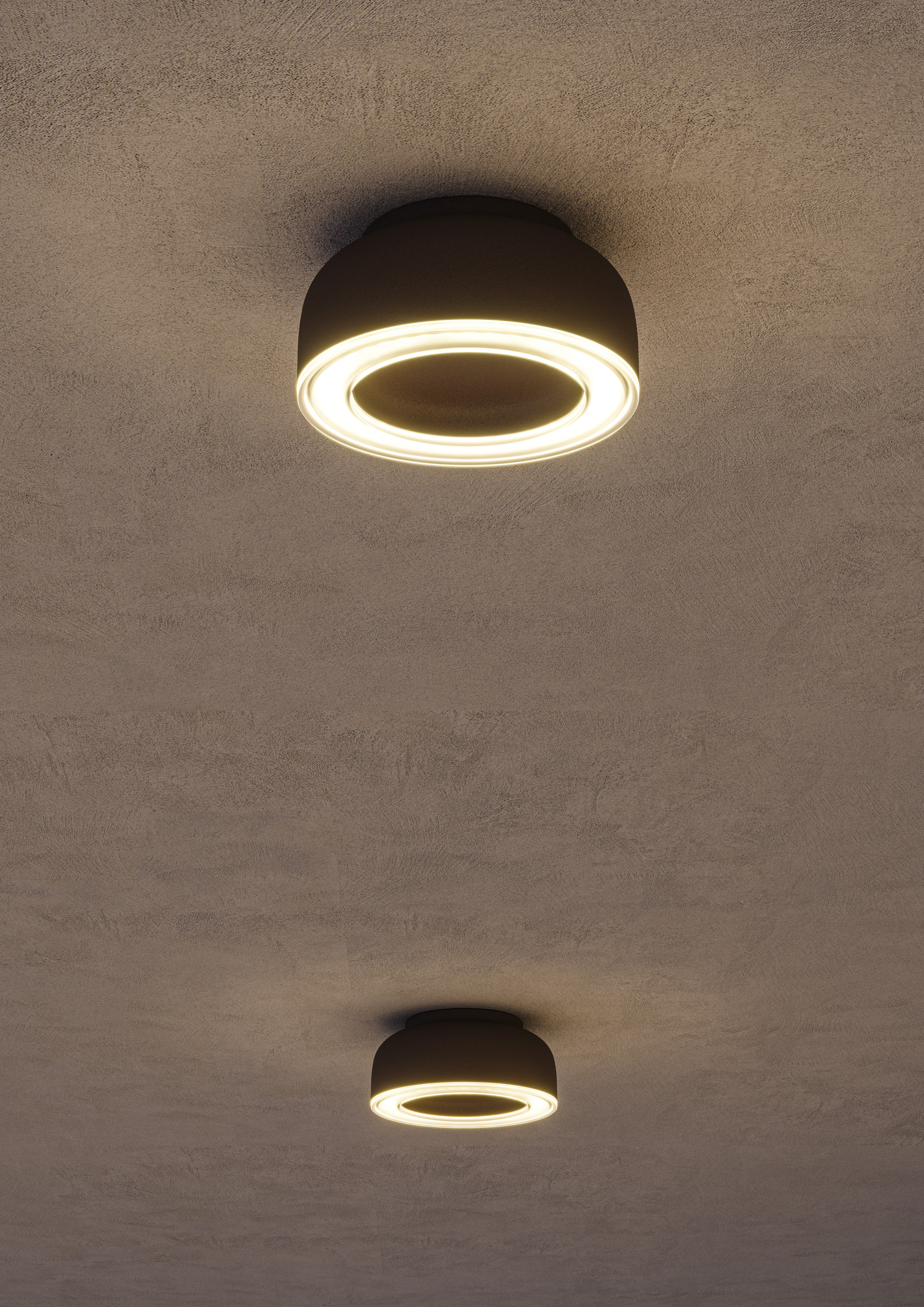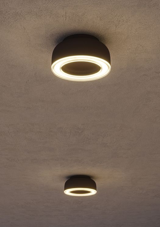 In Ribeira, una sottrazione misurata genera un vuoto centrale che amplifica l’eleganza della forma; lungo la corona circolare si inserisce l’ottica miniaturizzata Optidiamond, che emette una luce morbida e uniforme.