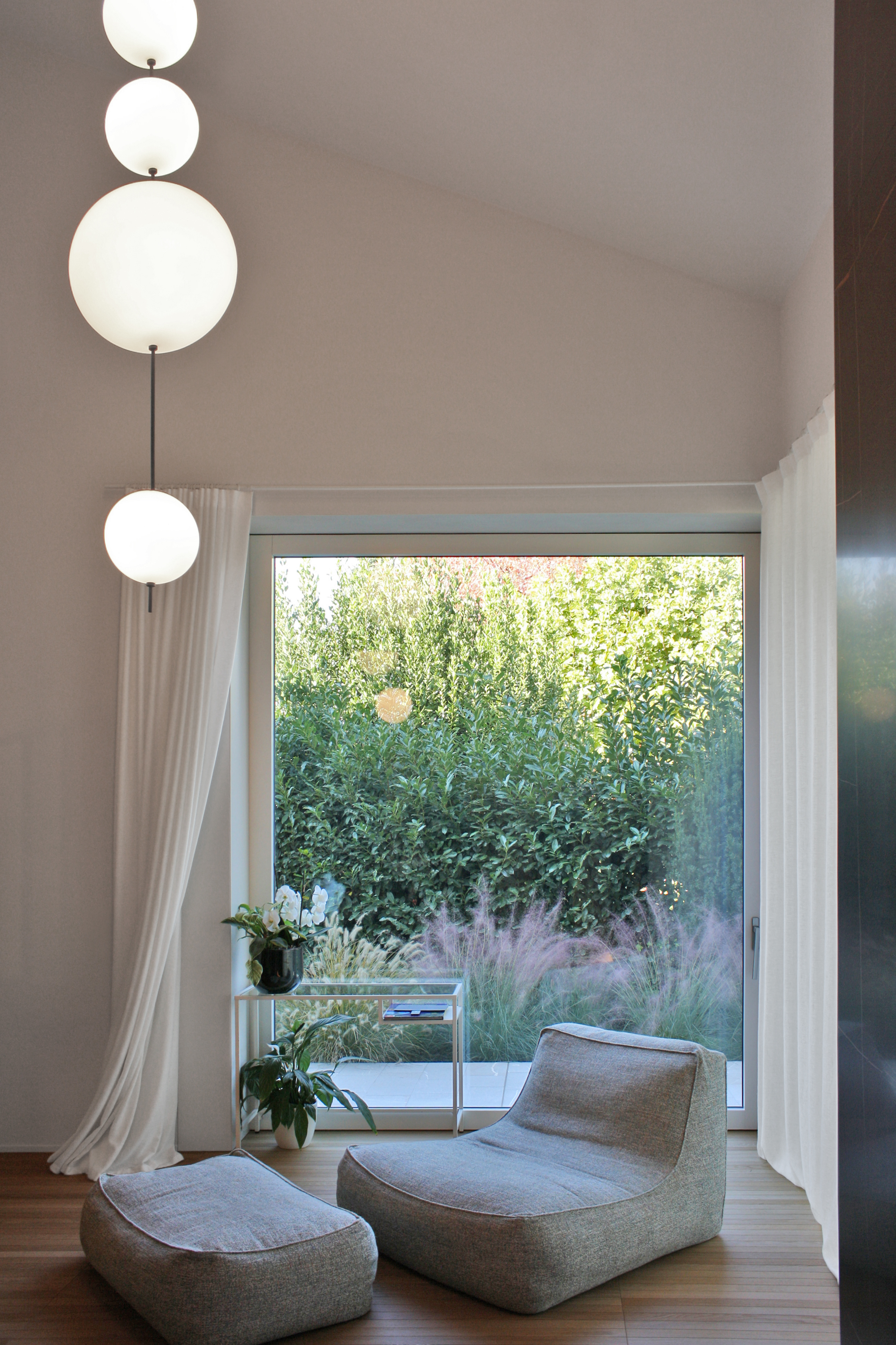 Il cuore del progetto è rappresentato dalla zona living, concepita come un ambiente ampio e scenografico, caratterizzato dal doppio volume e da una forte continuità visiva tra gli spazi. Al centro della composizione si colloca la scala, elemento architettonico disegnato su misura che assume un ruolo iconico: una vera e propria quinta che organizza e filtra le funzioni senza interrompere la fluidità degli ambienti. Le grandi superfici vetrate, strategicamente posizionate, amplificano il dialogo con il paesaggio esterno e portano la luce naturale a definire e modellare gli interni.