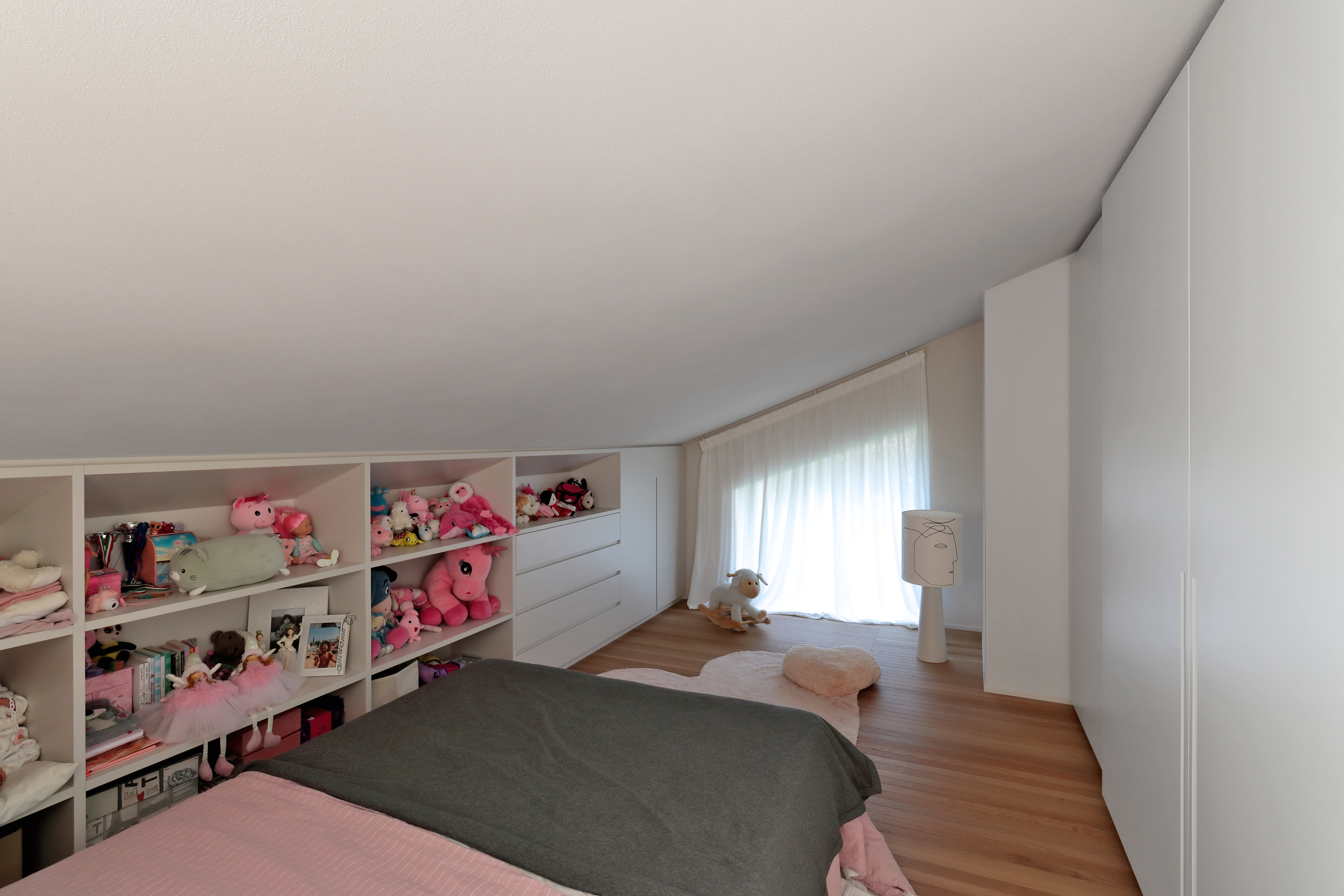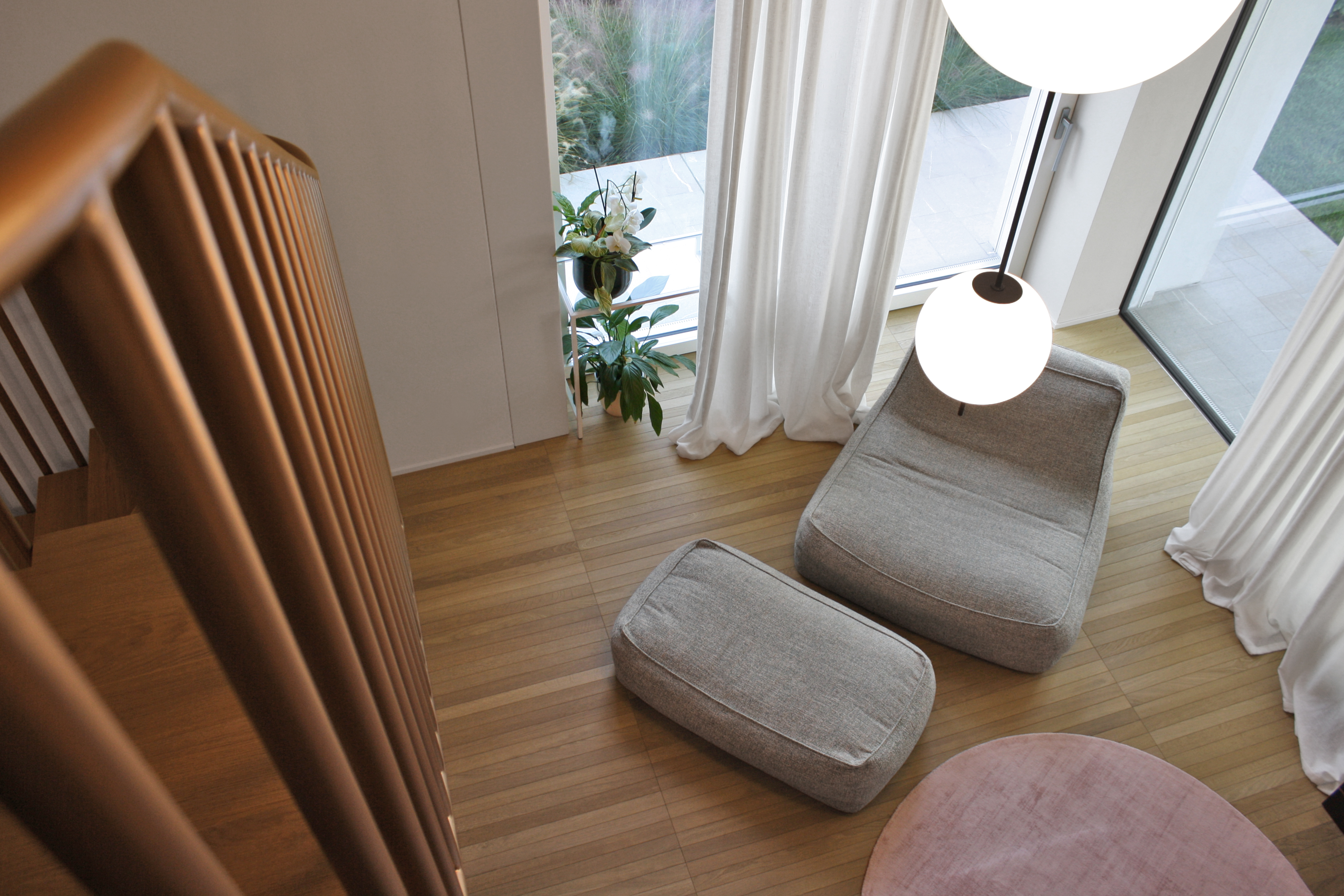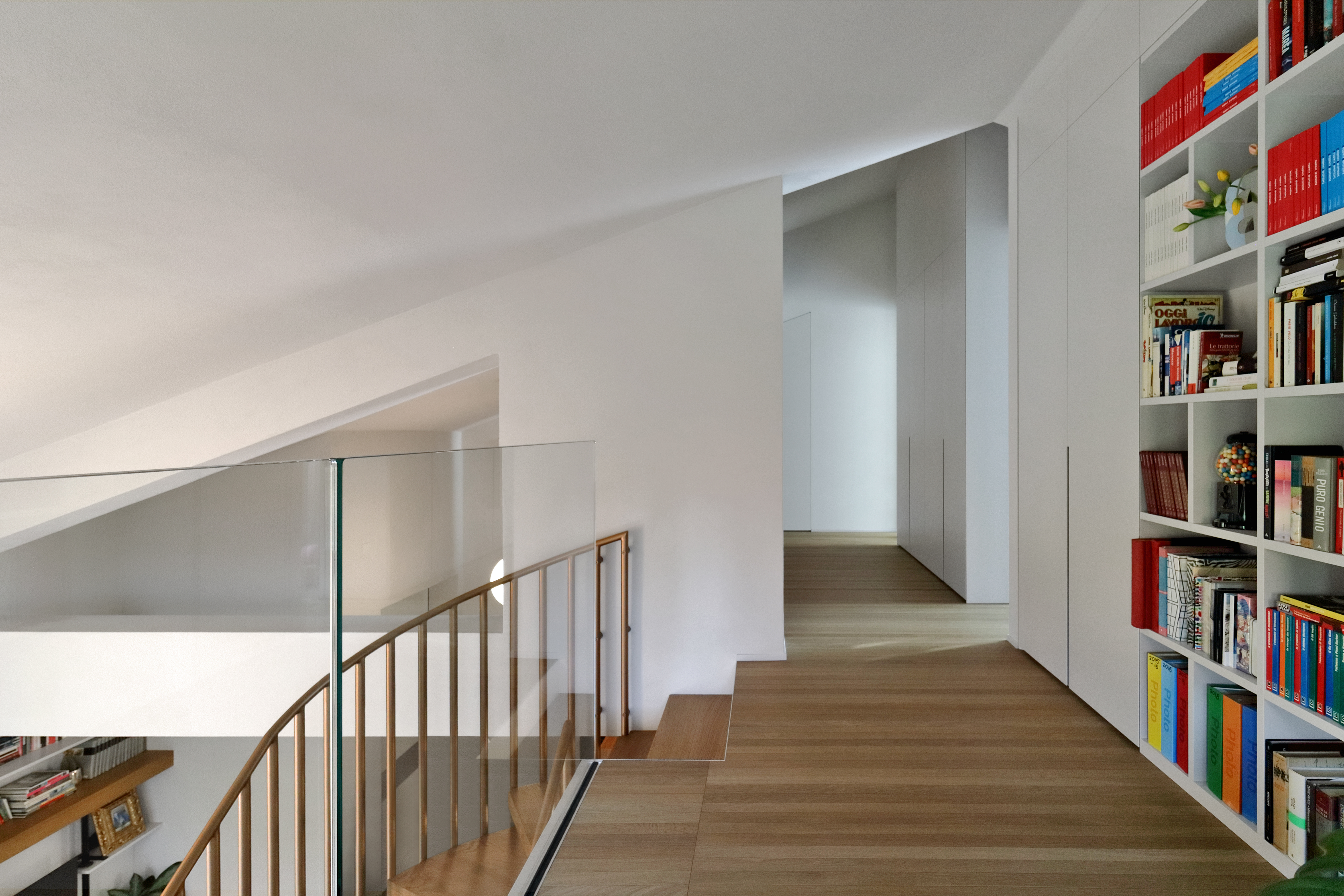 In questo contesto, la scelta dei materiali assume un valore progettuale determinante. La pavimentazione in Atelier Désir di Listone Giordano accompagna l’intero sviluppo della casa, diventando l’elemento di continuità che lega tra loro spazi, funzioni e livelli. Le liste strette e allungate del parquet enfatizzano la direzionalità degli ambienti e rafforzano la lettura prospettica dell’architettura, contribuendo a costruire un racconto spaziale coerente e unitario.