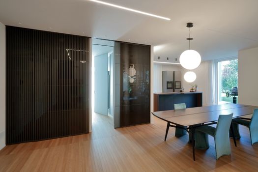 L’architettura si sviluppa attorno a un volume principale destinato alla funzione abitativa, affiancato da un corpo secondario che ospita autorimessa e locali tecnici. L’intero edificio poggia su un unico basamento, elemento che rafforza la percezione di unità e stabilità dell’insieme. La distribuzione interna privilegia una netta separazione funzionale: al piano terra trovano spazio le aree di rappresentanza e la suite padronale, mentre il livello superiore è dedicato alla zona notte dei bambini, organizzata come uno spazio luminoso e vivibile, in relazione visiva con la zona giorno sottostante.