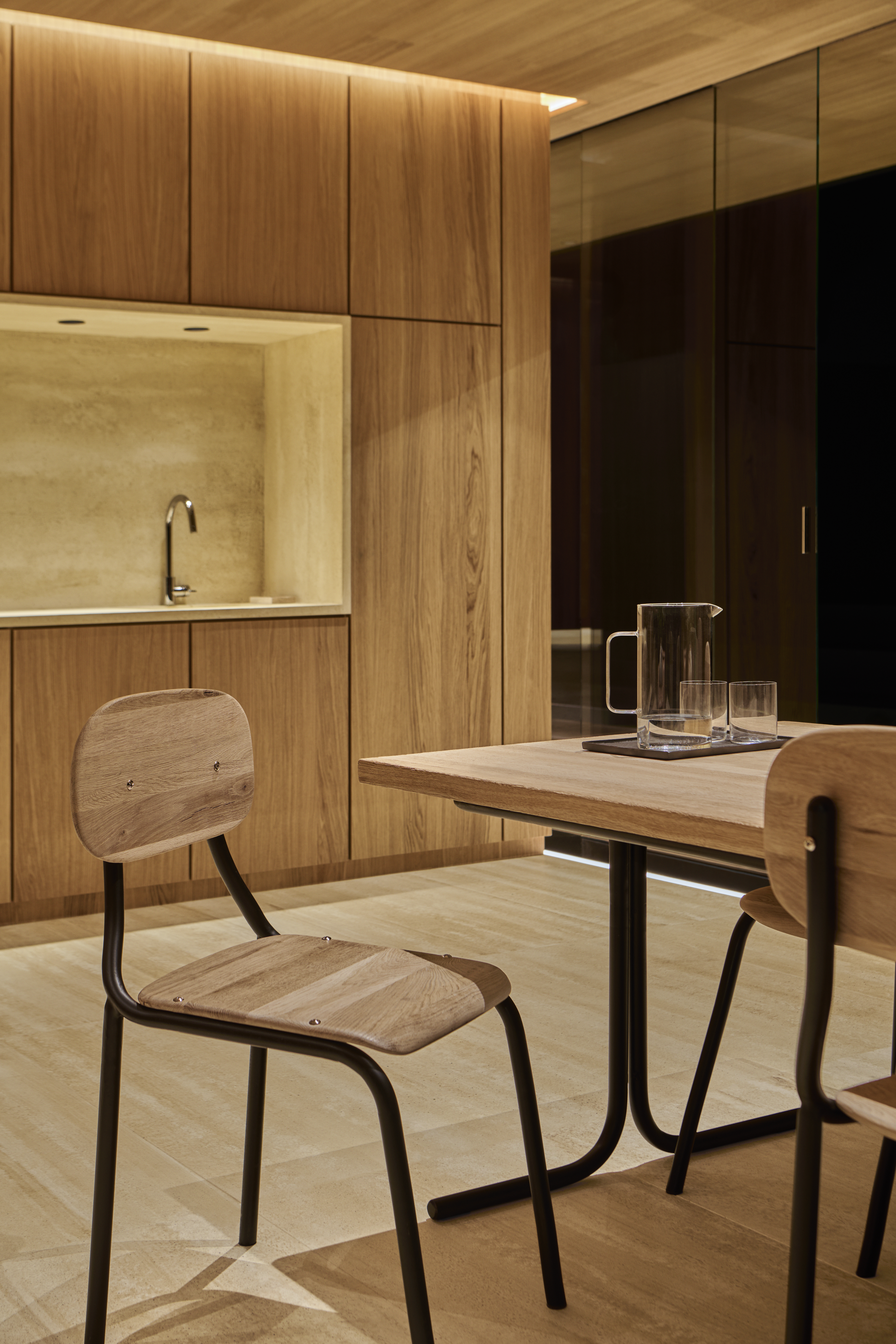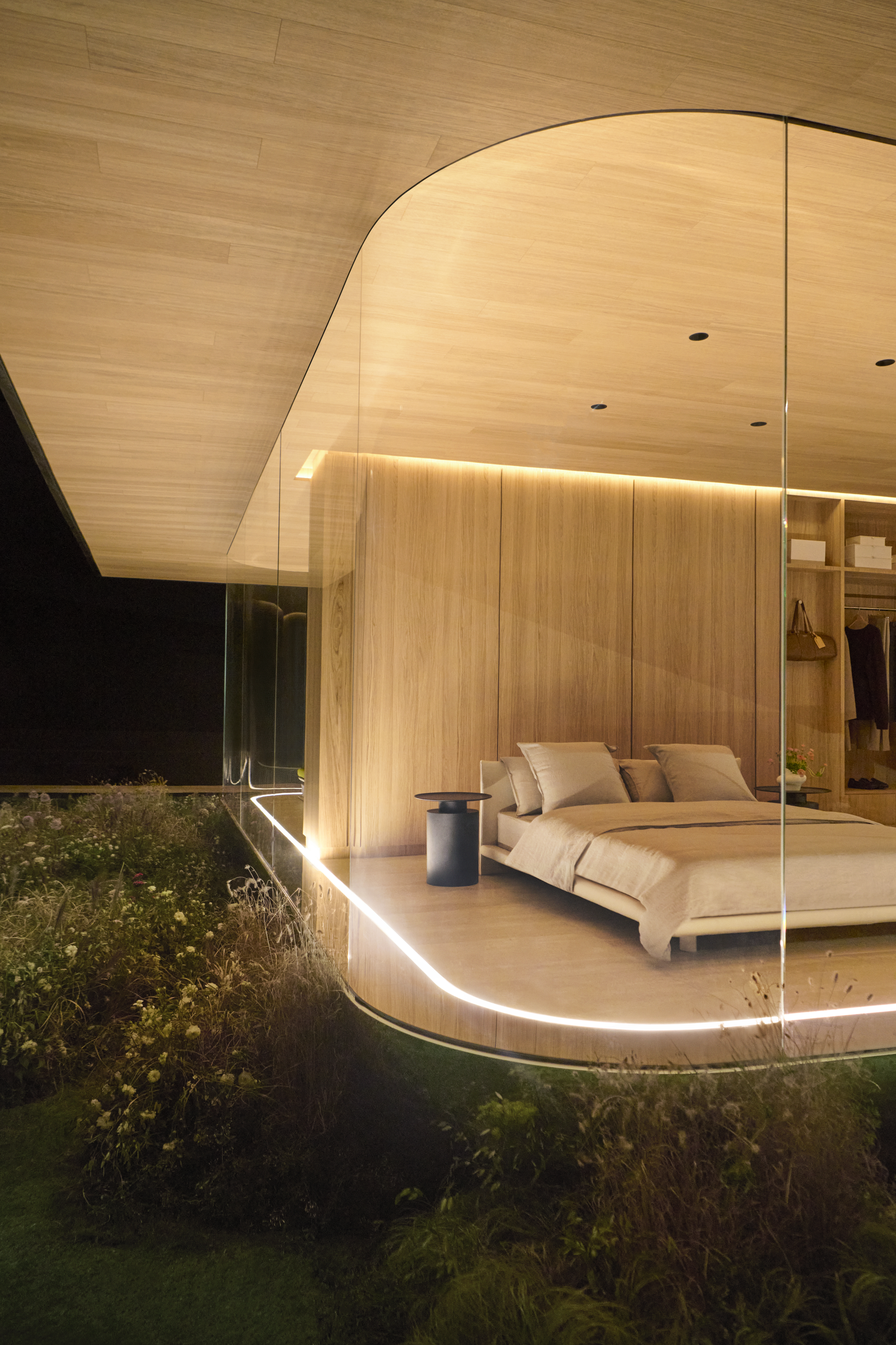 La casa prende ispirazione da una goccia d’acqua: le pareti in vetro compresso ne richiamano la forma e creano un continuum tra interno ed esterno. Nel set della sfilata, la struttura era immersa in terrazze in stile giapponese e in erbe alte, a enfatizzare la dissolvenza dei confini tra casa e giardino.