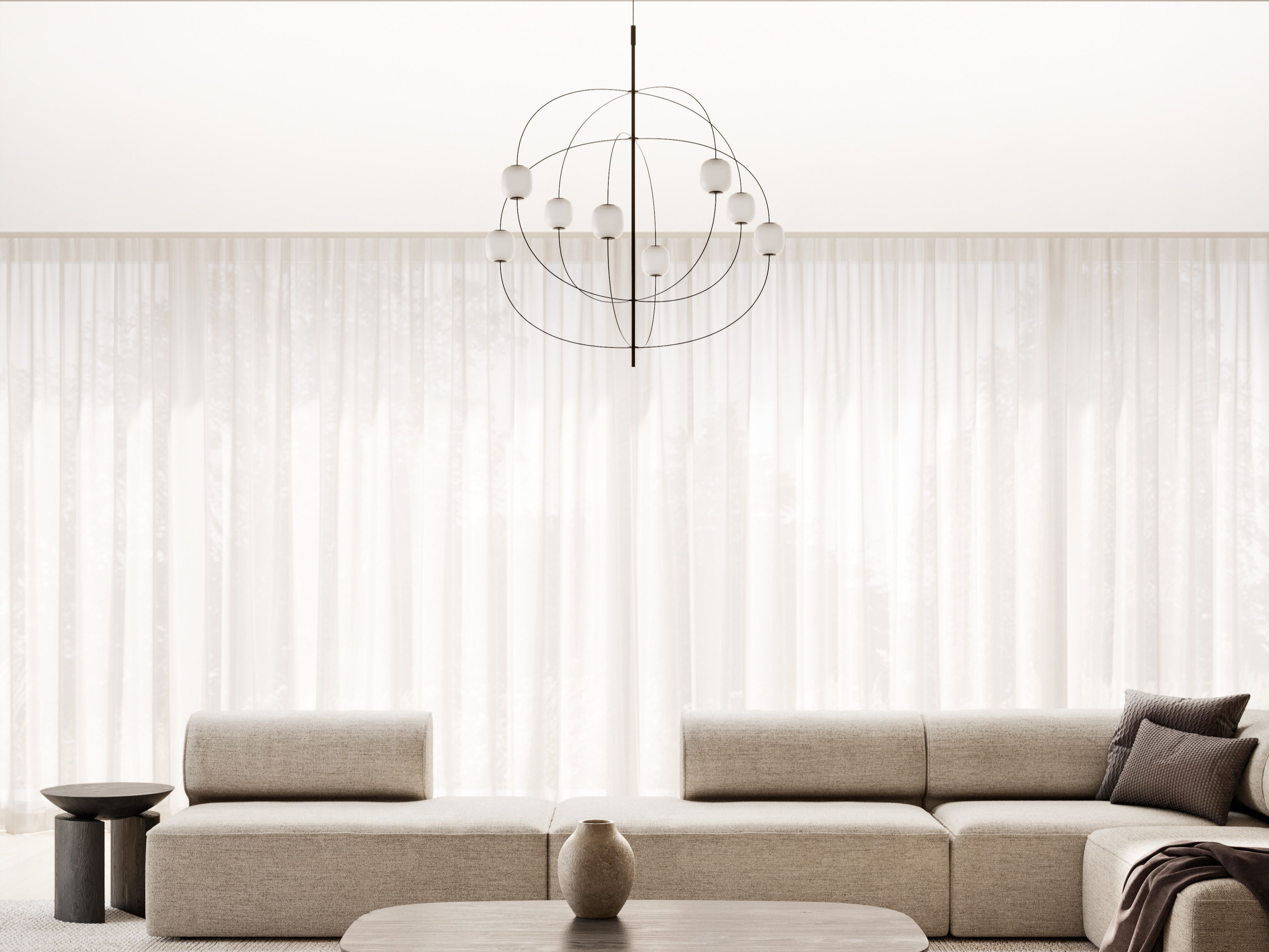 Un sistema dalla presenza importante che fonde segno decorativo, luce e tecnica in un gesto sottile e continuo: Axia è una lampada che illumina lo spazio, anche quando è spenta.