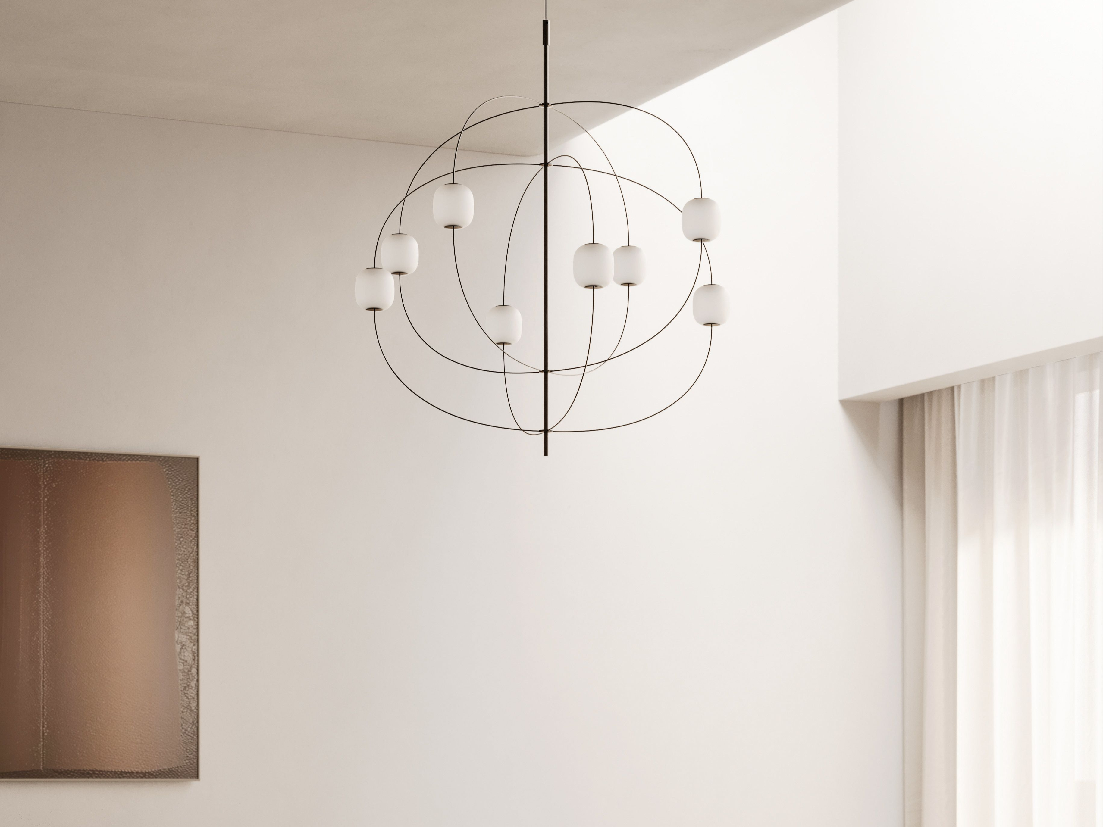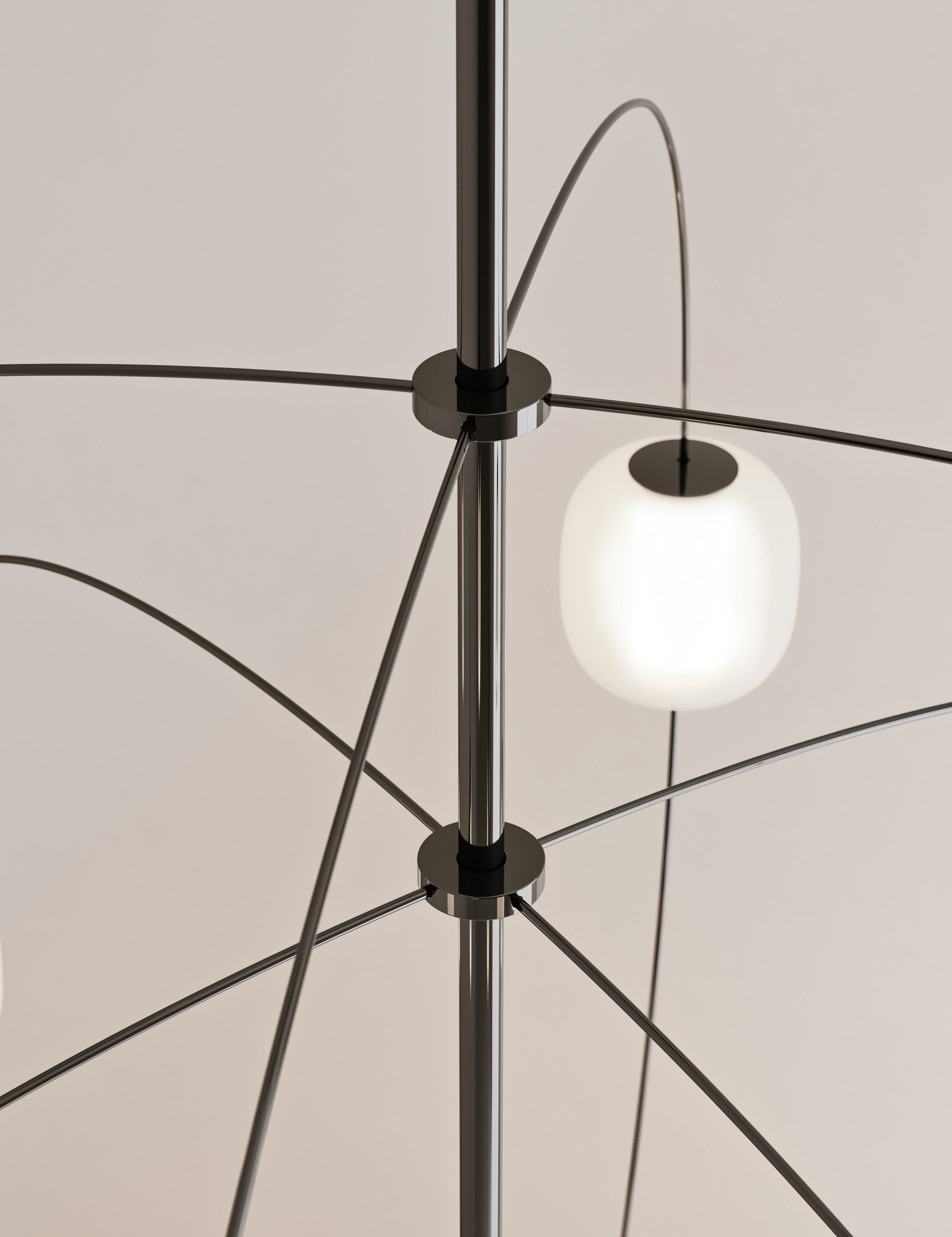 Il progetto nasce da un disegno continuo, in cui l’asse centrale si assottiglia per restituire una sensazione di equilibrio e leggerezza. Da qui, le braccia si diramano come elementi che si connettono tra loro, dando vita a un sistema luminoso che valorizza il segno e la forma. L’output luminoso, elevato e diffuso, amplifica la percezione di una luce che abbraccia lo spazio.