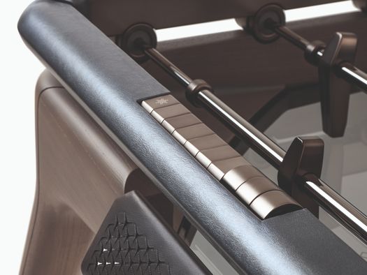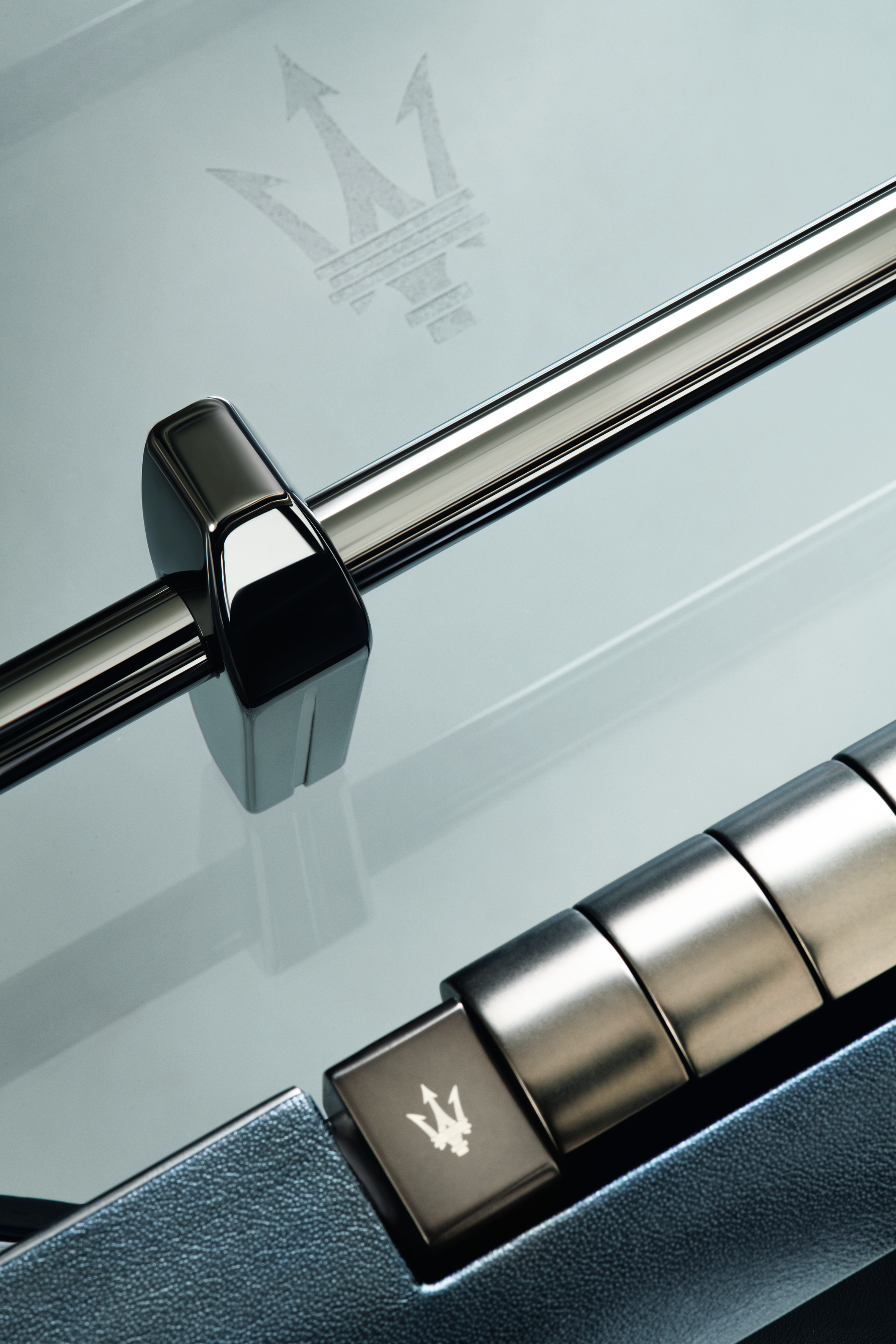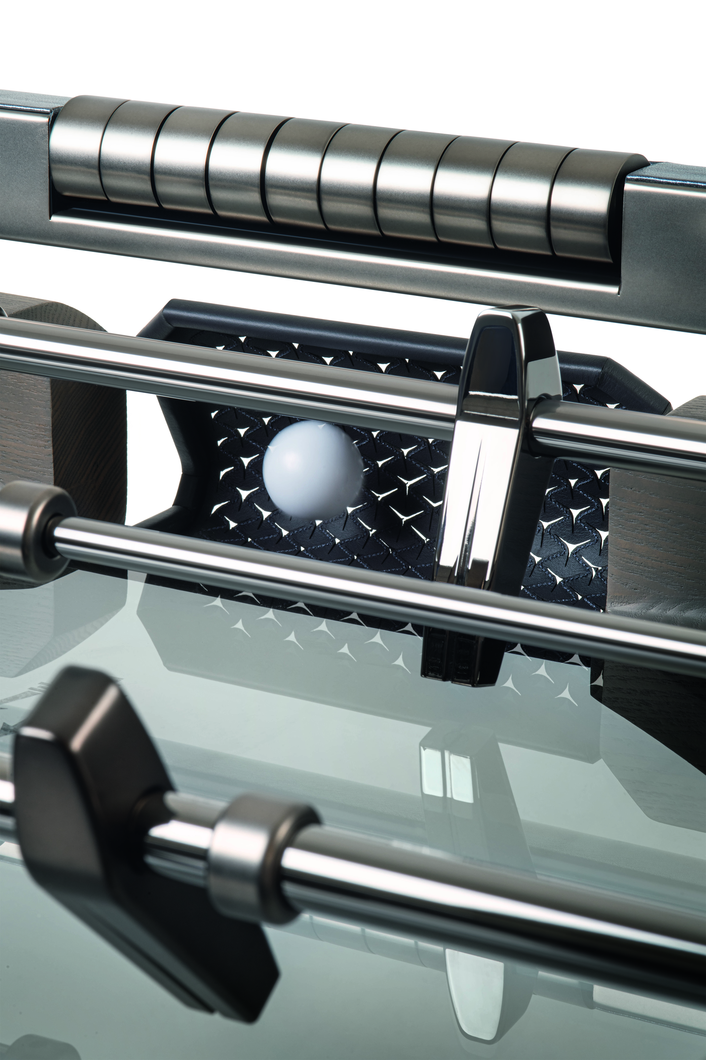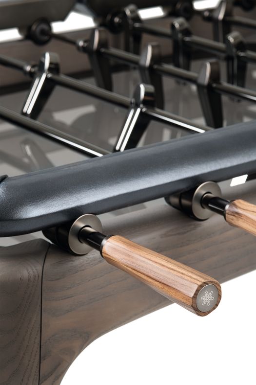 Il campo da gioco in vetro fumé dialoga con una cornice sopraelevata rivestita in pelle, i cui angoli sono arricchiti da inserti ton-sur-ton studiati per accompagnare con naturalezza l’ingresso della pallina. Le manopole in noce Canaletto, montate su aste telescopiche, riprendono la caratteristica conformazione a calice del linguaggio Maserati ottimizzando l’ergonomia, migliorando la fluidità del movimento e restituendo un’esperienza di gioco più dinamica e coinvolgente.