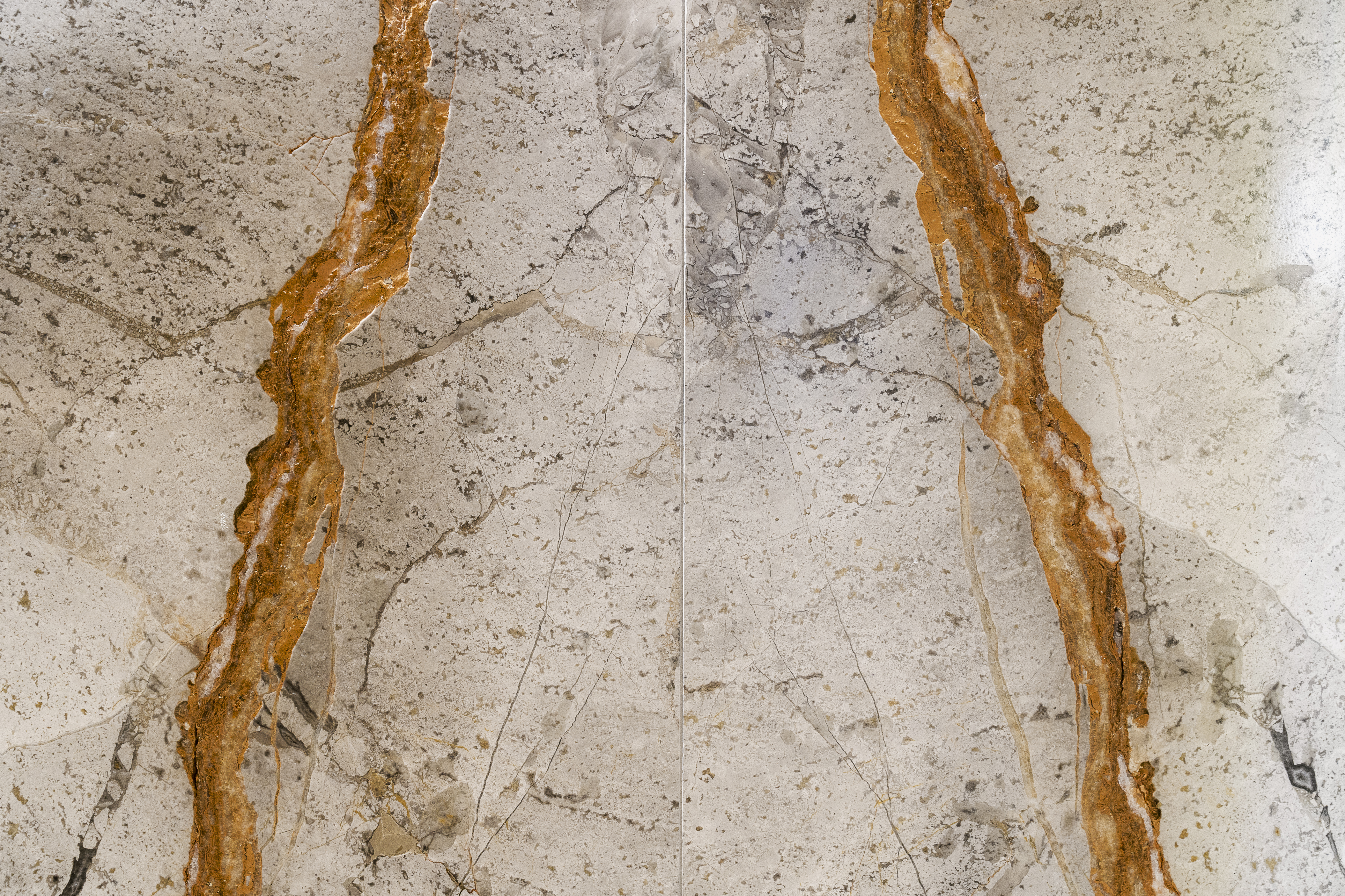 Nei bagni, le pietre naturali Antolini® contribuiscono a definire il carattere dell’area privata. Grey Roots, marmo della Natural Stone Collection proposto in finitura Lether, accompagna il legno asciato con una tonalità equilibrata, creando superfici morbide alla vista e piacevoli al tatto. La venatura discreta introduce profondità senza interrompere l’armonia cromatica degli ambienti.