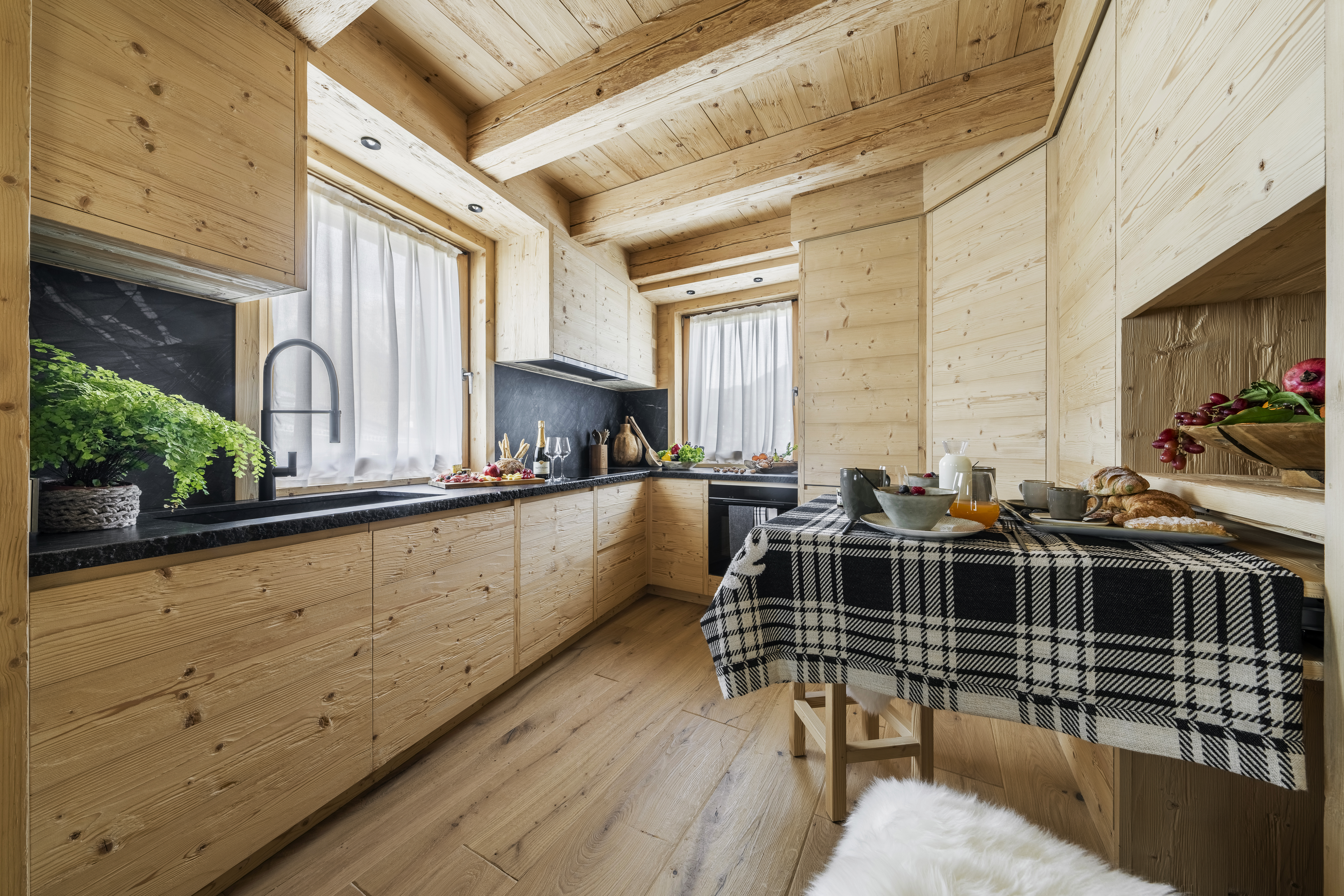 La residenza sorge tra i principali gruppi dolomitici, con cui ampie vetrate instaurano un dialogo costante, rendendo la luce e le montagne parte integrante dell’esperienza abitativa. Questo contesto amplifica la presenza del legno e valorizza le superfici lapidee poste in punti mirati.