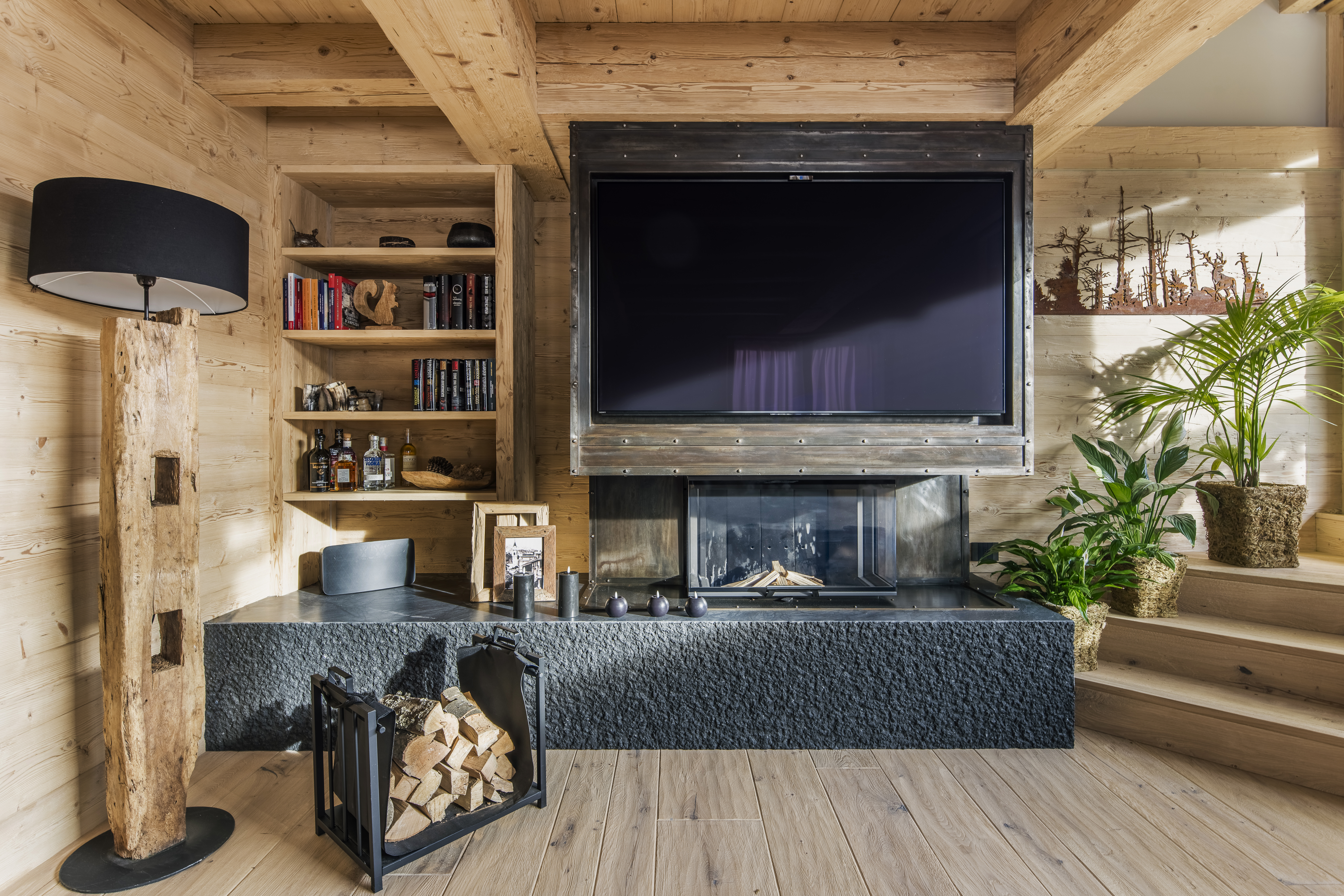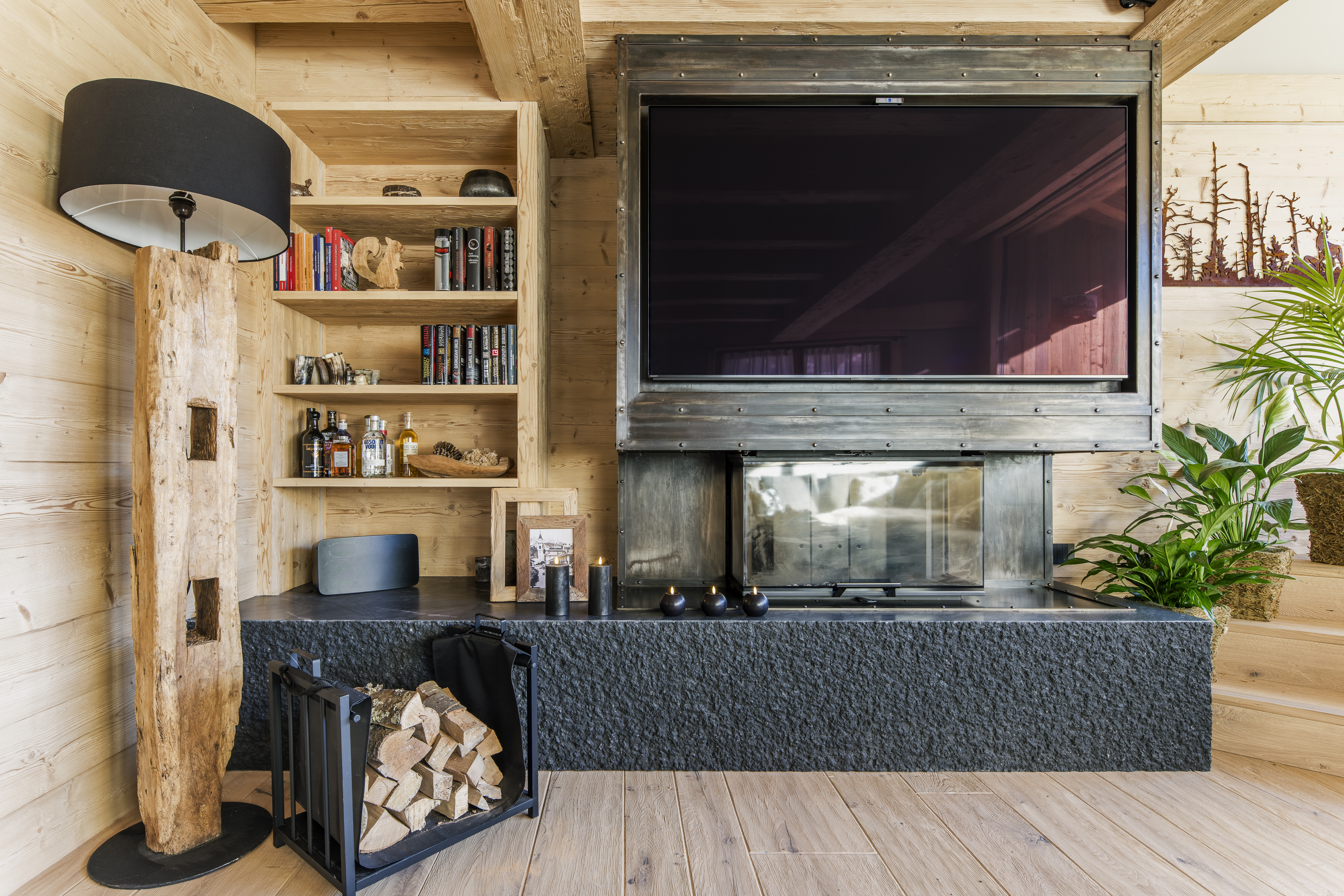 Il soggiorno trova il suo fulcro visivo nel camino contemporaneo, concepito come un blocco monolitico anch’esso in Quarzite Nera di Antolini®. Il fronte orizzontale è qui lavorato in finitura Hard Rock, parte della Textures+ Collection, che scolpisce la superficie con un pattern materico e irregolare capace di catturare la luce e amplificarne i contrasti. Il volume del camino si estende visivamente verso i tre gradini in legno che conducono al terrazzo, guidando lo sguardo alla grande vetrata sui picchi dolomitici. La tonalità intensa della pietra diventa un segno grafico che dialoga con l’elemento in ferro sovrastante destinato a racchiudere il televisore.