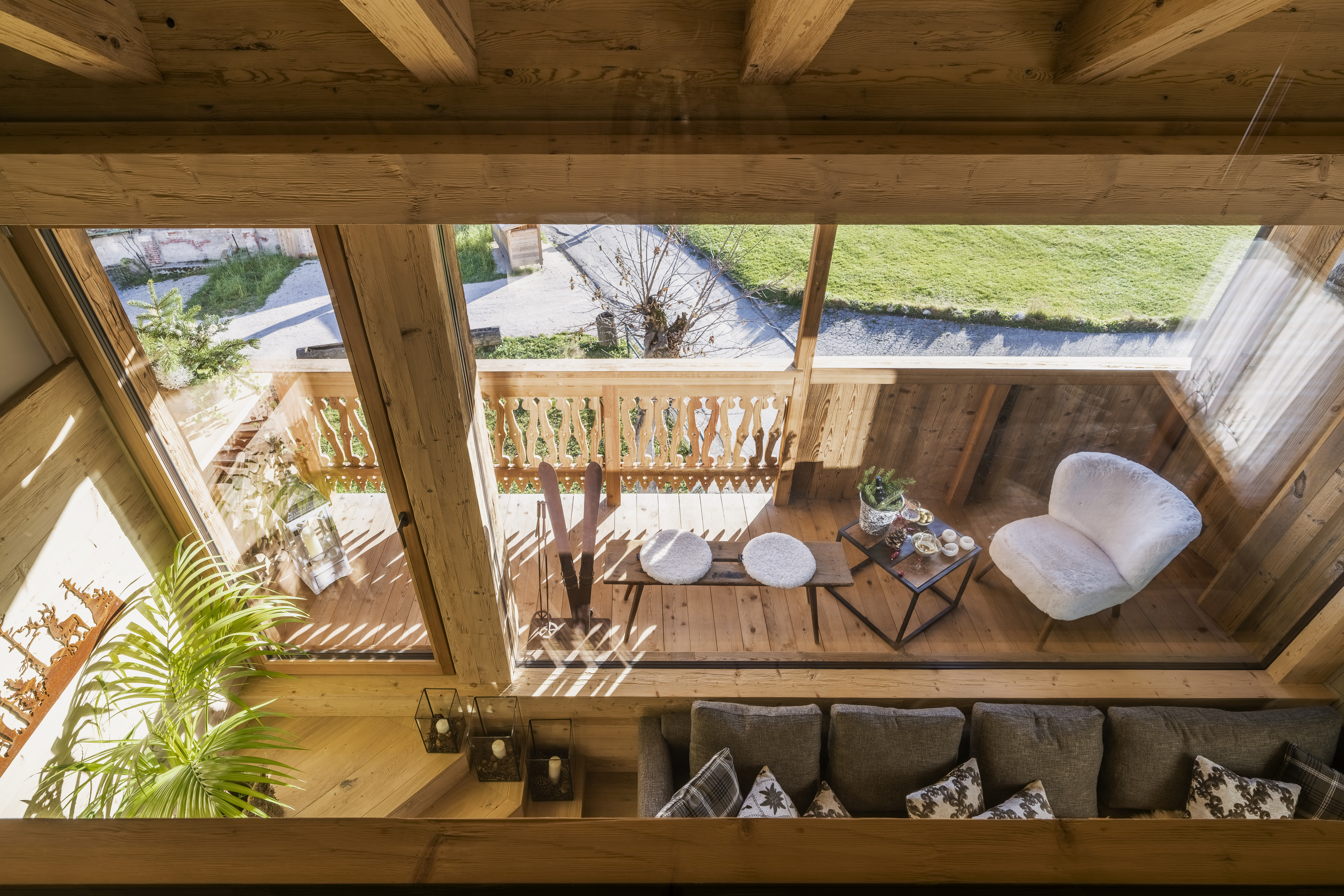 L’abitazione, che si sviluppa su circa duecento metri quadrati distribuiti su tre livelli, si raggiunge dal piano terra, dove un ingresso raccolto introduce immediatamente al percorso verticale. La scala in legno, pensata come elemento scenografico, conduce a un punto di sbarco dove una panchetta sartoriale con motivi alpini introduce al cuore della casa e accompagna il fluire degli ambienti. Attorno a questo fulcro si sviluppa la zona giorno: la sala da pranzo, velata da una gelosia in legno che crea un delicato effetto di “vedo-non vedo”, il soggiorno che si apre con naturalezza verso la grande vetrata affacciata sul paesaggio, e gli spazi più raccolti — guardaroba, bagno di cortesia e camera guest con bagno en suite — collocati in posizione discreta per preservare intimità e funzionalità.