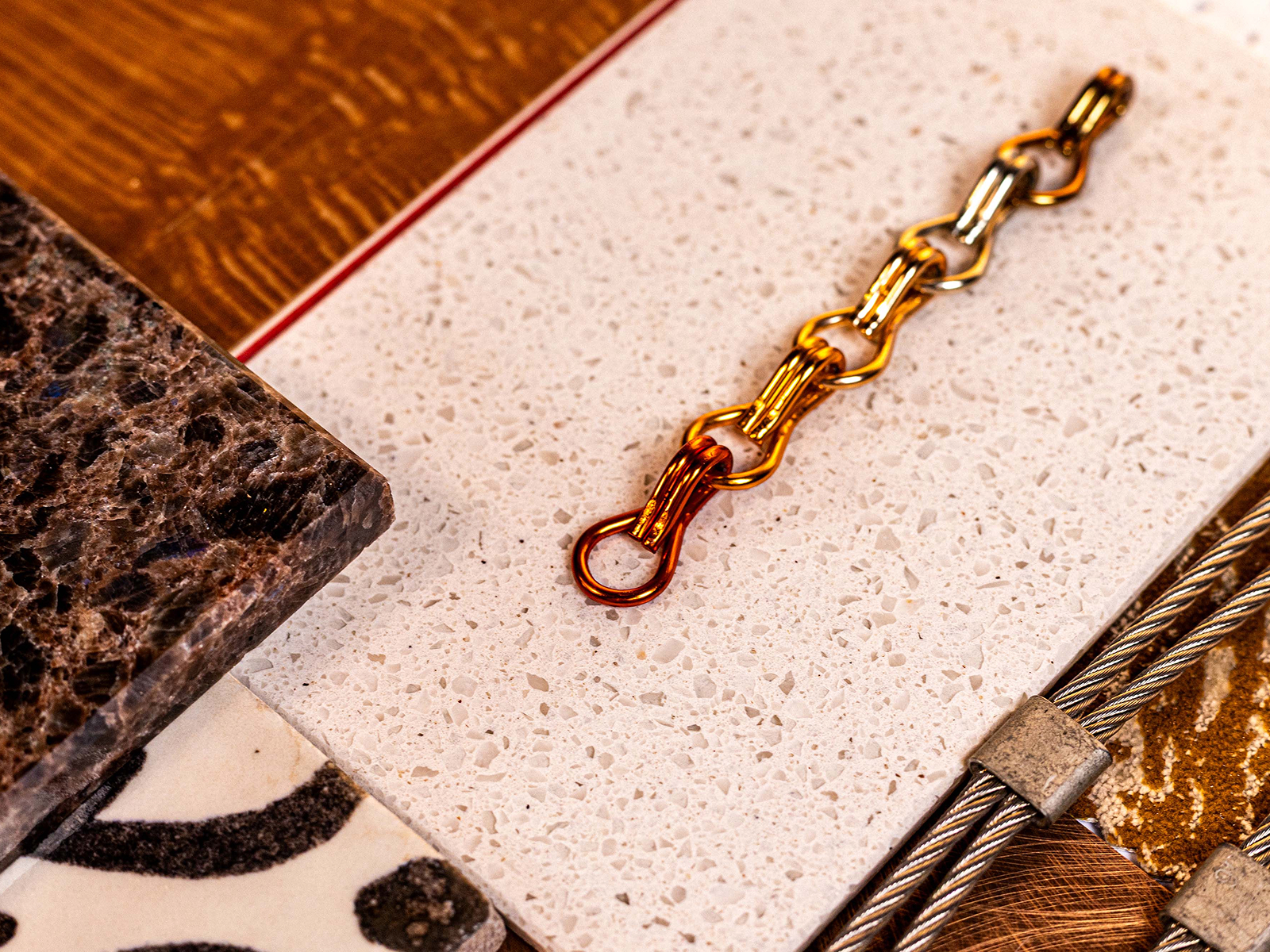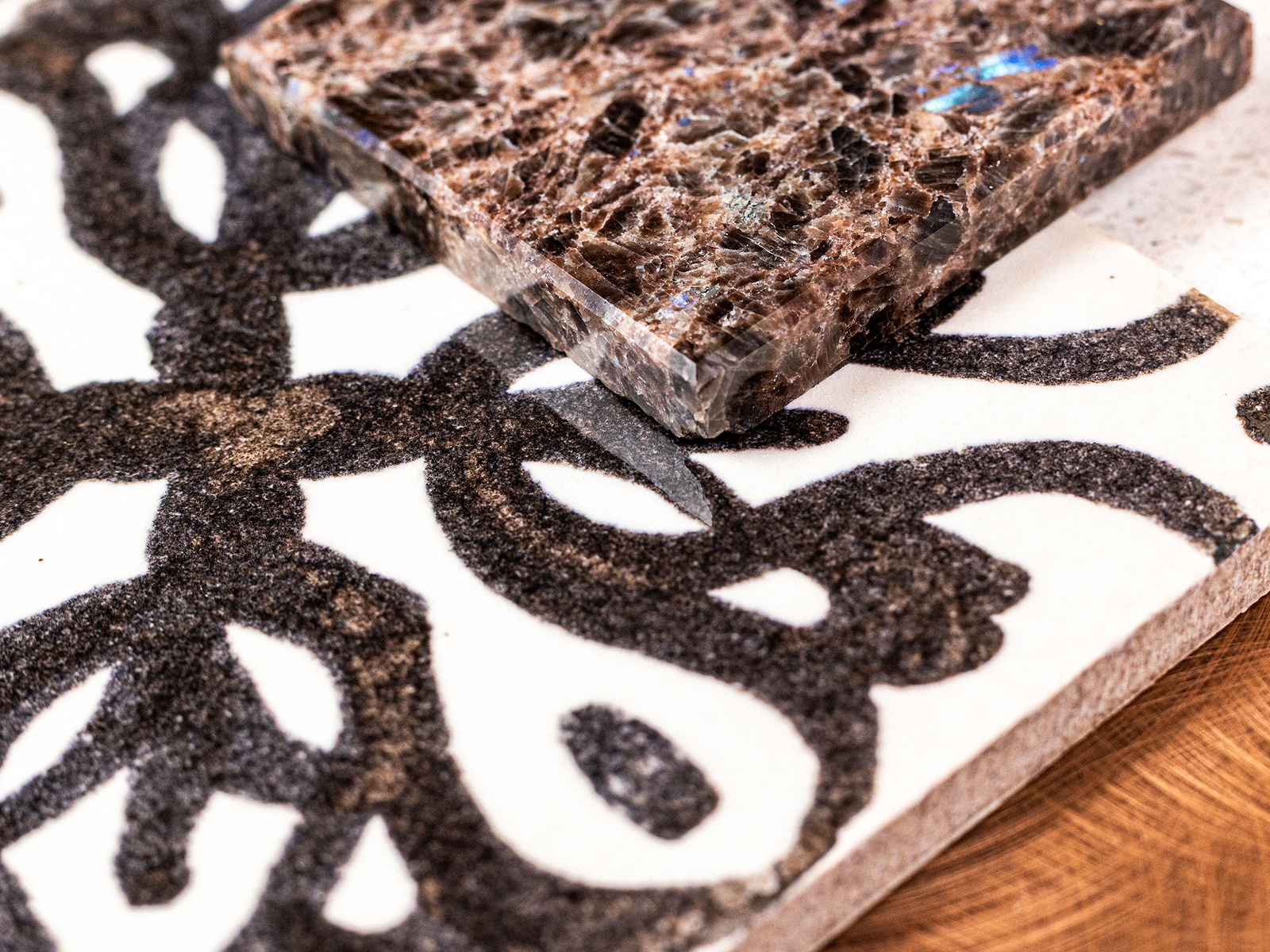 Nella selezione, ceramiche lucide, vetri riflettenti, finiture metalliche e laminati brillanti svelano il loro potenziale attraverso la profondità delle superfici e sottili variazioni tonali. Le pietre levigate reagiscono alla luce con nuance mutevoli, mentre le texture iridescenti richiamano l’intelligenza materica degli interni stratificati di Carlo Scarpa, dove dettaglio e luce orchestrano il movimento nello spazio. I metalli ad alta brillantezza introducono precisione e ritmo, evocando l’uso disciplinato di ottone, acciaio inox e alluminio anodizzato negli spazi retail e hospitality contemporanei, dalle boutique di moda alle gallerie.