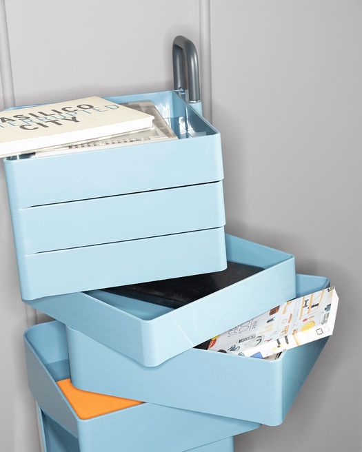 Spinny è dotata di una serie di cassetti in ABS stampato a iniezione, disponibili in tre diverse altezze (6, 9 e 12 cm) che consentono un’ampia configurazione della capienza e ruotano fino a 180° con lo stesso movimento a ventaglio che caratterizza il carrello-contenitore Boby.