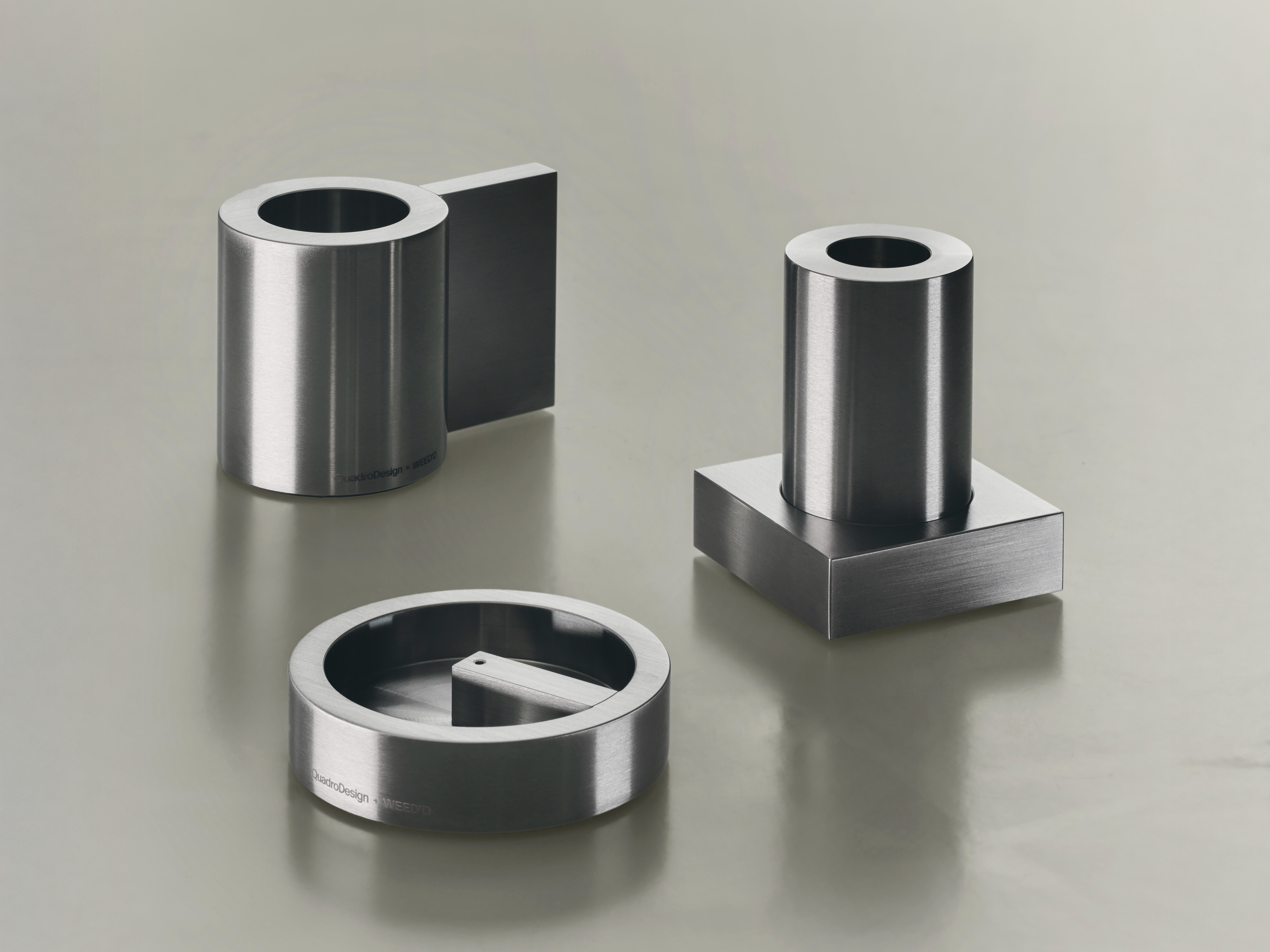 La collezione mette in relazione la precisione dei volumi geometrici in acciaio lavorato a controllo numerico con una dimensione più calda, intima e meditativa. I tre oggetti si presentano come piccole architetture domestiche, pensate per incorniciare ed elevare i momenti di relax e cura di sé stessi, in continuità con i valori che da sempre guidano Weed’d e che QuadroDesign interpreta attraverso il linguaggio solido e contemporaneo dell’acciaio.