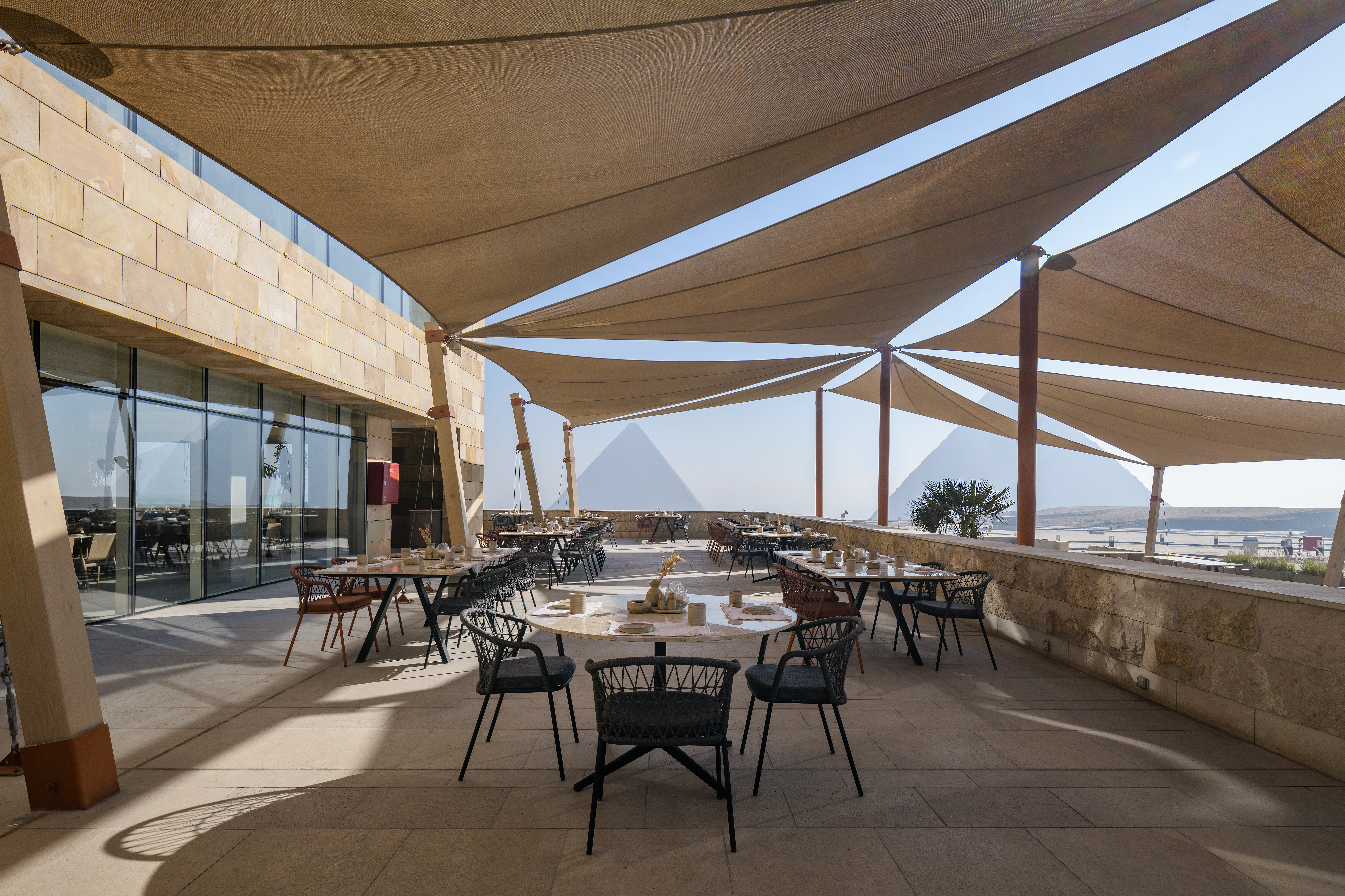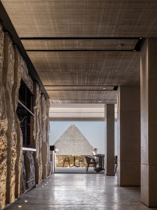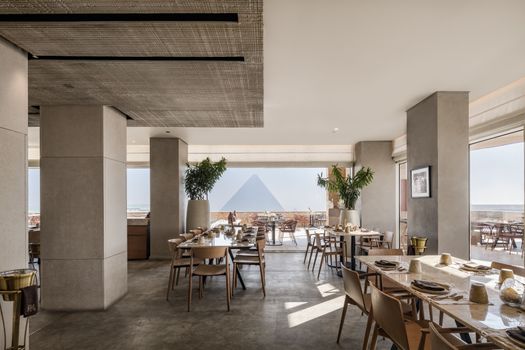 L’architettura contemporanea, realizzata in pietra arenaria, si integra perfettamente in questo suggestivo contesto, al punto che sembra quasi emergere dalla sabbia che la circonda. Una palette cromatica neutra caratterizza e definisce gli spazi che scandiscono la struttura: in questo modo l’attenzione viene convogliata su uno dei tesori più preziosi della storia, le maestose piramidi di Giza, che si possono ammirare da una prospettiva unica e ravvicinata mentre si gusta un piatto tipico della tradizione locale.