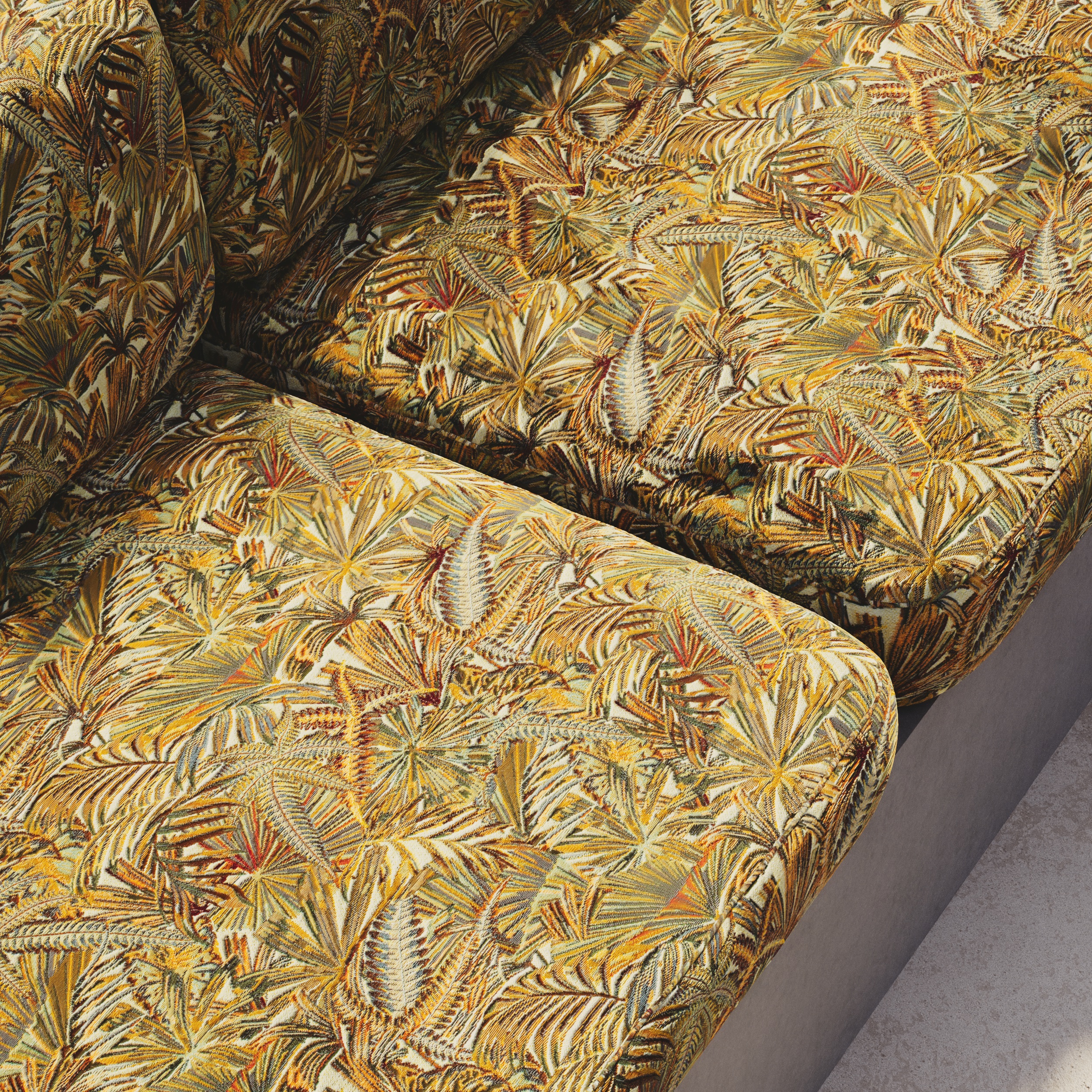 Tessuto in materiale morbido effetto lino, SOMBRERO si ispira al sole e alle sue ondulazioni. I motivi stilizzati ricordano il calore di un pomeriggio tropicale, quando la luce dorata si riflette su muri e tessuti.