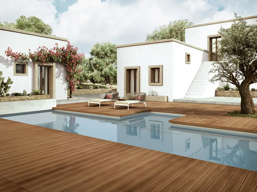 Le doghe possono essere posate da entrambe i lati e possono rivestire sia superfici orizzontali che verticali, permettendo di realizzare camminamenti, terrazze, plateatici, pareti divisorie, bordi piscina e rooftop.