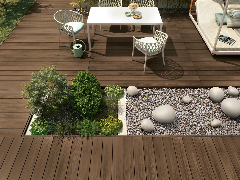 I pavimenti outdoor Woodco della collezione Externo sono realizzati con un materiale composito ottenuto da farine di legno e polietilene riciclato ad alta densità e sono una proposta ecologica e sostenibile, la cui sicurezza in termini di salubrità ed emissioni è stata certificata da laboratori italiani accreditati.