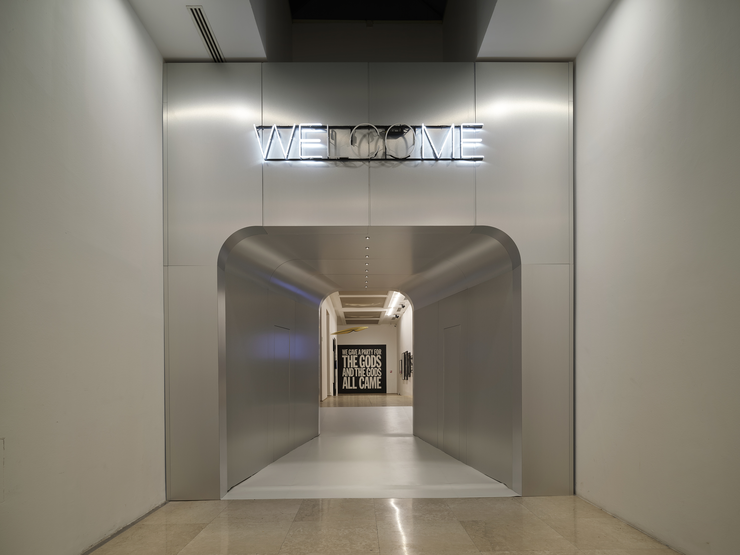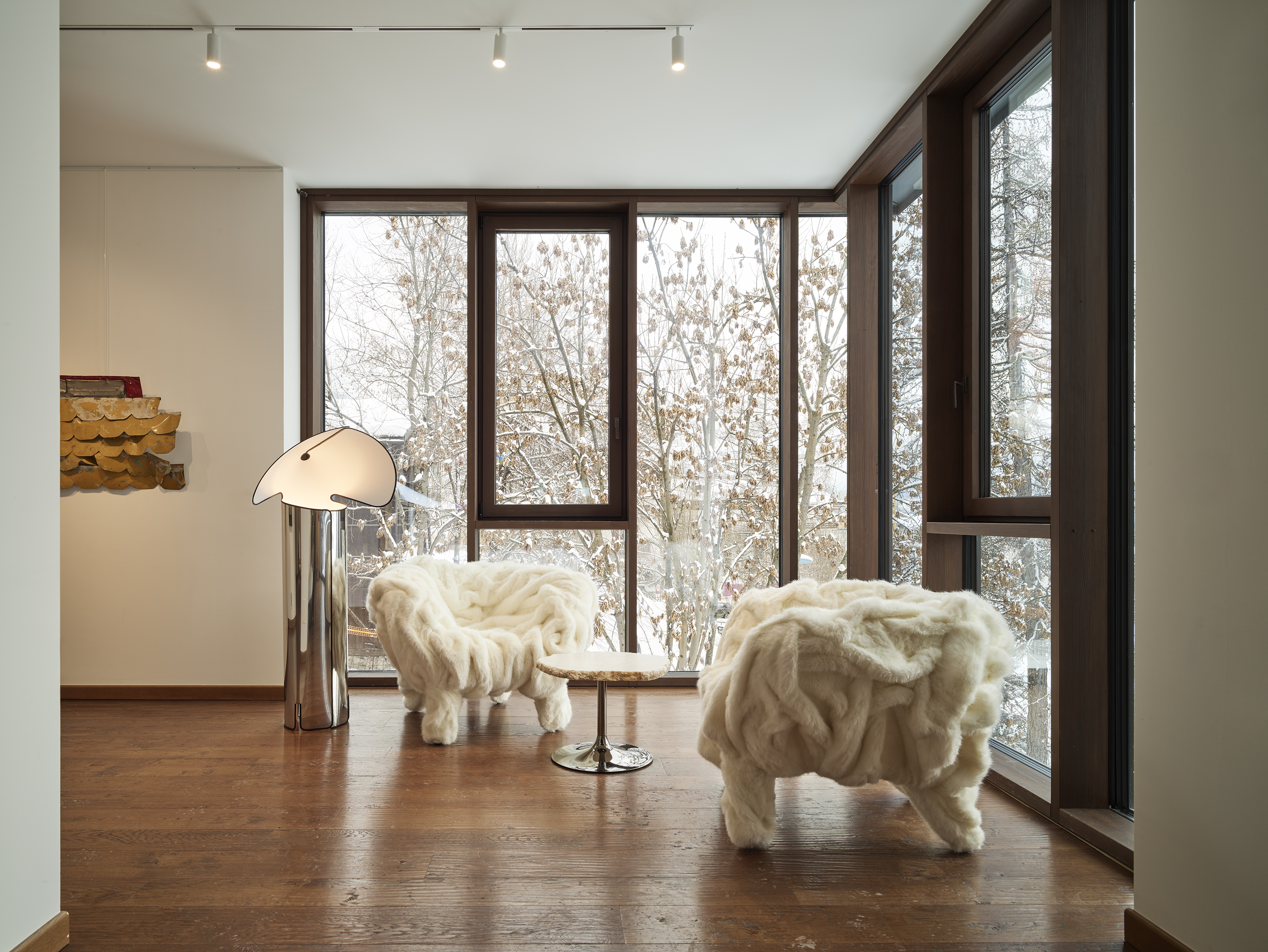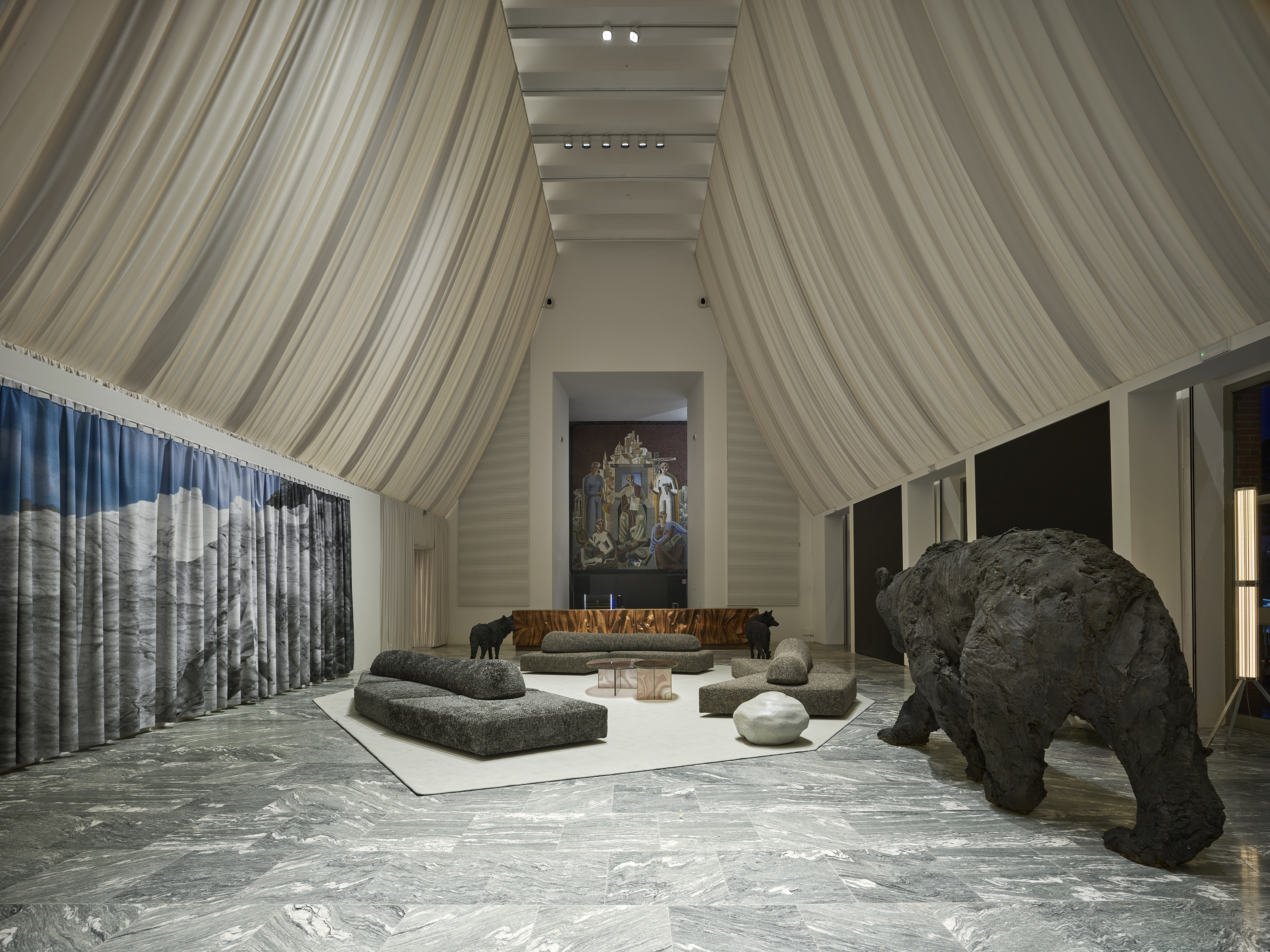 A Milano, il progetto architettonico e di design assume un carattere concettuale, proponendo una lettura astratta della montagna come musa. Nel Salone d’Onore — spazio monumentale alto quasi 12 metri — l’intervento ridefinisce il volume attraverso drappeggi tessili e superfici inclinate che evocano le pendici della montagna. Il bianco, scelto come colore dominante, rafforza questo immaginario richiamando la luce, la neve e la dimensione rarefatta dell’alta quota, trasformando l’ambiente in uno spazio astratto, immersivo e fortemente luminoso. Qui le opere di Pablo Atchugarry, Stefano Cerio, Mario Merz, Alessandro Piangiamore, Laura Pugno e Davide Rivalta restituiscono la forza del paesaggio alpino, luogo fisico e mentale in cui natura e azione umana si incontrano.