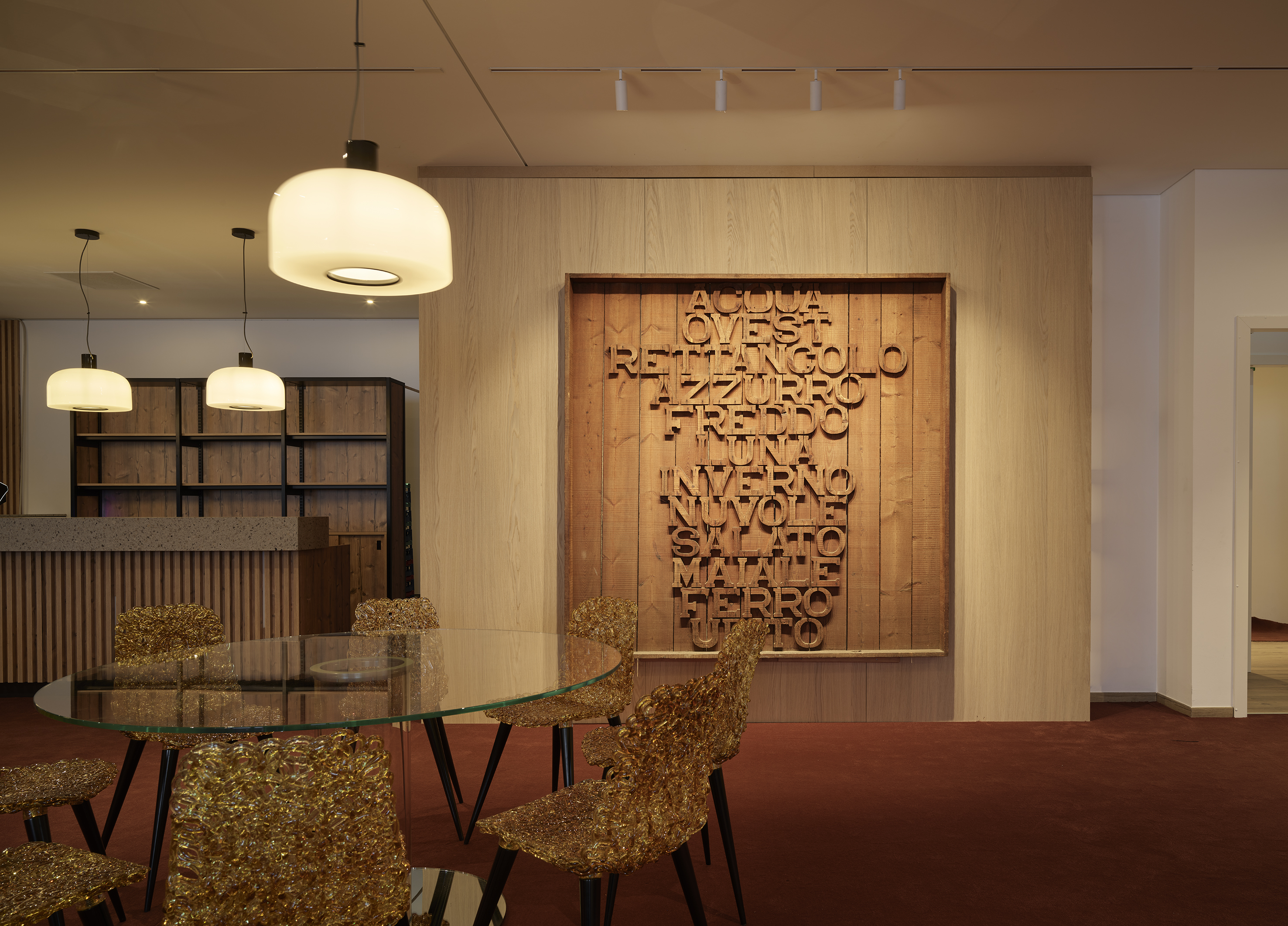 Anche nel progetto di interior design, la montagna come MUSA assume una duplice valenza: da un lato come paesaggio, con i suoi minerali, i legni e i riflessi; dall’altro come atmosfera calda e avvolgente propria degli ambienti alpini. Questo doppio filo conduttore attraversa le tre sedi, declinandosi in modo specifico in ciascuna di esse e costruendo, in sinergia con il progetto complessivo – in cui ogni contributo è parte di un unico sistema – un paesaggio interno distinto ma coerente per ognuno degli spazi.