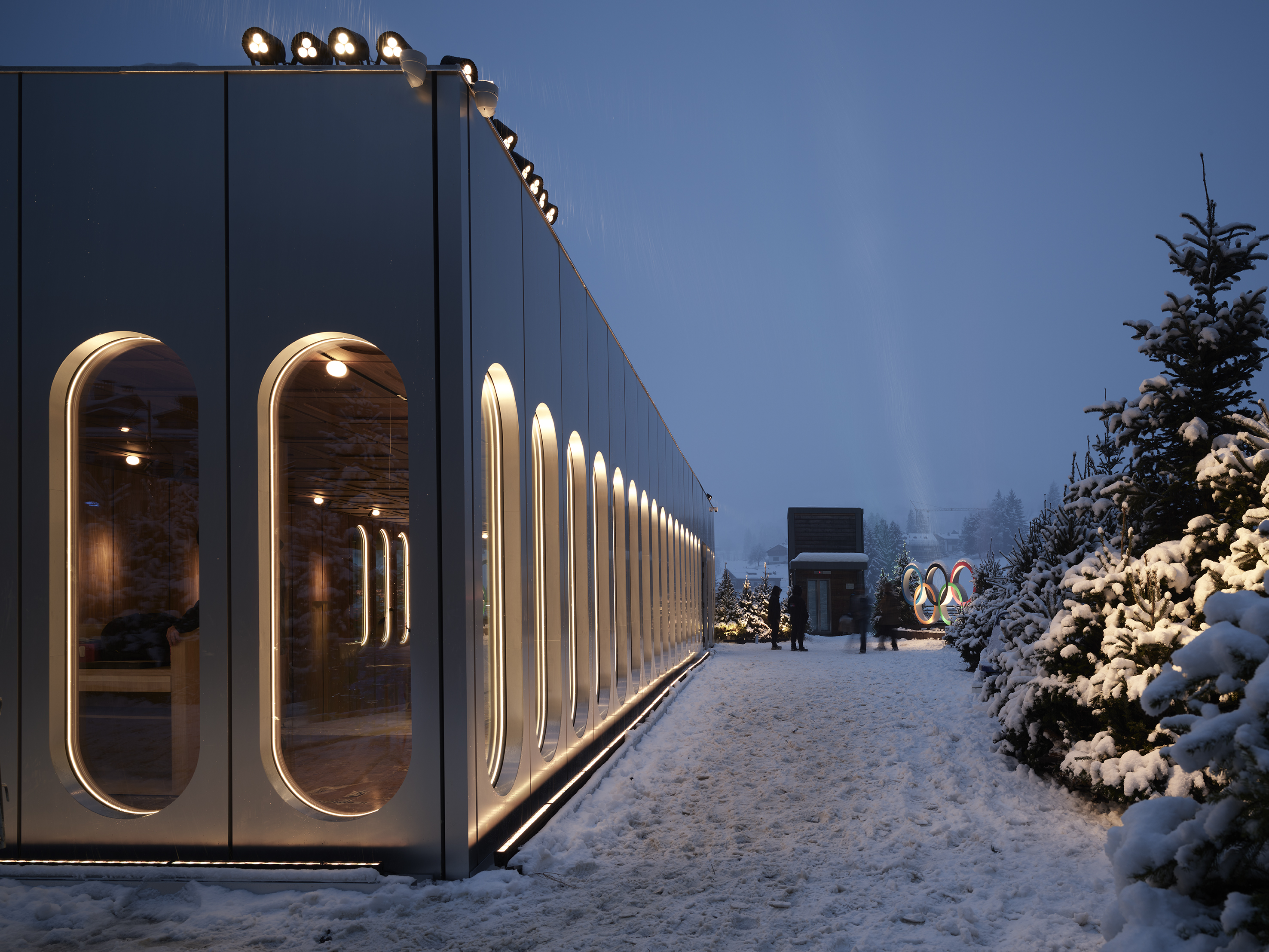 Casa Italia a Cortina d’Ampezzo ha scelto la sede di Farsettiarte, aperta nel 2020 a seguito di un progetto che ha convertito in spazio espositivo la stazione di partenza della vecchia funivia che univa il Belvedere a Pocol. L’intervento architettonico integra la struttura esistente con un padiglione temporaneo affacciato sulla piazza, concepito come spazio dedicato agli atleti e ai momenti di celebrazione. Portale d’ingresso e padiglione, realizzati con elementi modulari prefabbricati, richiamano il concept del bivacco e rispondono a criteri di sostenibilità e reversibilità.