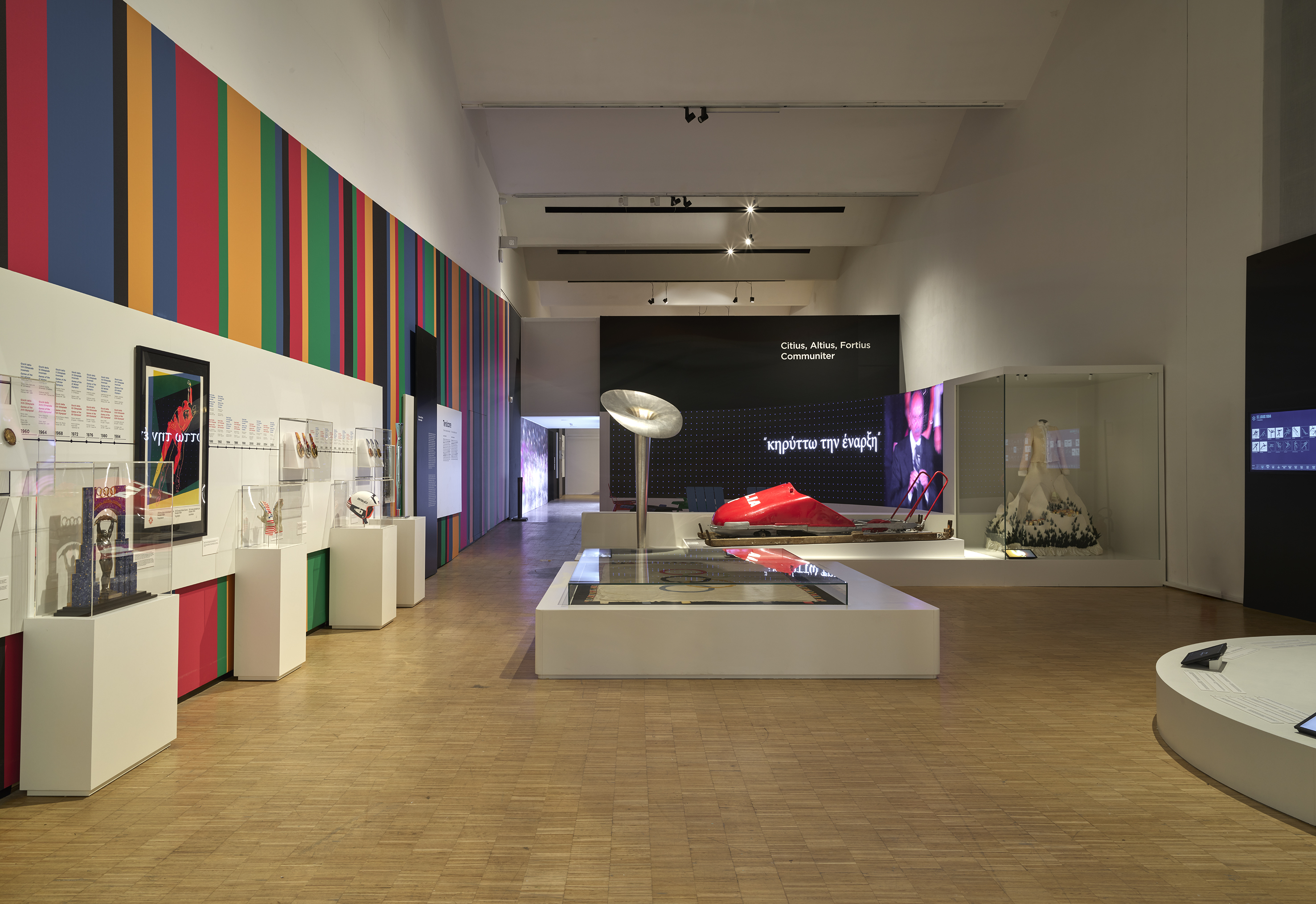 Negli spazi di Triennale Milano il percorso espositivo si articola in nove sezioni, ciascuna dedicata alla musa ispiratrice di una disciplina: linguaggio, architettura, arti figurative, paesaggio, gusto, musica, arte drammatica, innovazione e sport. La rappresentazione di ogni musa è affidata a un oggetto iconico delle Olimpiadi proveniente dal Museo Olimpico situato in Svizzera nella città di Losanna, sottolineando come i valori espressi siano condivisi e promossi dal Movimento Olimpico.