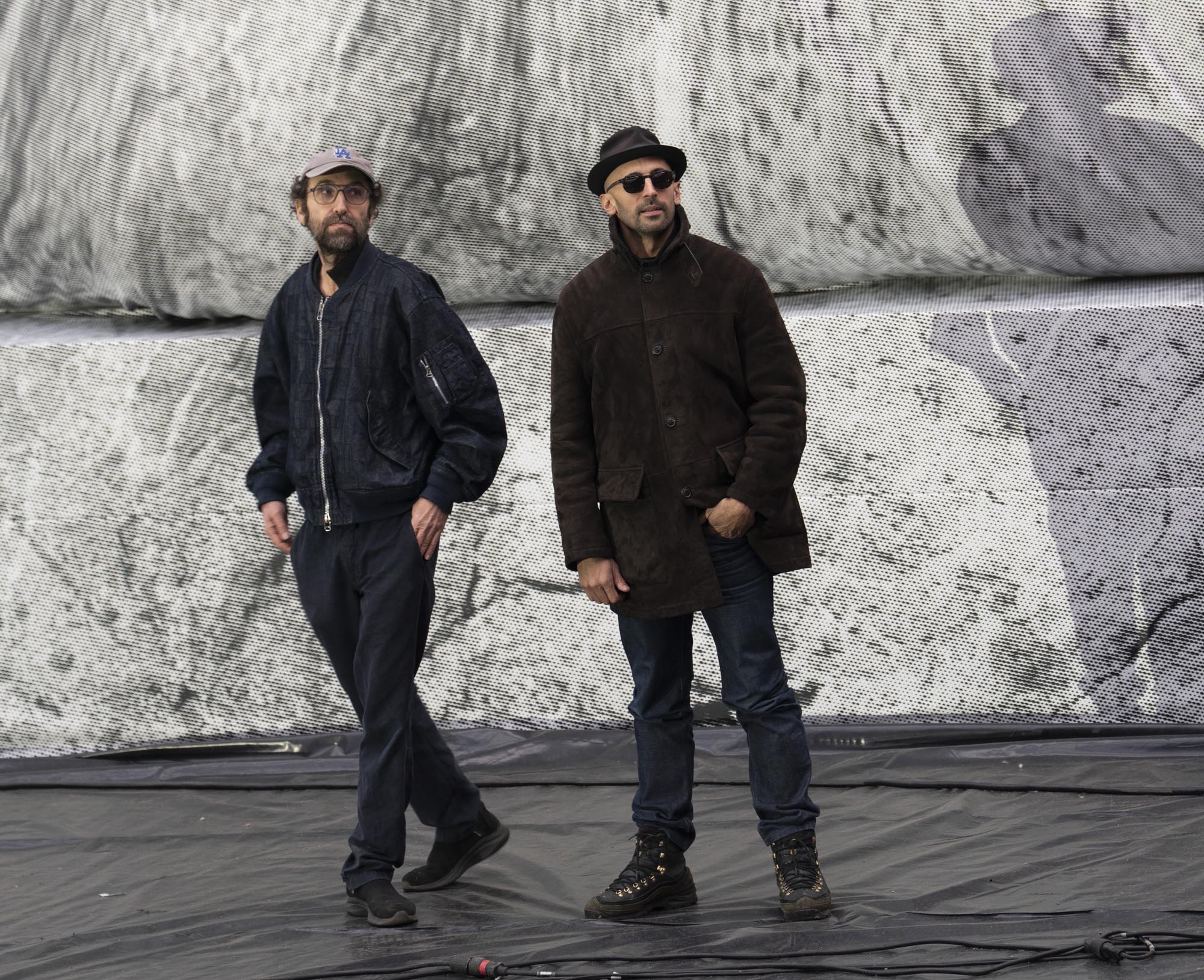 JR and Thomas Bangalter at the life-size test for La Caverne du Pont Neuf, Orly, January 2026 - Photo: Eléa Jeanne Schmitter, © 2026 Atelier JR
