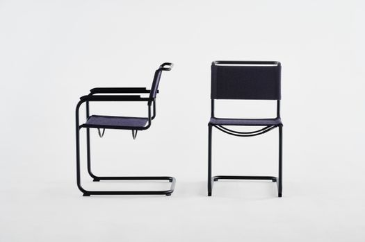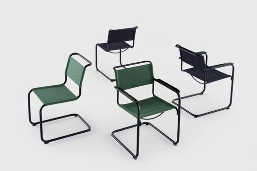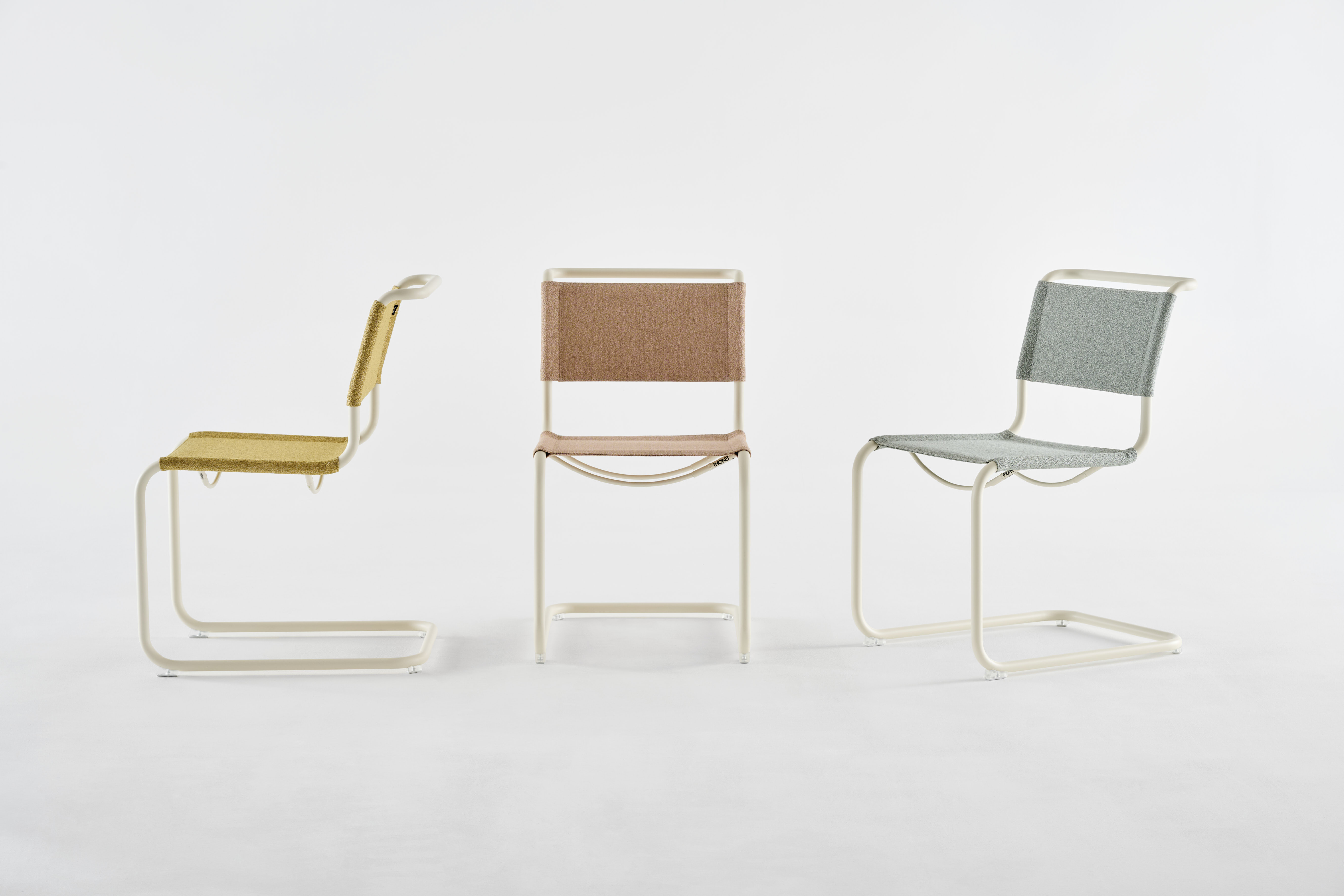 Il rivestimento tessile delle sedie cantilever S 33 e S 34 “Soft” richiama le origini di questi classici degli anni ‘20 del 1900 perché le prime sedute in tubolare d’acciaio erano, spesso, rivestite con il cosiddetto eisengarn, oltre che con altri materiali quali cinghie di canapa, tappetini in gomma, paglia di Vienna o cuoio.