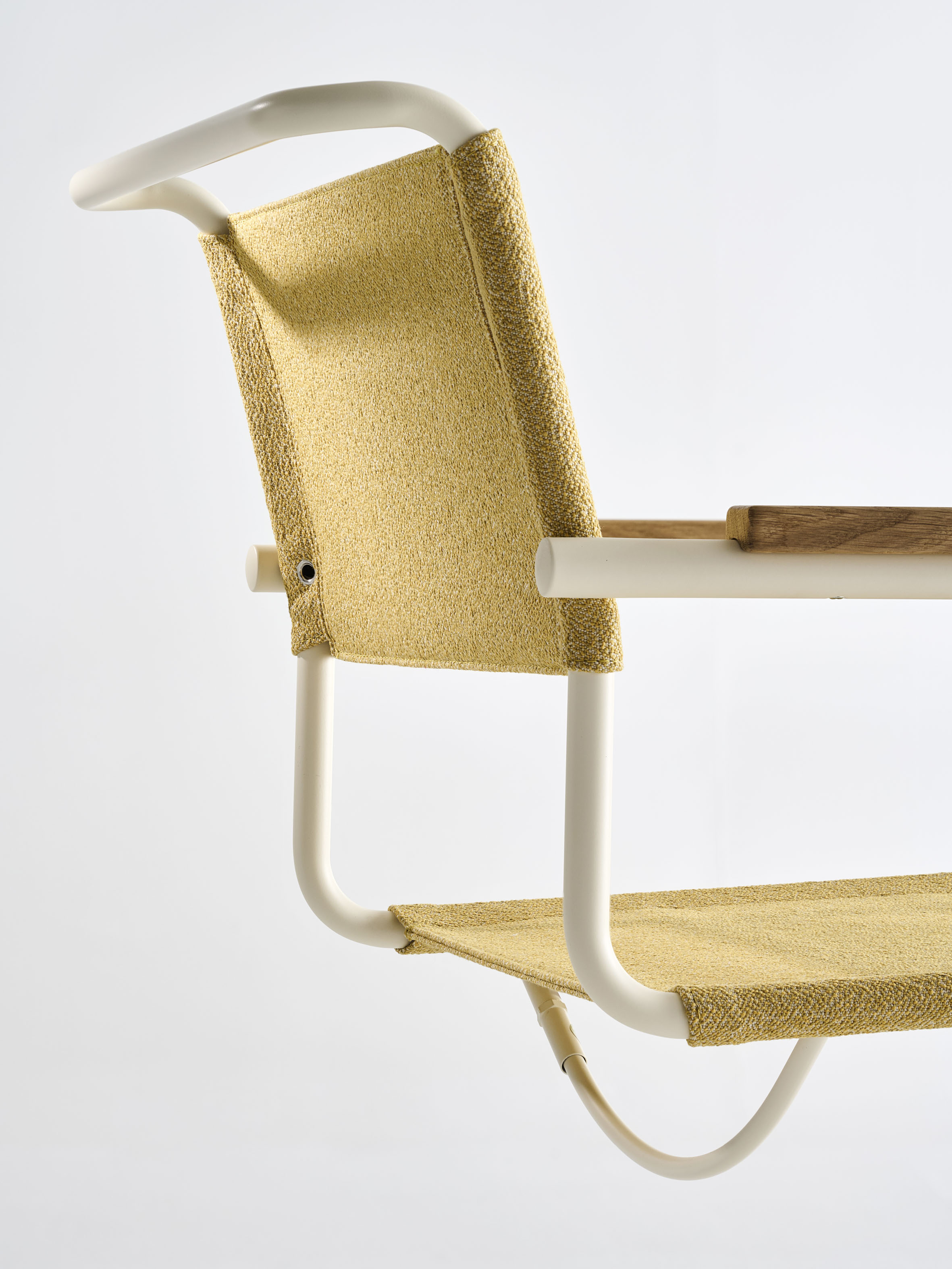 L’eisengarn (Eisengarn = ferro filato), utilizzato per la prima volta da Marcel Breuer, non conteneva ferro, ma deve il suo nome alla resistenza del tessuto. Sviluppato già nel XIX° secolo e prodotto utilizzando un filo di cotone ritorto più volte trattato secondo un procedimento speciale. Nel Bauhaus, la tessitrice Margaretha Reichardt lo perfezionò perché potesse essere utilizzato per rivestire le sedute. Inseriti sul telaio in tubolare d’acciaio molleggiato, la seduta e lo schienale dovevano essere in grado di sopportare una maggiore trazione e pressione. I rivestimenti originali dell’epoca, infatti, si sono conservati e dimostrano senza ombra di dubbio che l’epoca moderna sapeva usare il colore, con rivestimenti rossi, blu, gialli, verdi o beige, in parte in contrasto con i telai in tubolare verniciato in diverse tonalità cromatiche.