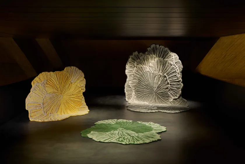 Le forme e le texture organiche della vegetazione ispirano Botanica di Gan, un tappeto con motivi a rilievo composto da strutture intricate, curve morbide ed elementi stratificati che donano profondità al tessuto.