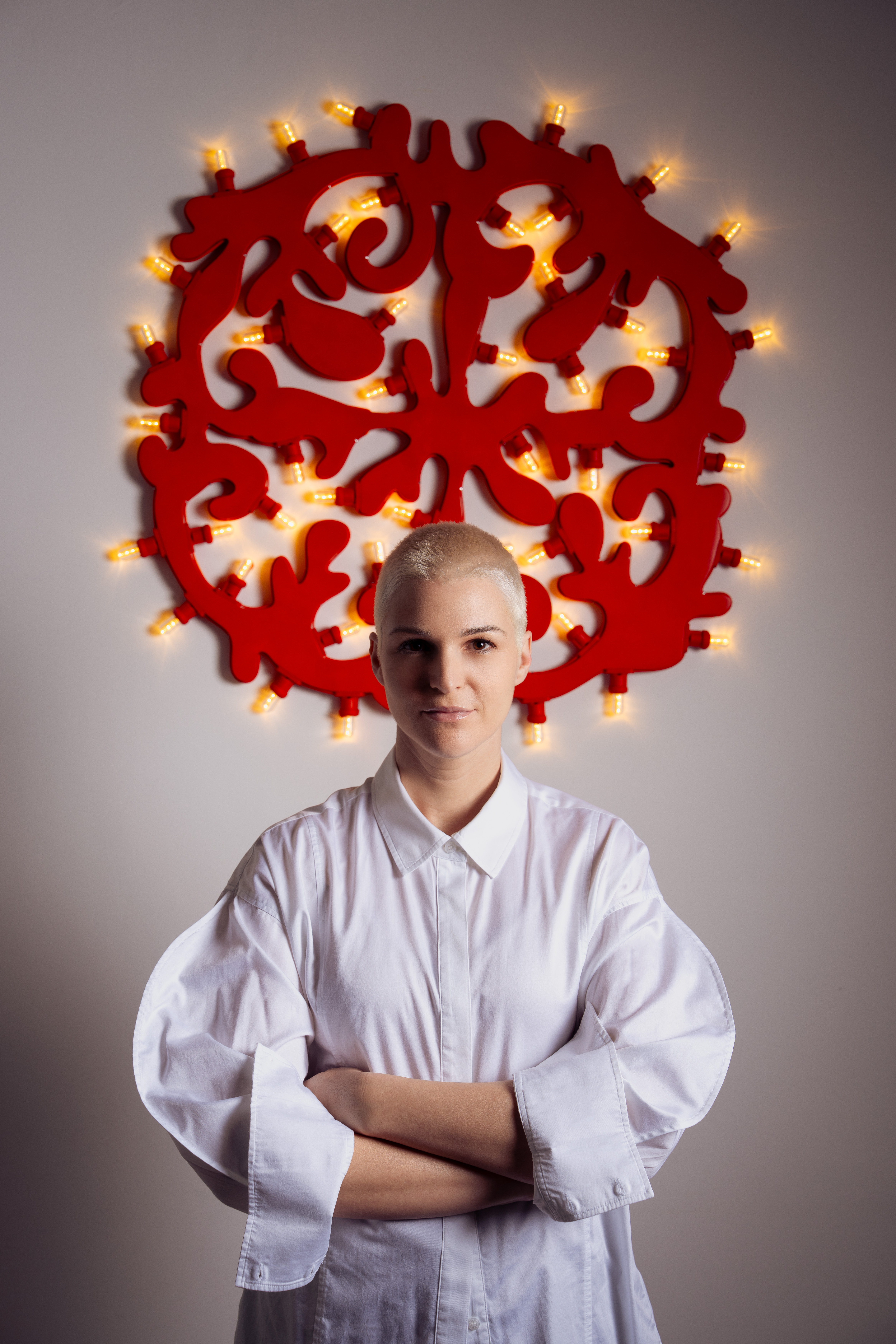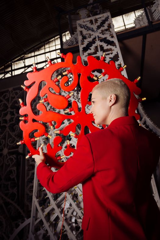 La luminaria prende la forma di un ricamo di luce, una trama di segni rossi attraversati da sfumature calde, dove le lampadine diventano parte integrante del disegno. Sono loro a tracciare la forma del rosone, una grafia luminosa che scandisce la sua geometria. Antonio Aricò le definisce “presenze naturali, quasi sacre”, e c'è qualcosa di rituale nel modo in cui la luce costruisce la forma.