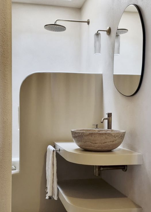 Gli elementi naturali si fondono armoniosamente con l'ambiente, mentre l'uso della pietra aggiunge un tocco di rusticità e autenticità. I colori della terra avvolgono gli spazi, creando un’atmosfera calda e accogliente.