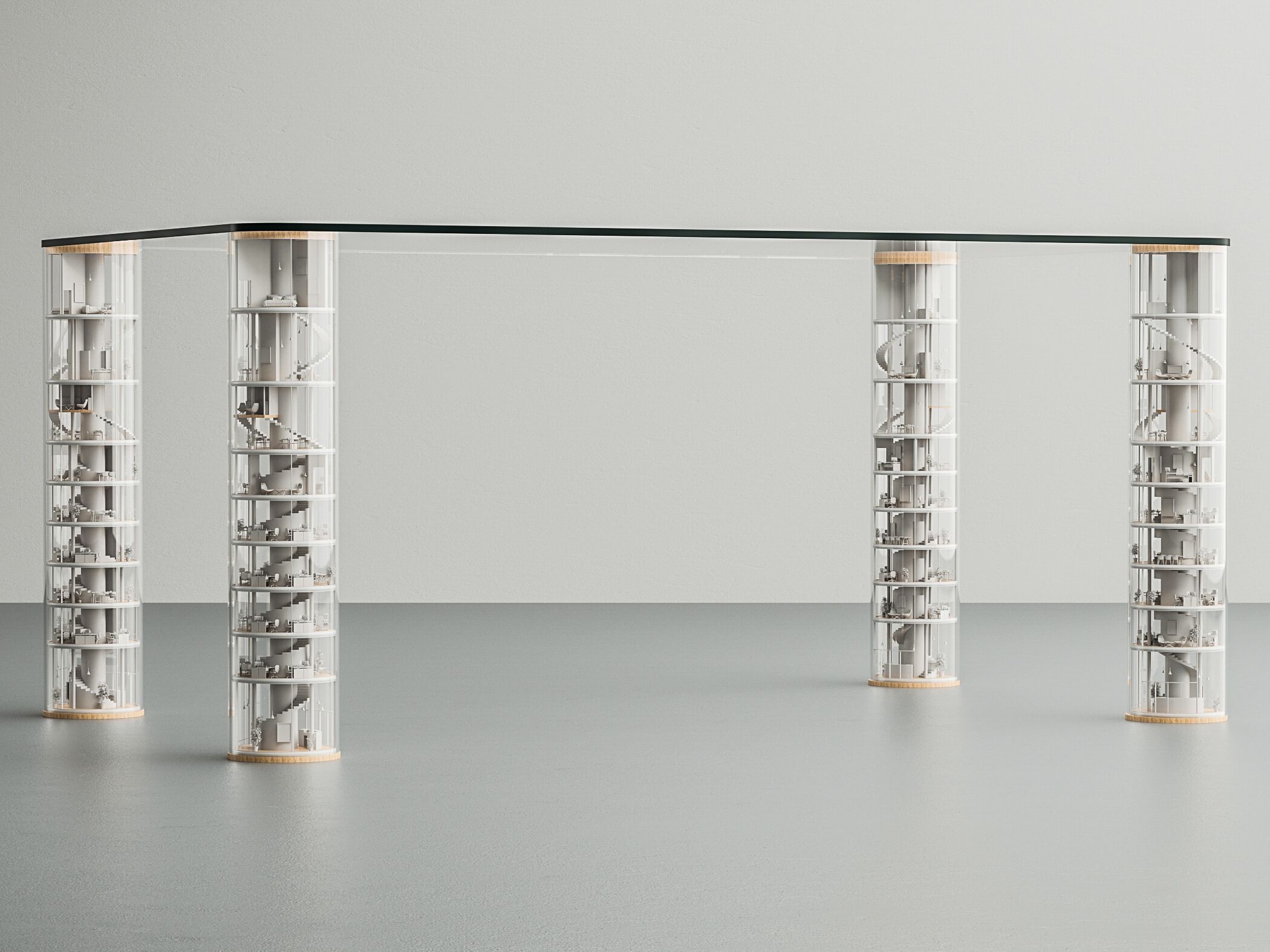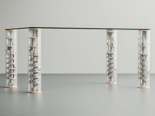 A metà tra galleria d’arte e laboratorio artigianale, il brand LO Contemporary dà vita a pezzi unici e scultorei pensati per il collezionismo. Ne è un esempio il tavolo Tokyo Sky, ispirato alle microabitazioni tipiche del Giappone. Il progetto nasce dall’incontro di diverse tecniche artigianali — lavorazione al tornio, stampa 3D, colata di resina e intaglio a mano — che convivono in un unico oggetto. Le quattro gambe, cilindri completamente trasparenti, custodiscono al loro interno minuscole riproduzioni di living contemporanei, arredati con cura minuziosa in ogni dettaglio.