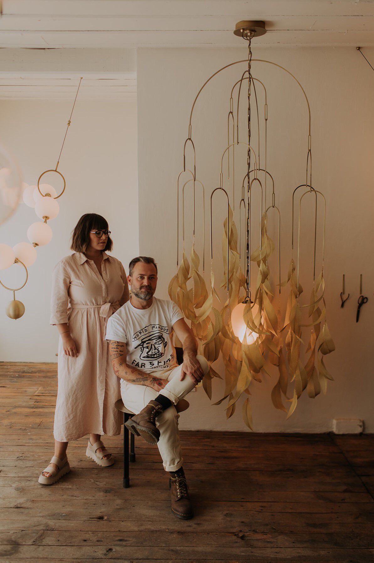 Lampade concepite come oggetti d’arte, pezzi unici e senza tempo dove ogni dettaglio è risultato di un meticoloso lavoro artigianale: così nascono le lampade Larose Guyon, studio canadese fondato nel 2014 da Audrée L. Larose e Félix Guyon. La sospensione Saule si ispira alla delicatezza del salice: foglie di ottone modellate a mano e appese ad archi metallici, riflettono la luce come il luccichio del fogliame dell'albero che ondeggia dolcemente nella brezza. Al centro della lampada si trova un globo di vetro leggermente rosato, che, come un frutto sospeso tra i rami dell'albero, emette una luce morbida e calda. L'intera struttura si muove leggermente con l'aria, creando un'atmosfera eterea e rilassante.