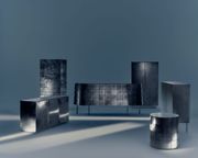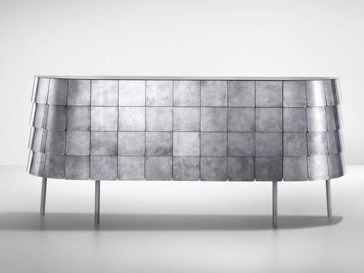 Come le lamine in metallo identificano le corazze dei samurai, così le scaglie sul mobile contenitore Yoroi di De Castelli ne connotano l’aspetto. Una forma dinamica gioca tra l’essenzialità dell’ellisse e la ripetizione del modulo, in equilibrio tra minimalismo ed eclettismo. Continuando a sperimentare sulle ossidazioni del metallo, De Castelli presenta una nuova finitura su acciaio inox in Limited Edition: DeIridium esplora la dimensione più pura della lucentezza, evocando la profondità e la riflessione di uno specchio d’acqua illuminato.