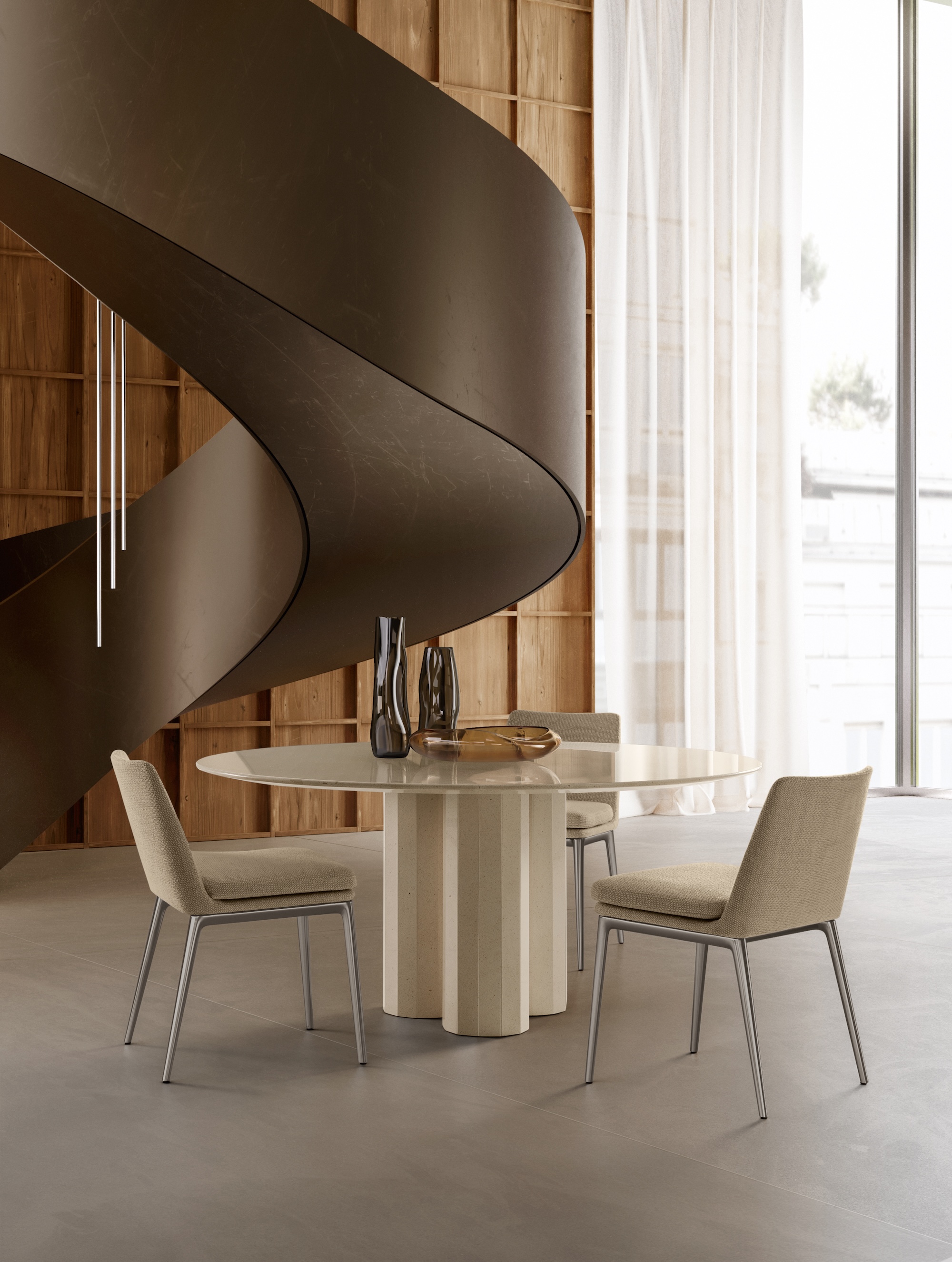 Se Talenti Outdoor è storicamente caratterizzato da famiglie di prodotto articolate e modulari, Talenti Home si compone di pezzi unici, pensati come presenze distintive all’interno dello spazio. Gli arredi nascono da un approccio progettuale unitario, in cui uno stesso progetto viene declinato sia per l’indoor sia per l’outdoor, mantenendo coerenza formale, identità e linguaggio, pur rispondendo a esigenze d’uso e contesti differenti. Come strumenti di un’orchestra, i singoli elementi dialogano tra loro all’interno di un sistema armonico, pur conservando una forte personalità.