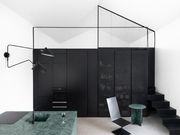 All’interno, il progetto cambia registro e si affida a un racconto più deciso, costruito sul contrasto tra pieni e vuoti, opacità e trasparenze. Protagonista dello spazio è il ferro, impiegato per realizzare una grande parete filtro attrezzata che attraversa l’ambiente come un vero elemento architettonico autonomo. Dietro la superficie traforata trovano posto la cucina, la dispensa e la scala che conduce al soppalco: le funzioni tecniche non vengono nascoste, ma diventano parte integrante della composizione. Questo diaframma non separa, ma organizza, filtra la luce, suggerisce profondità e costruisce nuove prospettive, diventando il fulcro spaziale della casa.